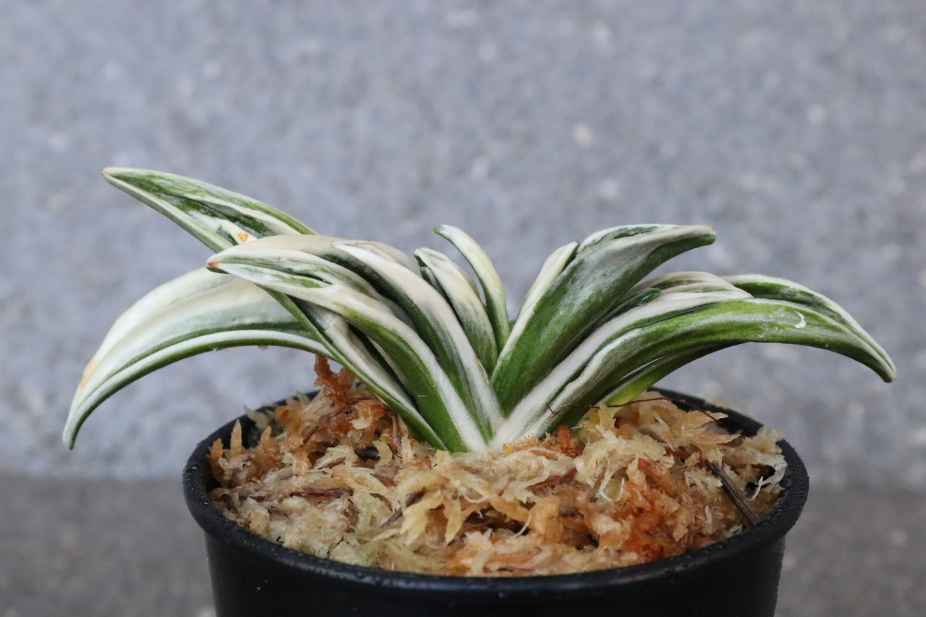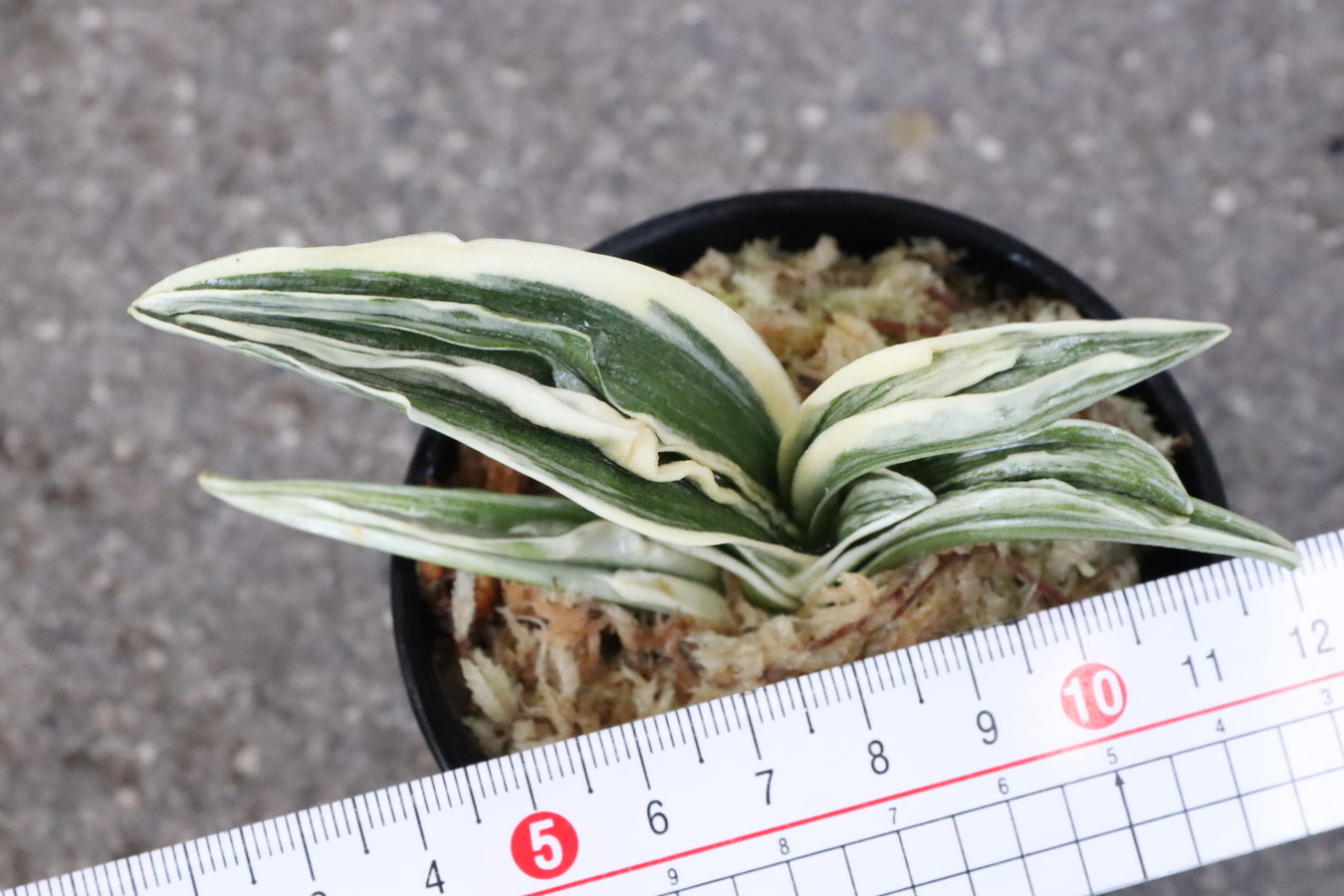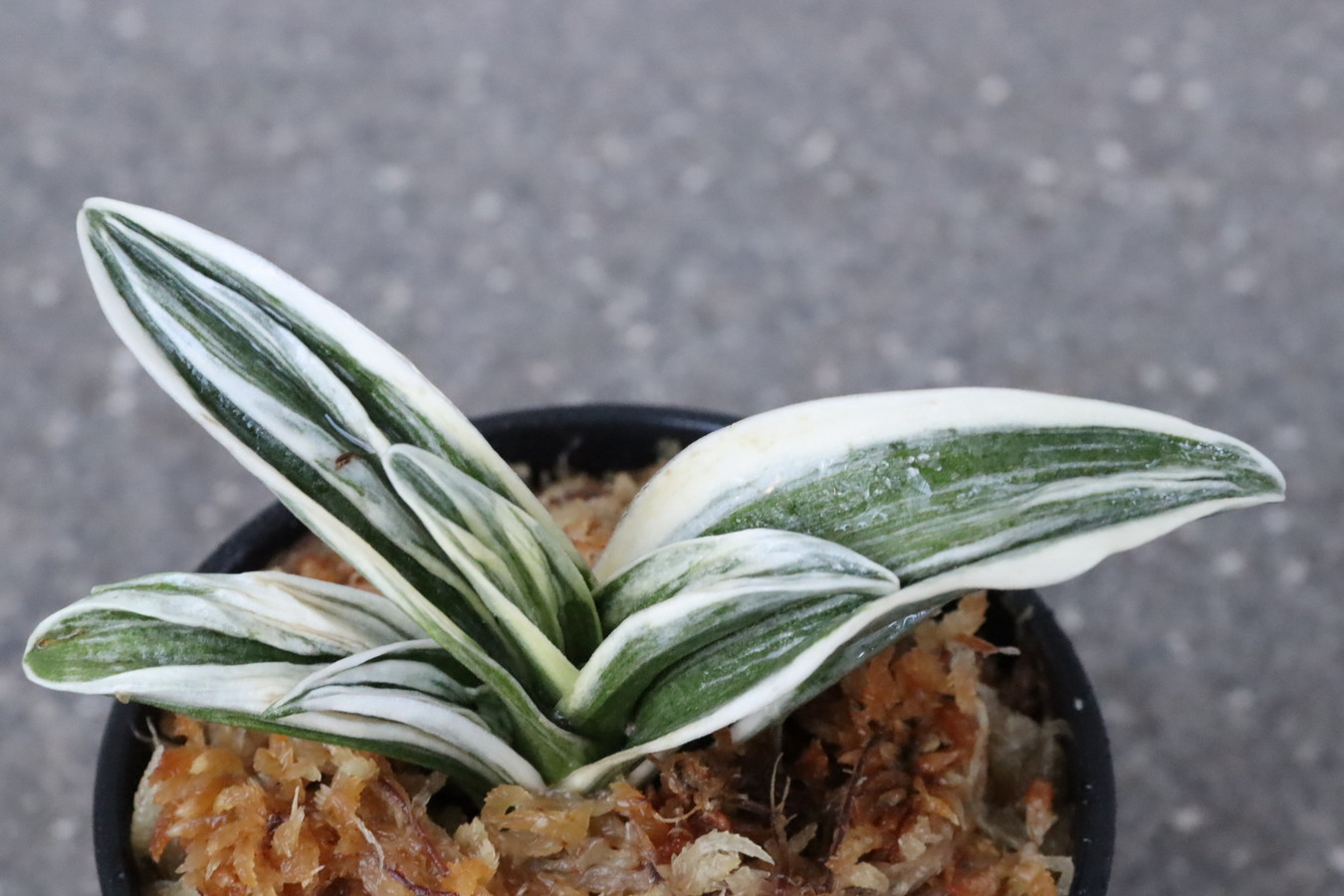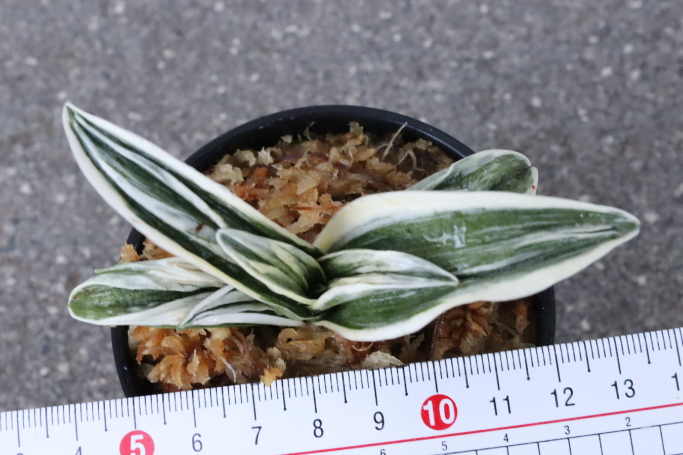 葉肉厚く丸葉型。濃緑色の艶消し地の広い葉幅に葉全体を覆う白い総雅糸竜を現す姿は力強く、どっしりとして容姿は迫力を感じさせる。若い頃から覆輪は深く、陽を採り総雅糸竜を引き出したい。肥料を強くすることで葉幅の広い、首の太い姿になる。性質は普通。繁殖は、芋吹きが主で、子上げもする。