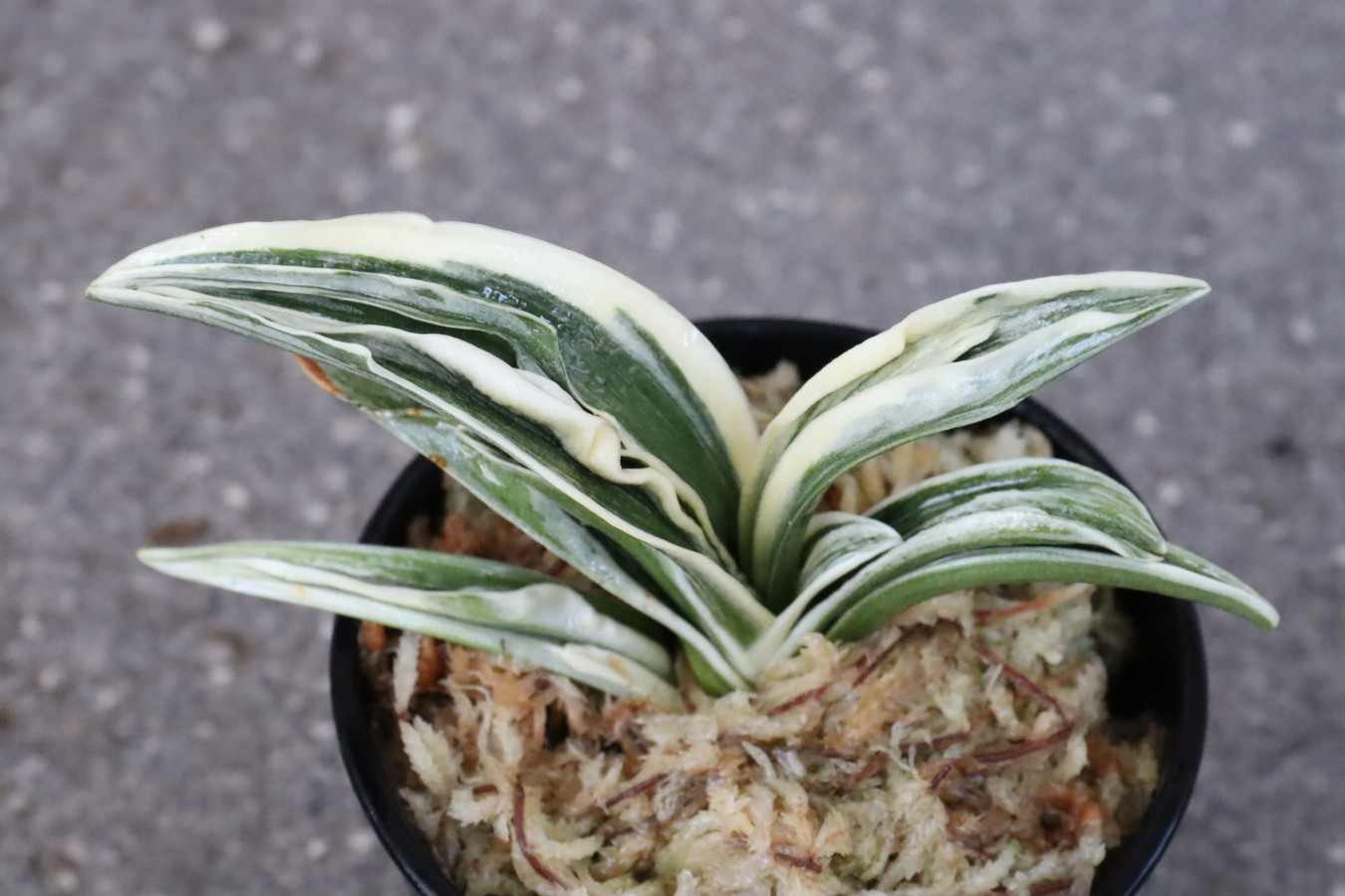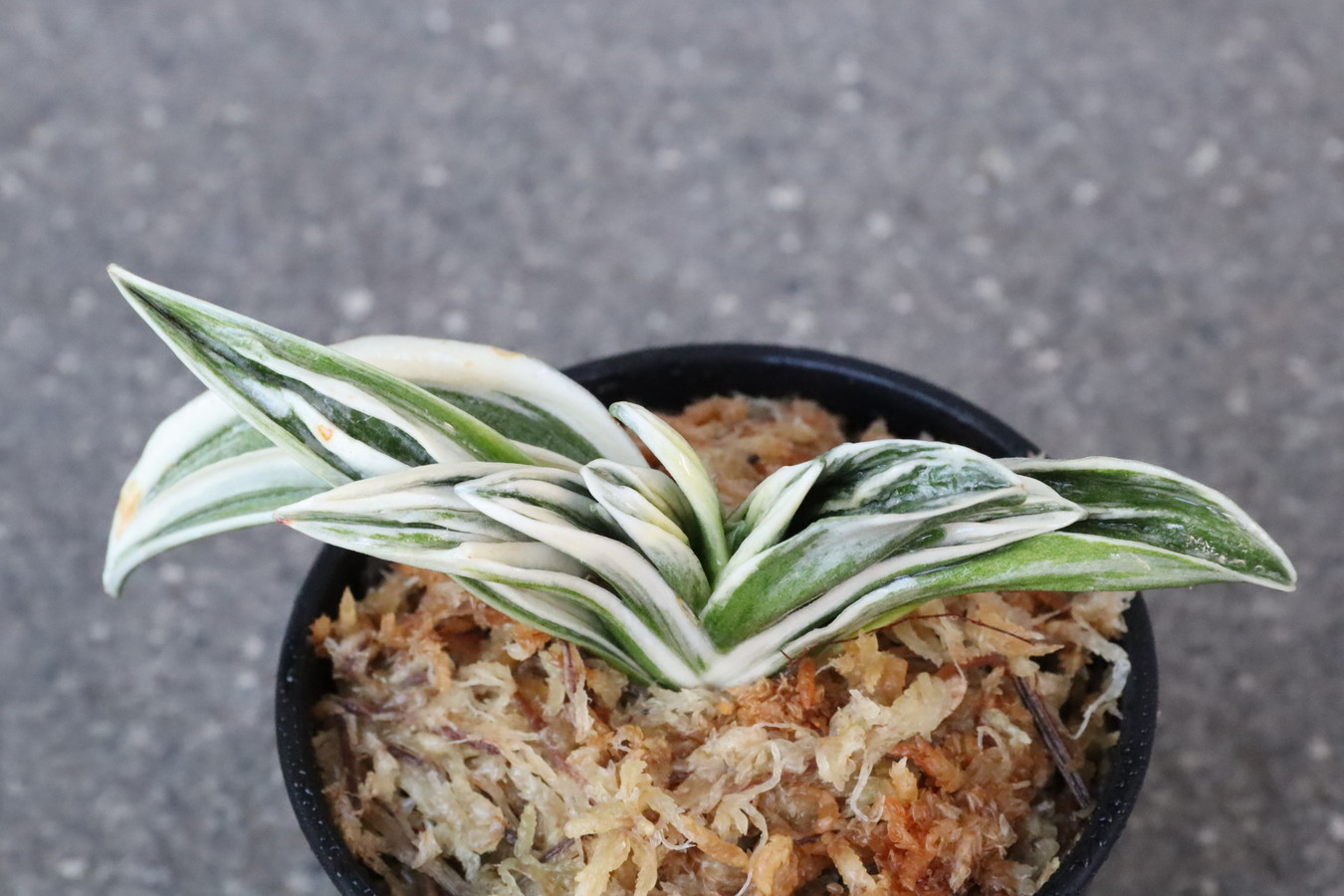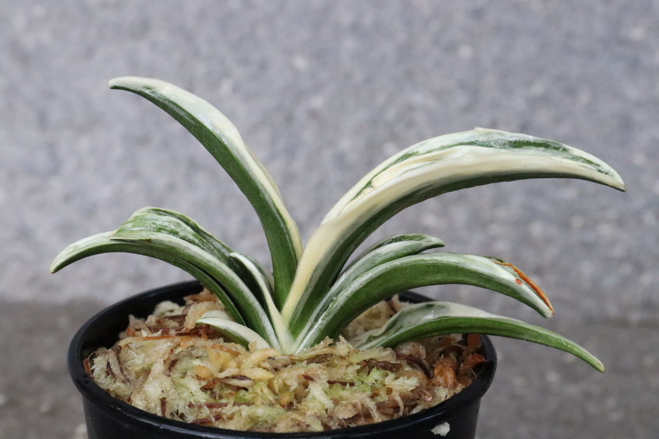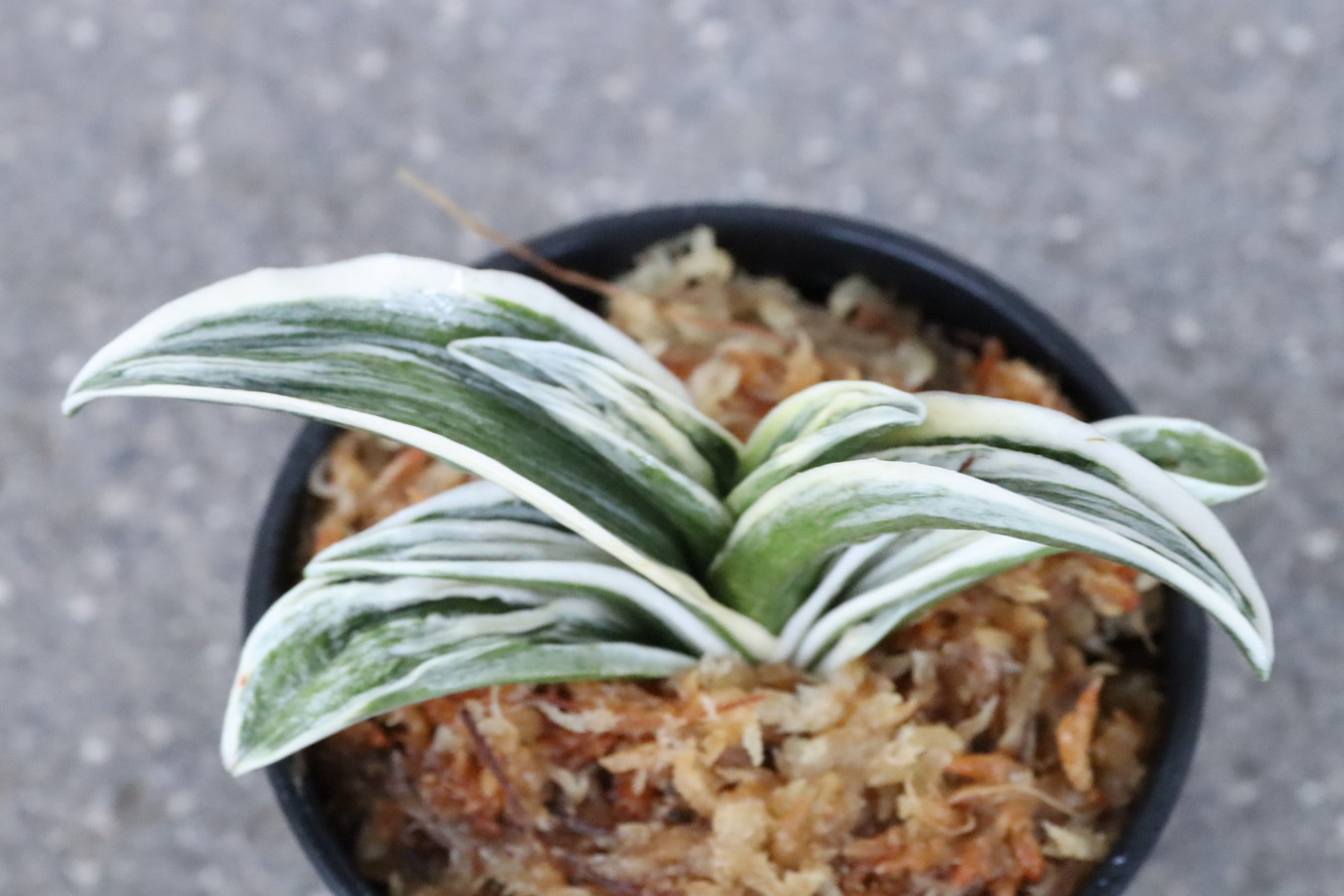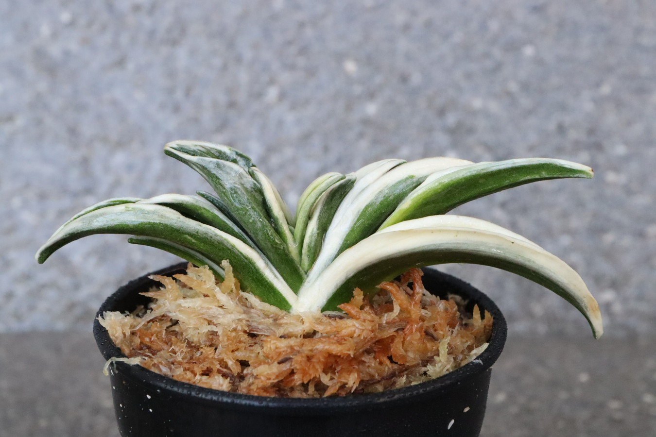 葉肉厚く丸葉型。濃緑色の艶消し地の広い葉幅に葉全体を覆う白い総雅糸竜を現す姿は力強く、どっしりとして容姿は迫力を感じさせる。若い頃から覆輪は深く、陽を採り総雅糸竜を引き出したい。肥料を強くすることで葉幅の広い、首の太い姿になる。性質は普通。繁殖は、芋吹きが主で、子上げもする。