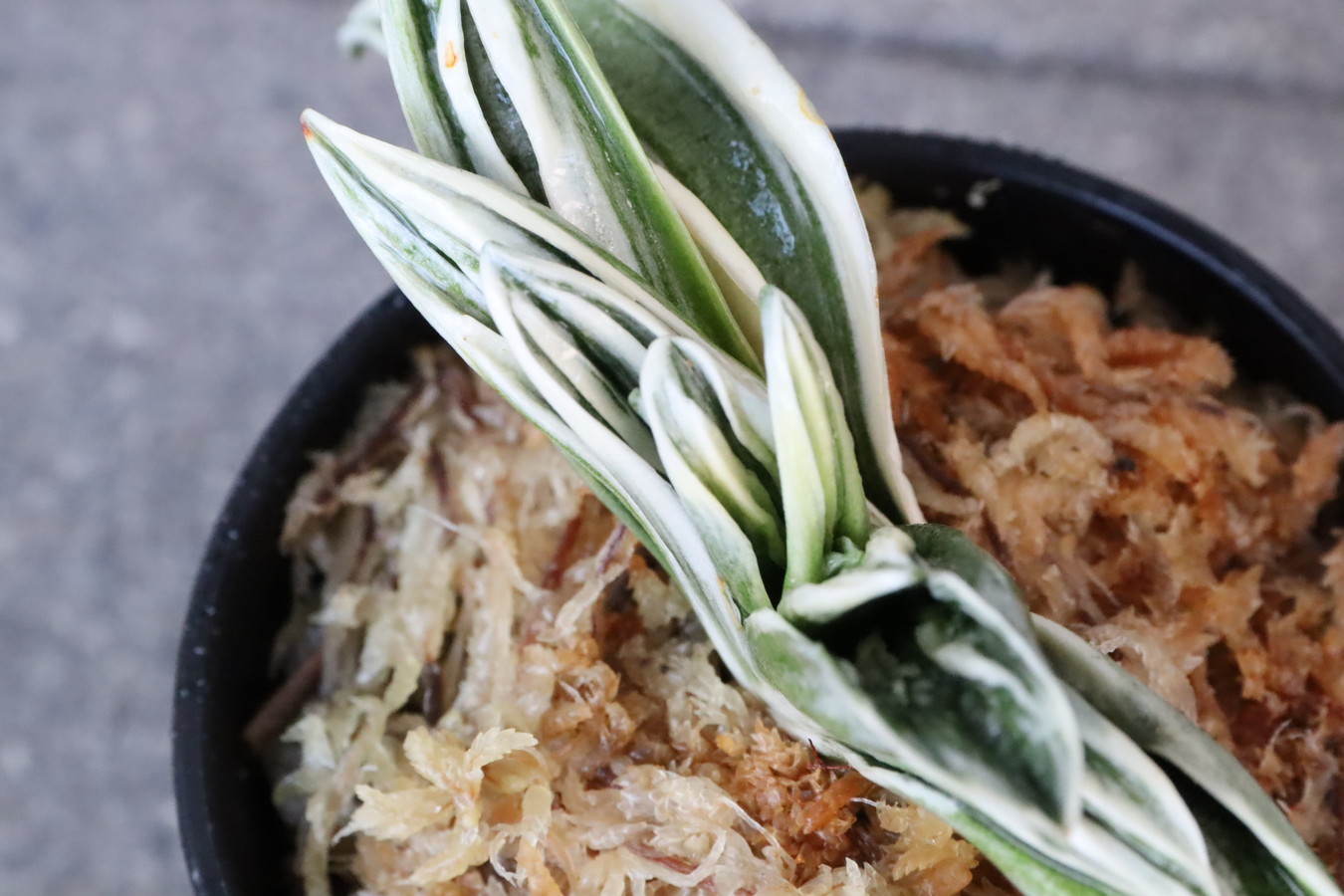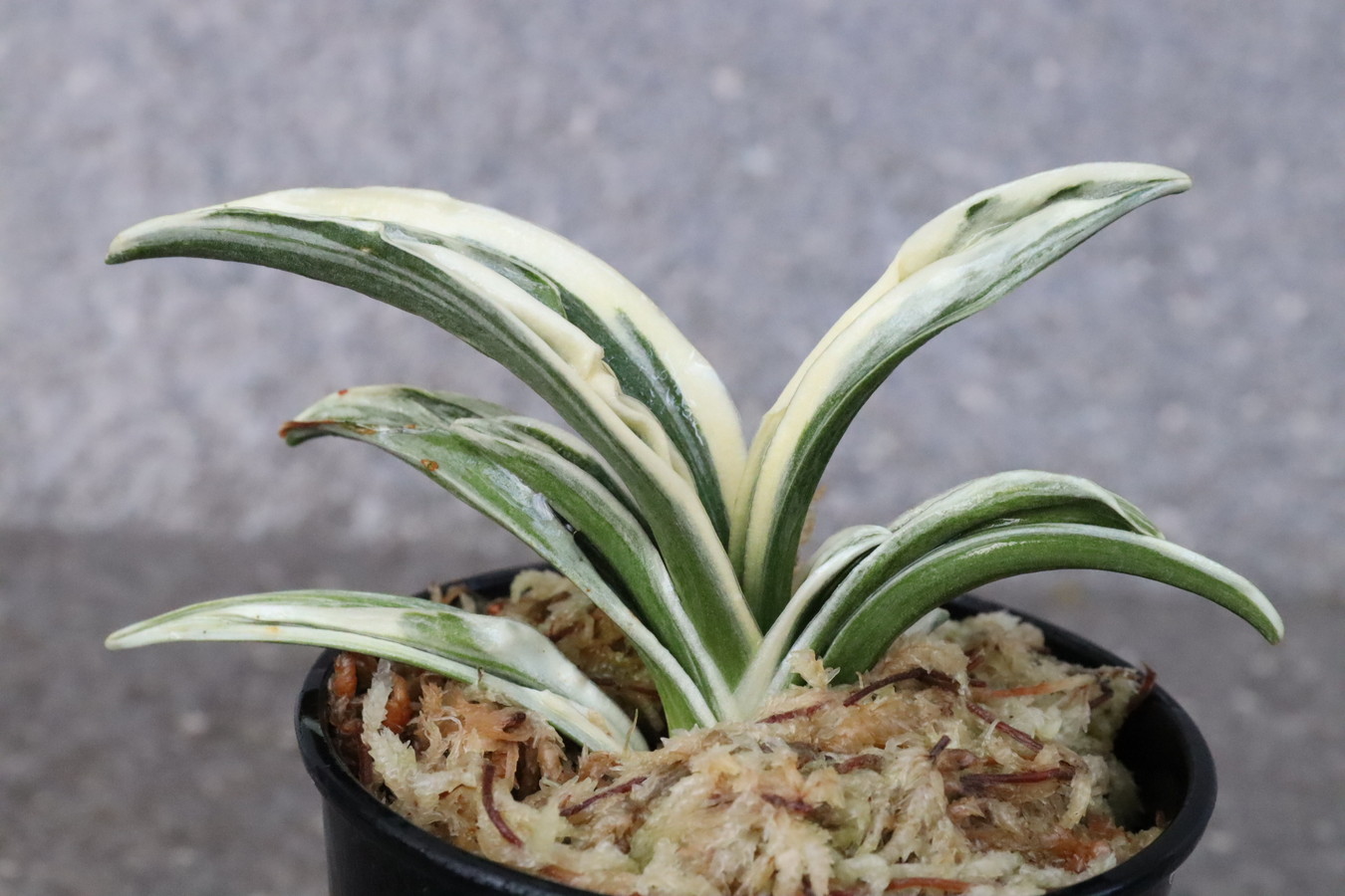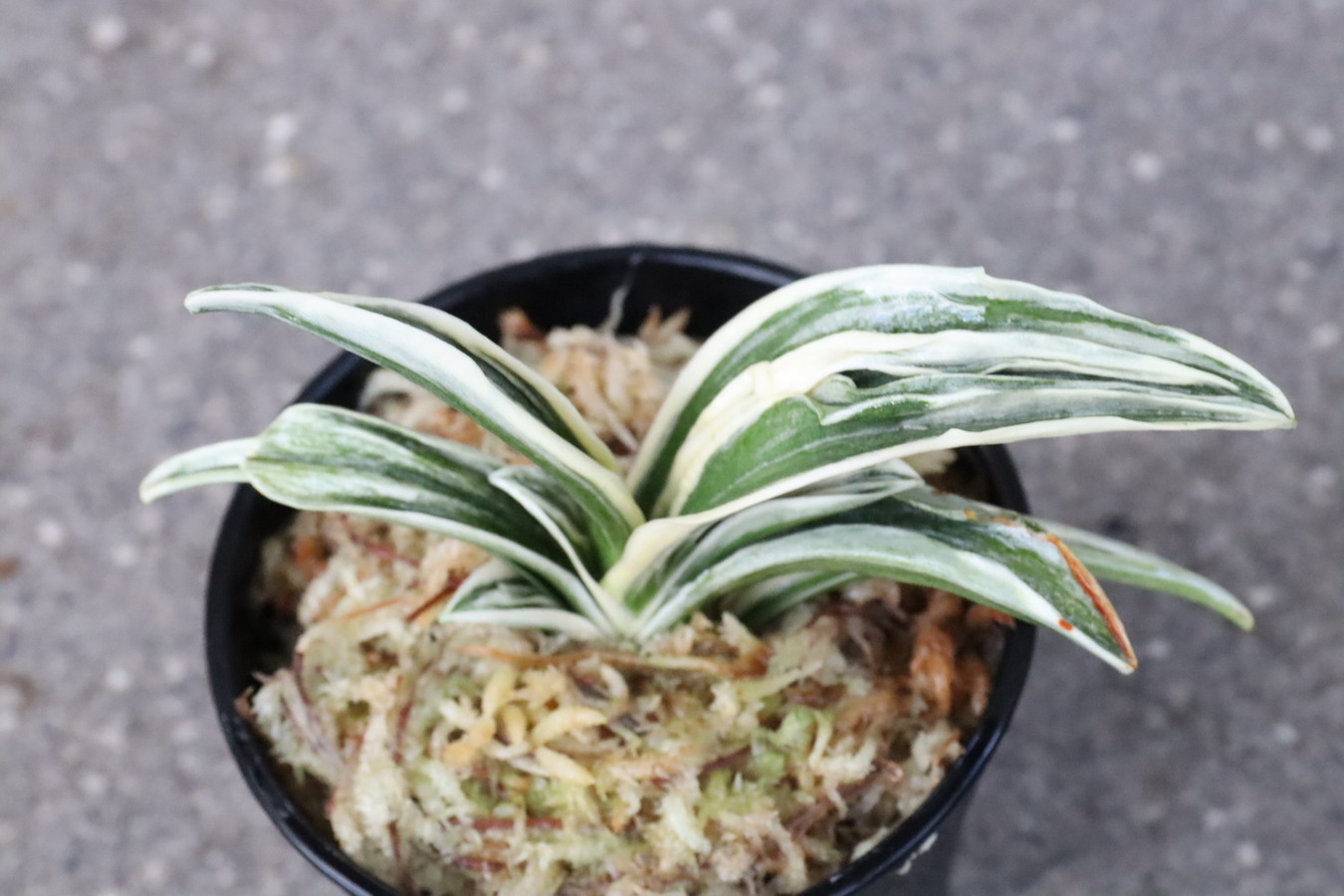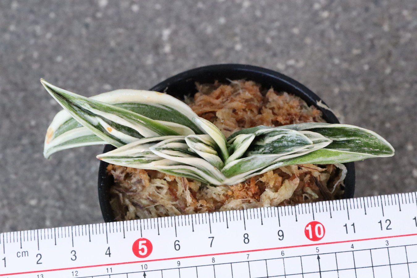 葉肉厚く丸葉型。濃緑色の艶消し地の広い葉幅に葉全体を覆う白い総雅糸竜を現す姿は力強く、どっしりとして容姿は迫力を感じさせる。若い頃から覆輪は深く、陽を採り総雅糸竜を引き出したい。肥料を強くすることで葉幅の広い、首の太い姿になる。性質は普通。繁殖は、芋吹きが主で、子上げもする。