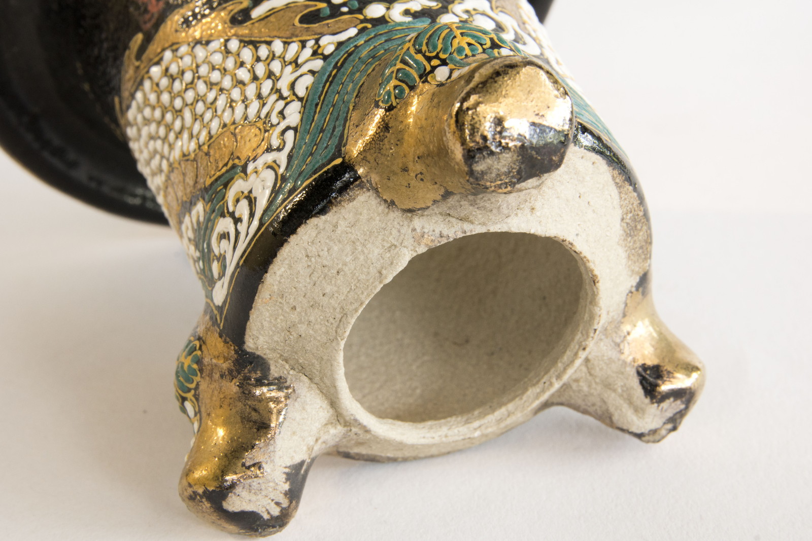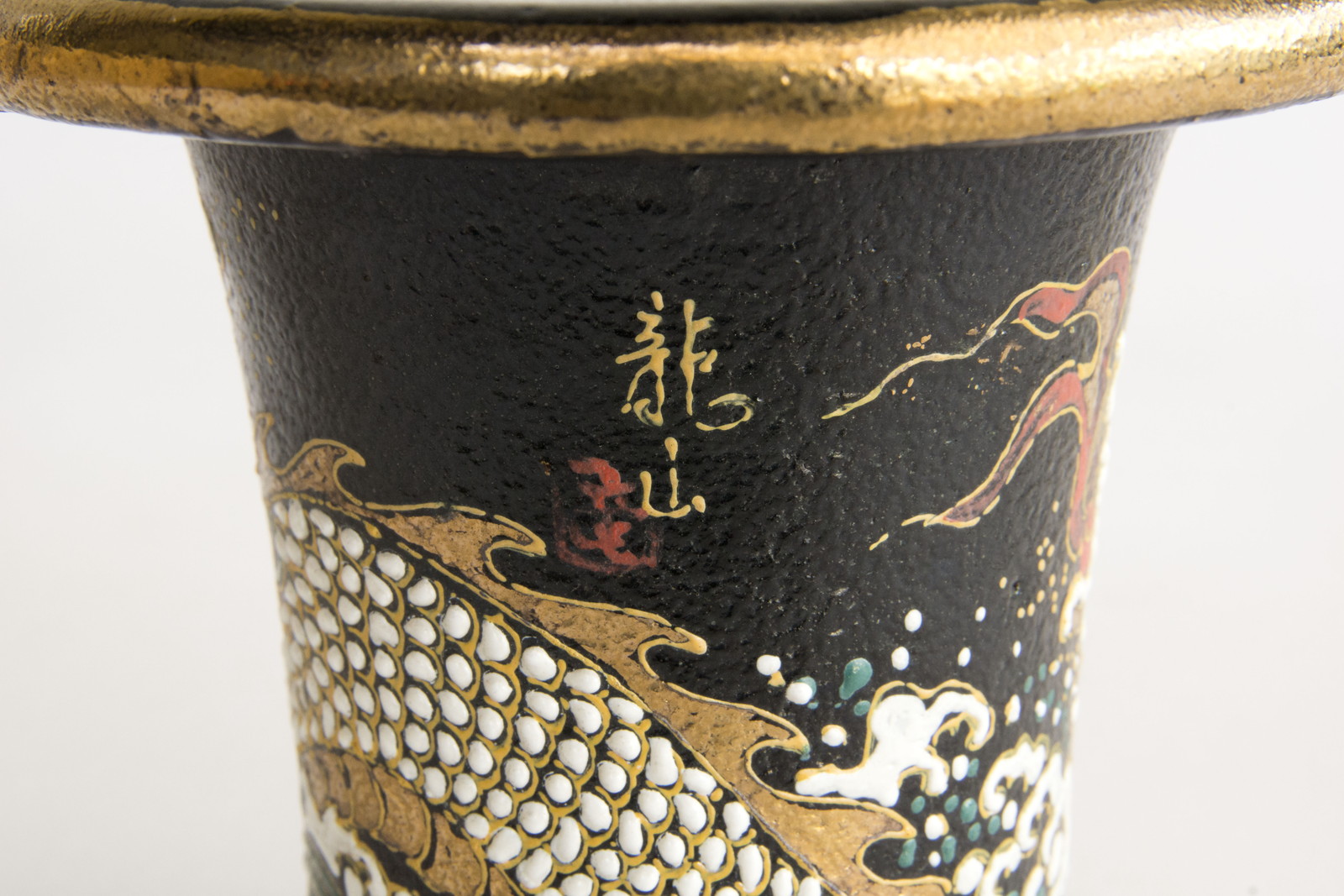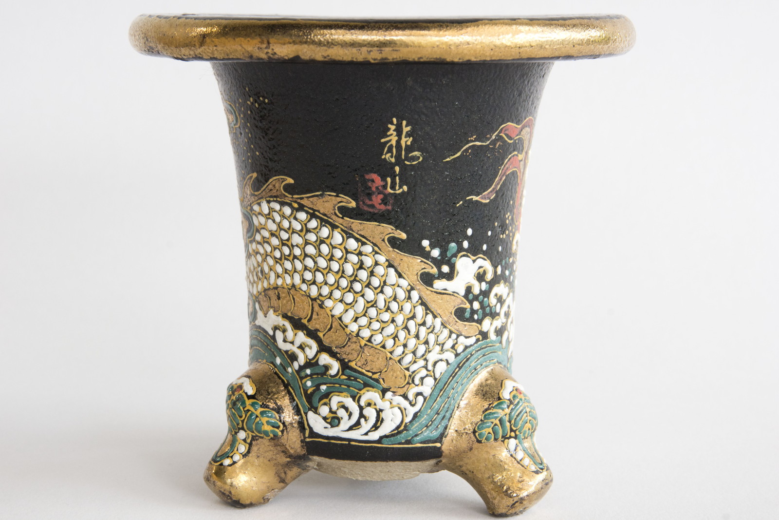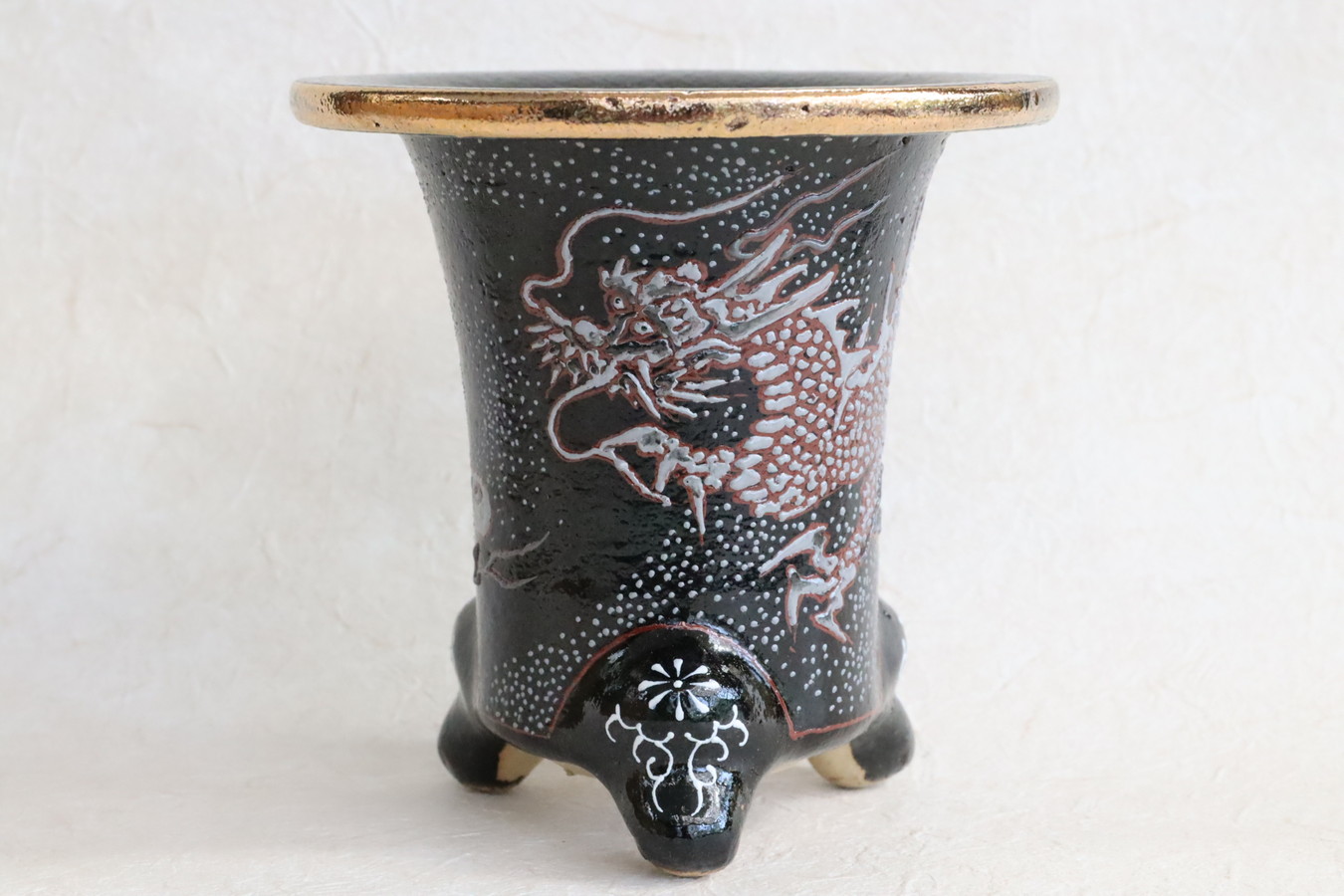 龍山作の一品ですが鉢の正面縁金の上に絵の具の付着ありますので画像でよくご確認ください。勉強価格楽焼は天正年間(約400年前)に始まる日本独特の焼き物です。楽焼は《急熱急冷》という特殊な焼成方法をとります。急熱急冷だから、鉢に細かな 微細な穴ができ、通気を良くしています。万年青鉢 龍山後藤龍山 絵付師