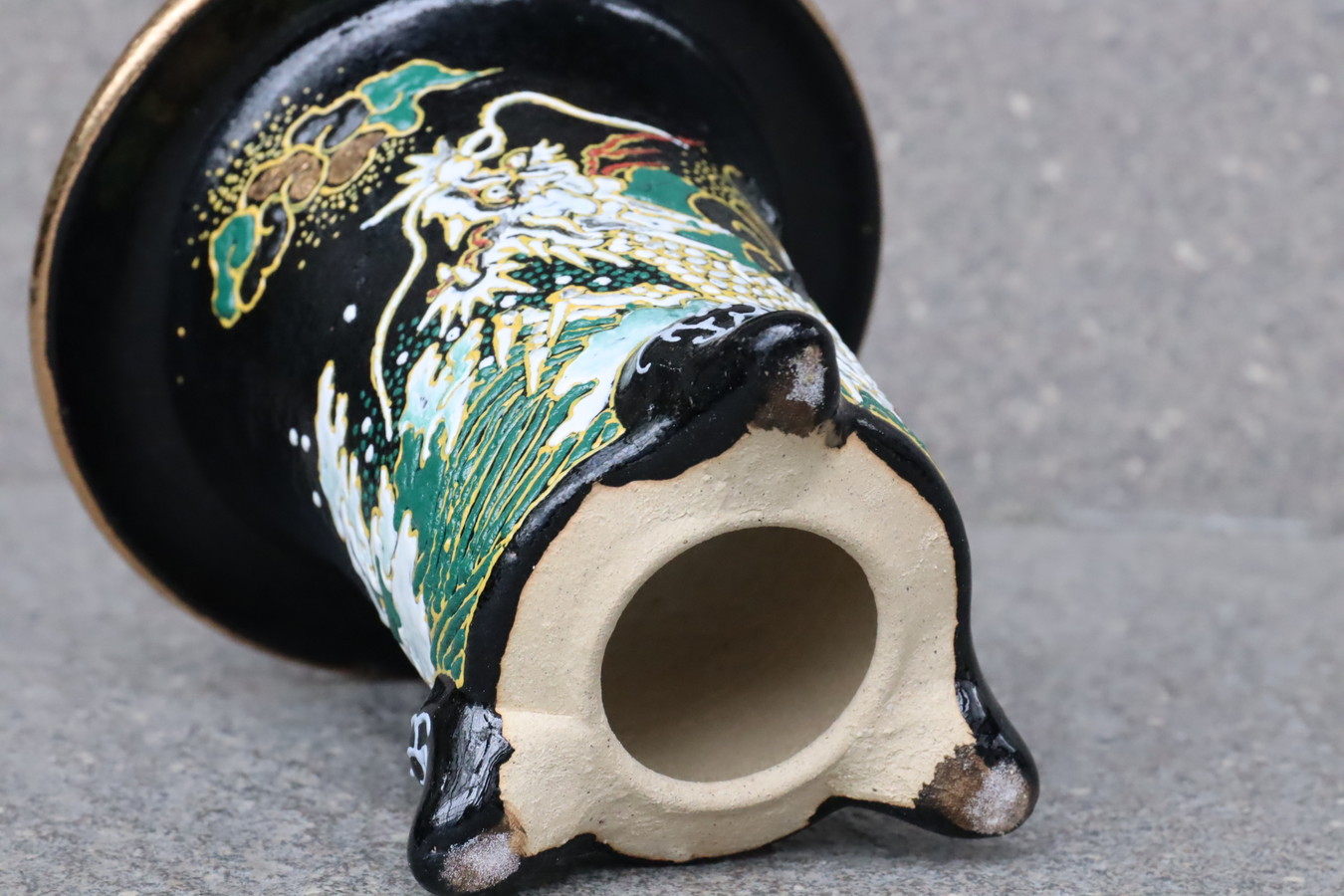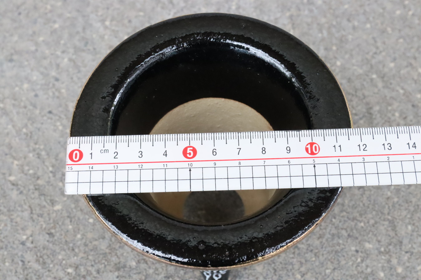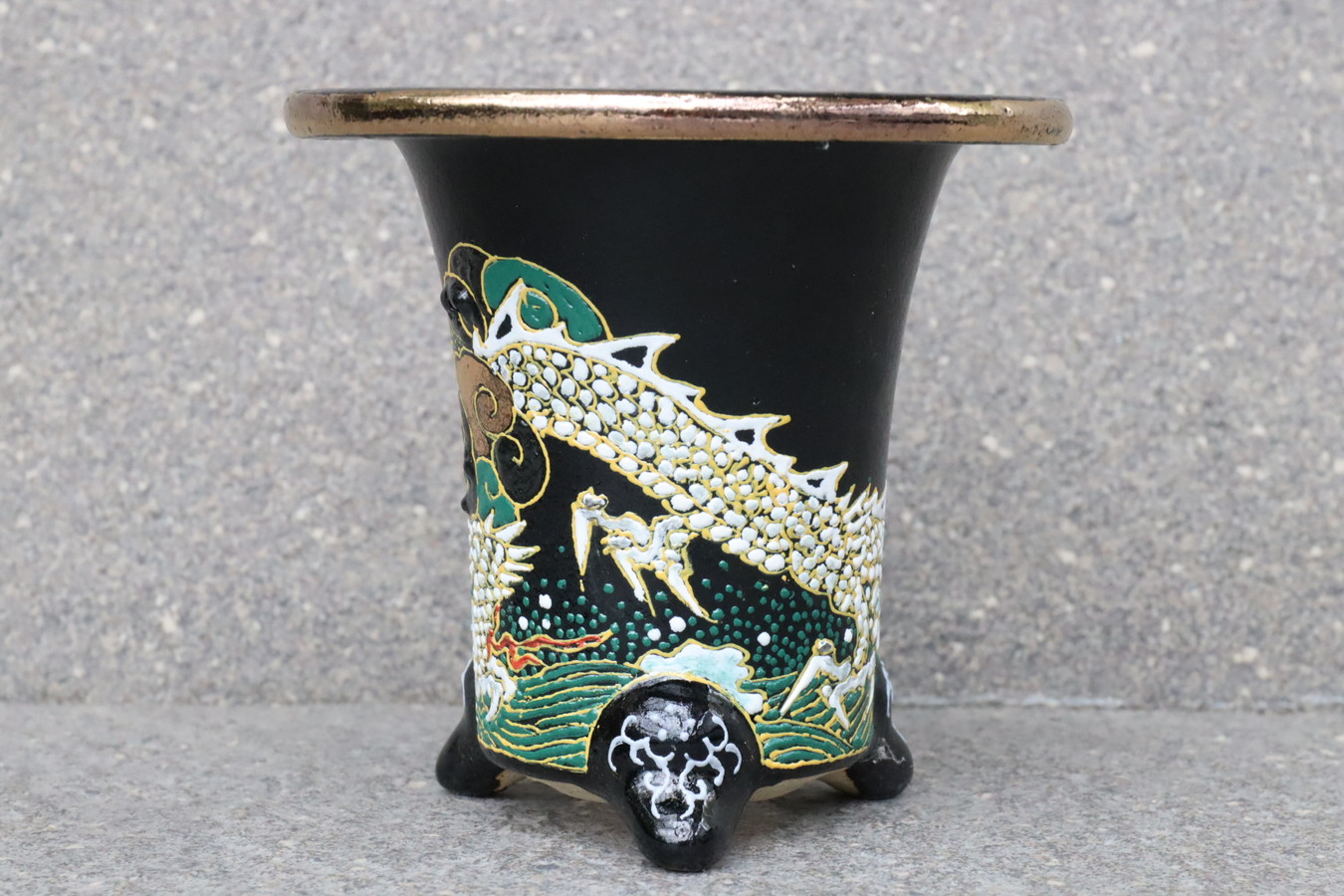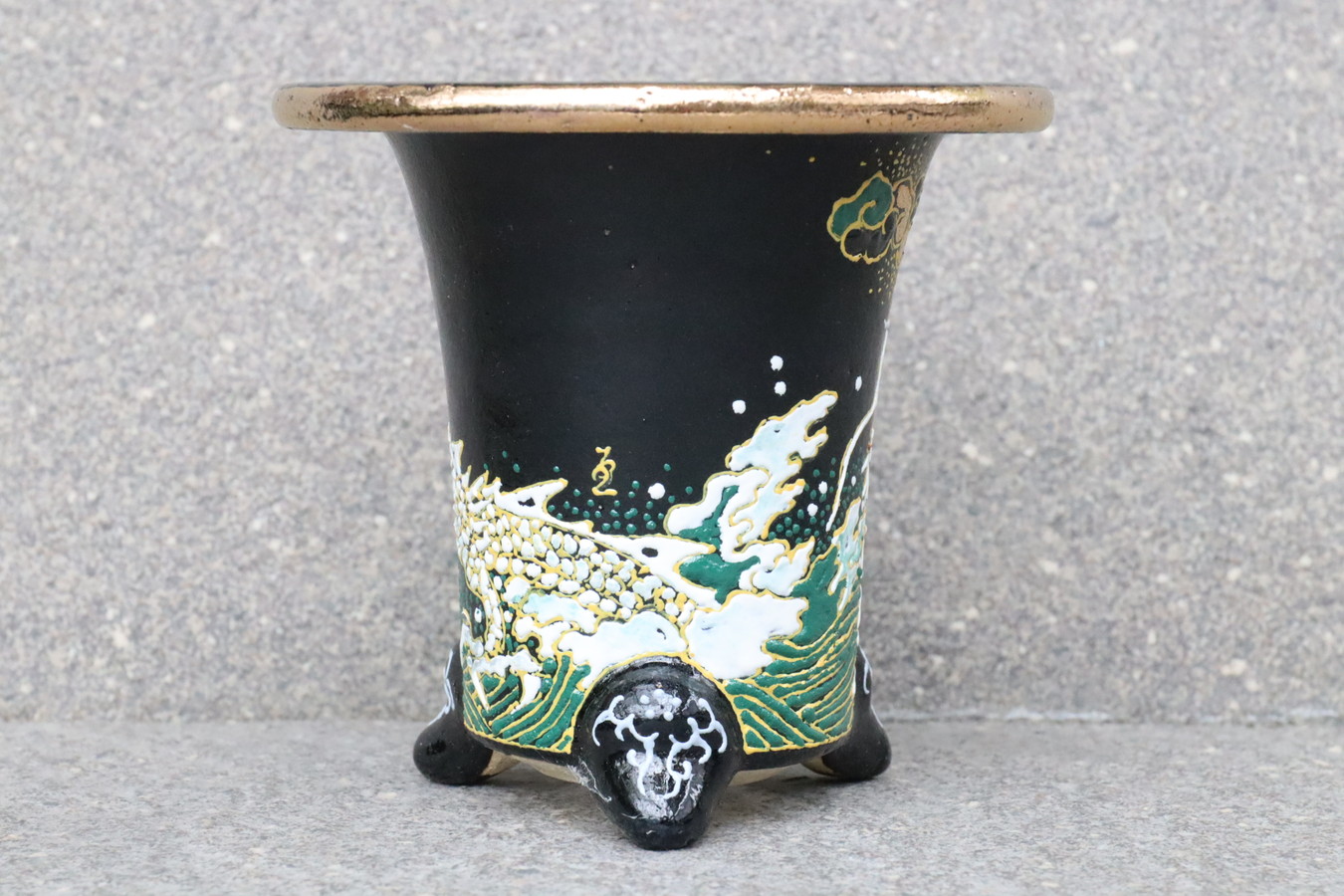 2477,特級 加茂黒太鼓胴 金龍 萬年青楽鉢 外径約10.3cm 亘サイン 華サイン 合作の傑作