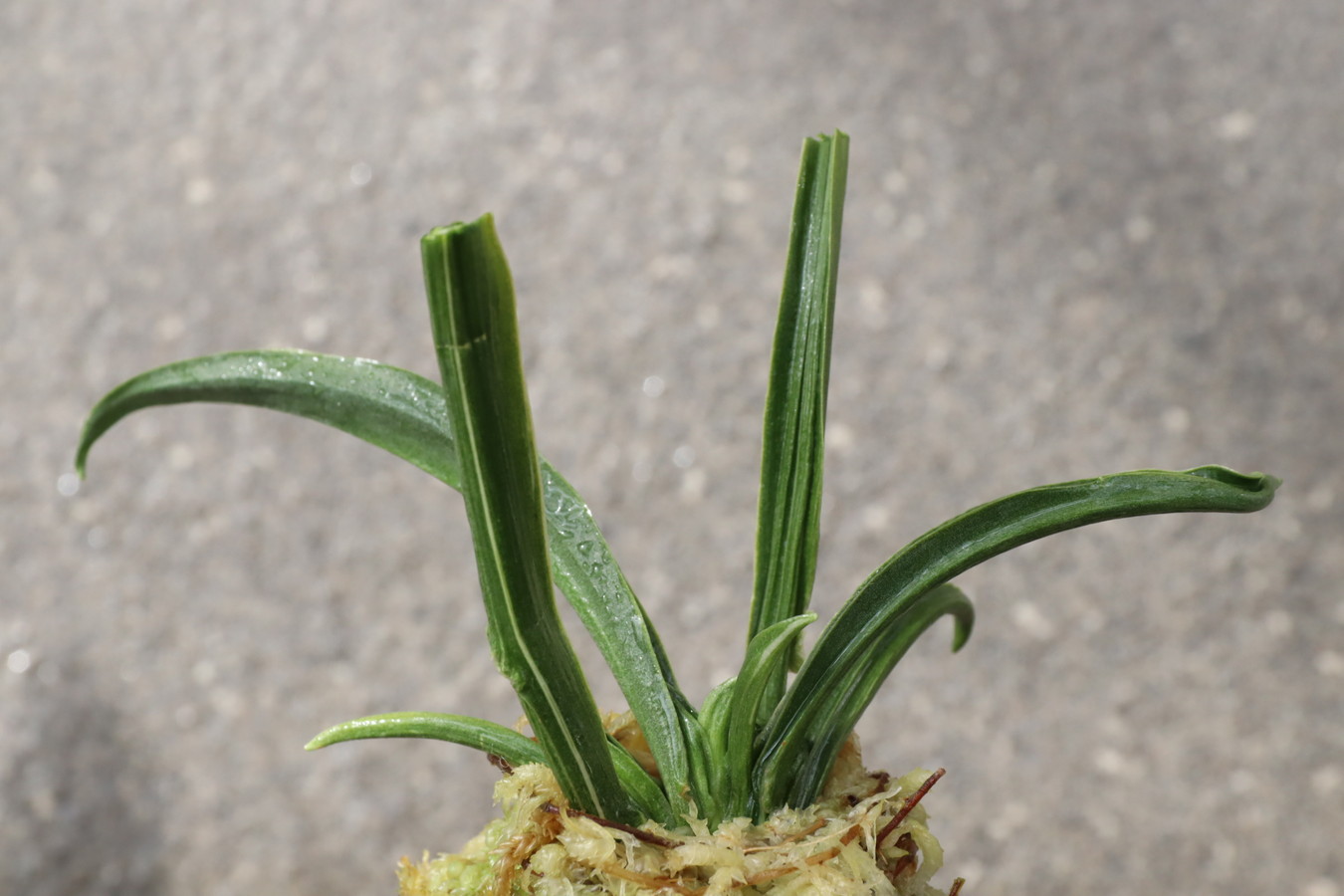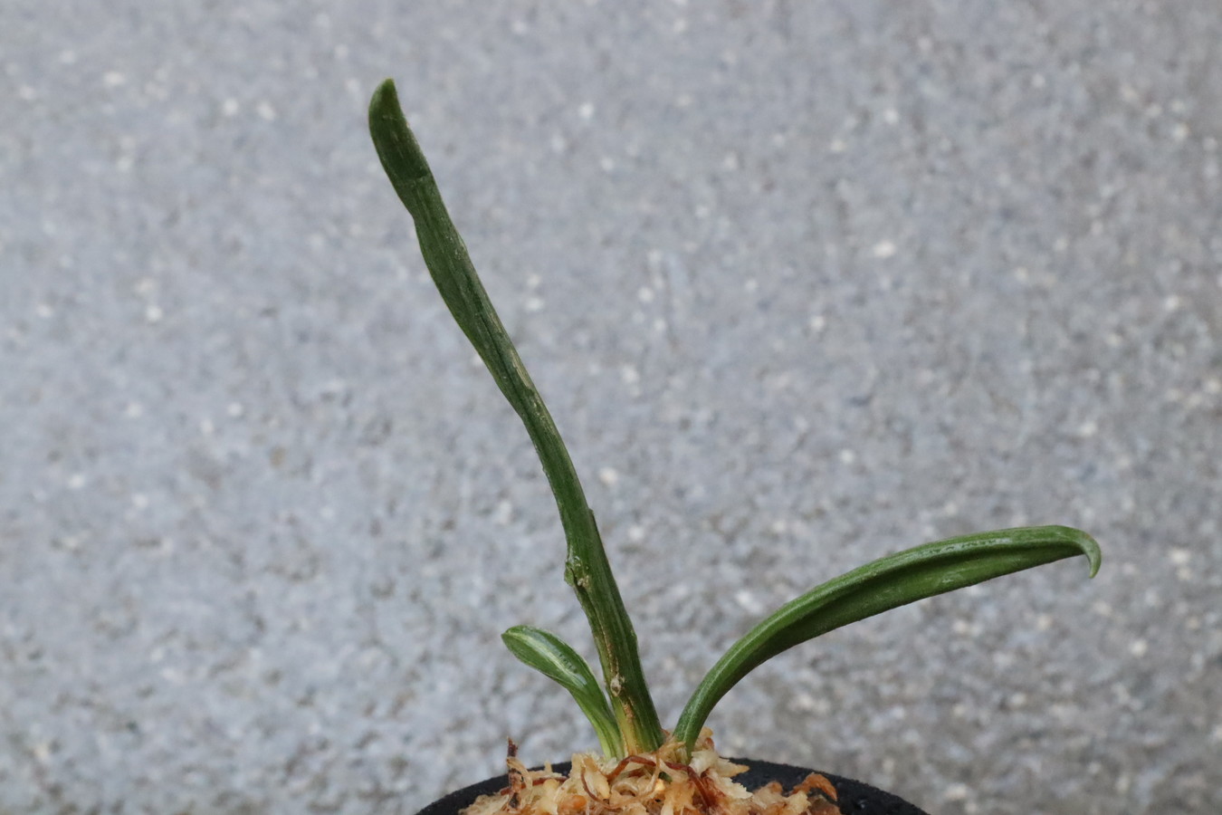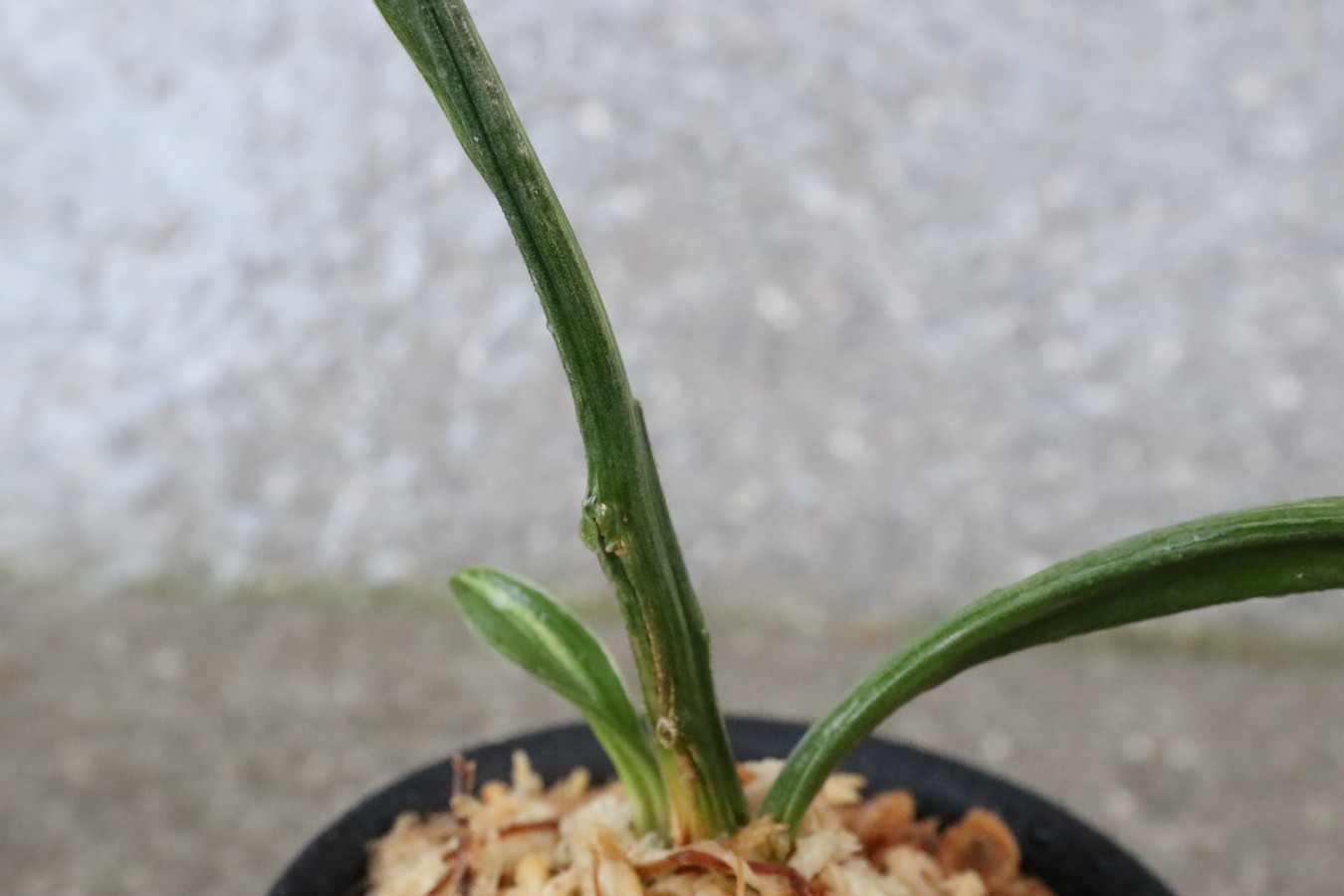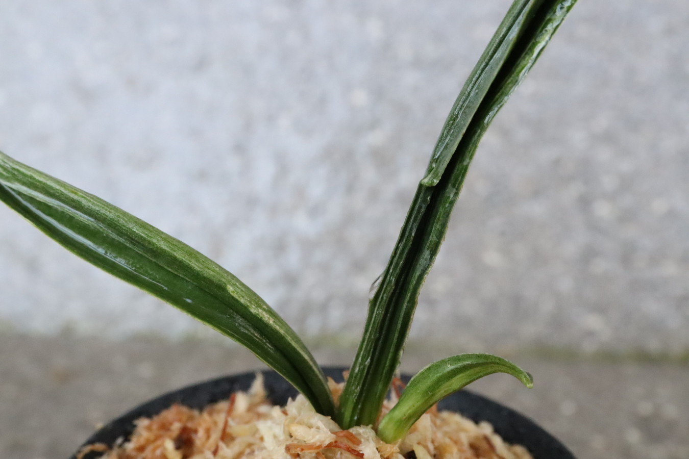 濃緑色で立ち葉性、独特の葉姿を見せる。