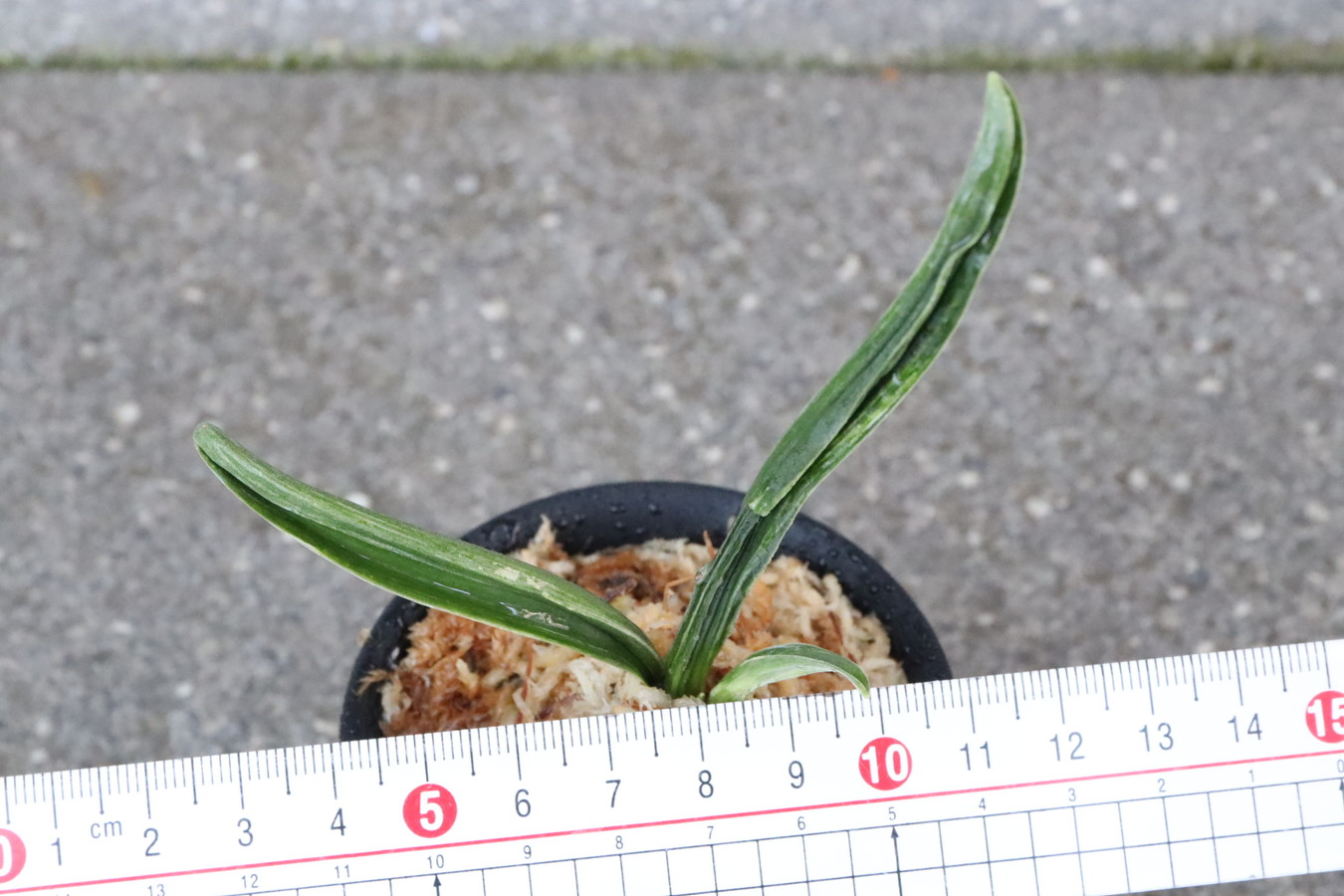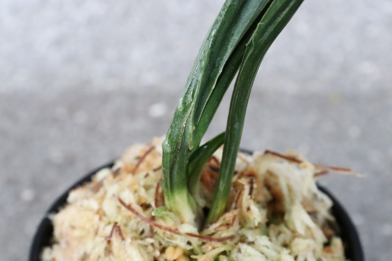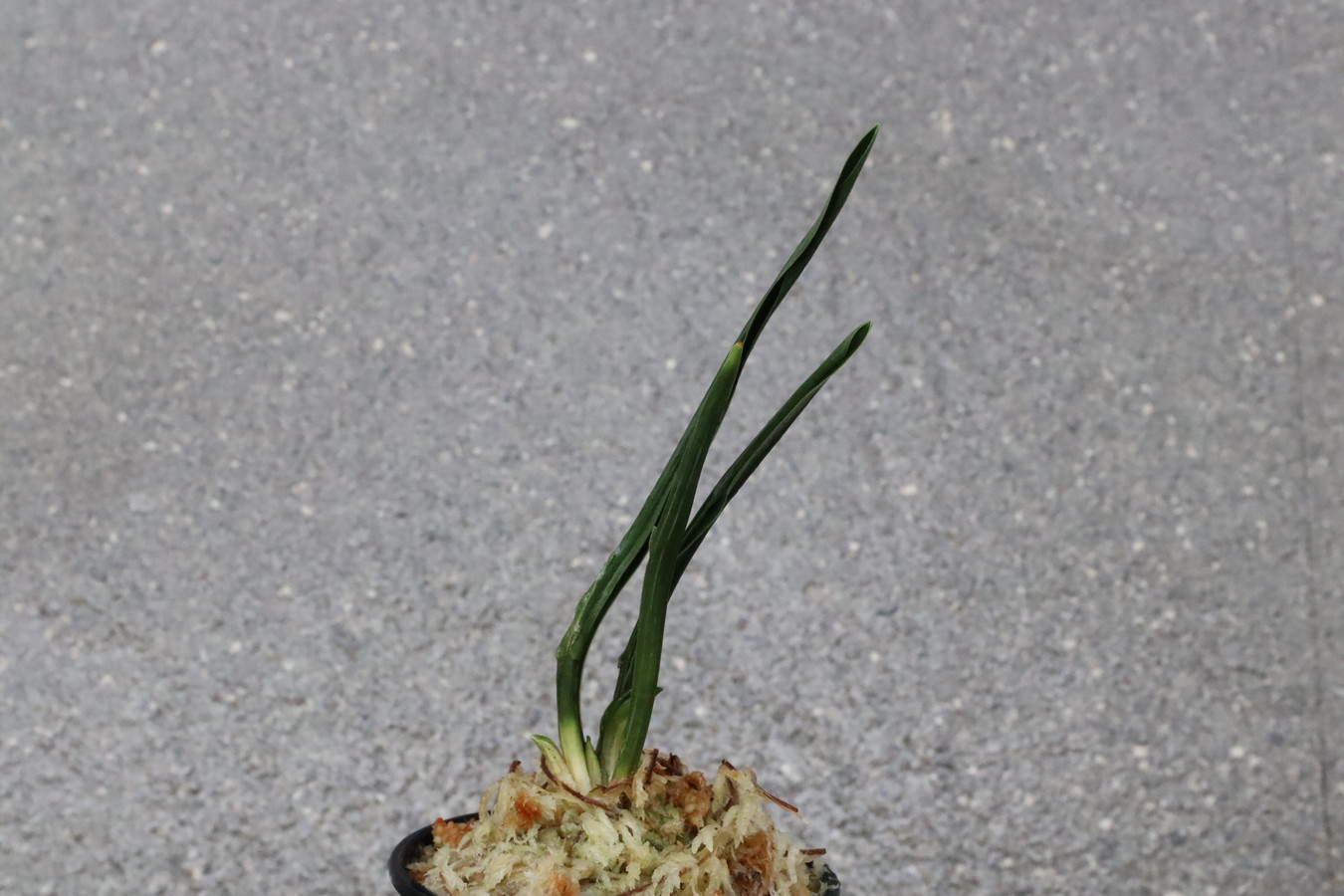 濃緑色で立ち葉性、独特の葉姿を見せる。