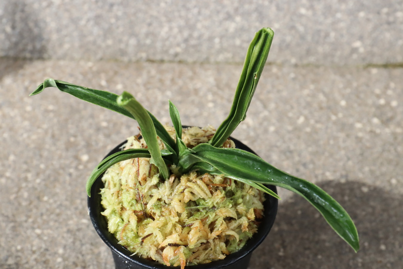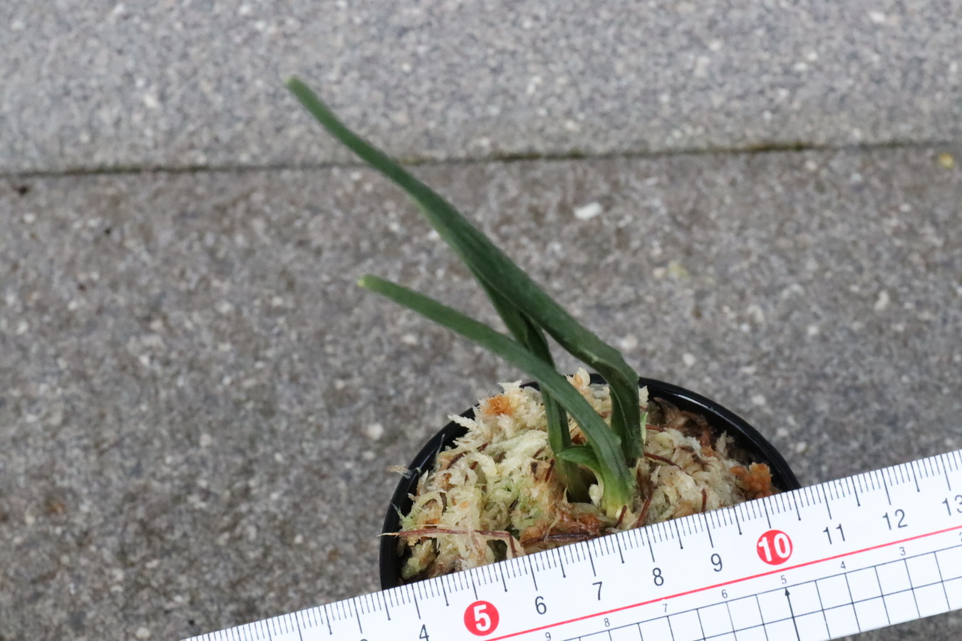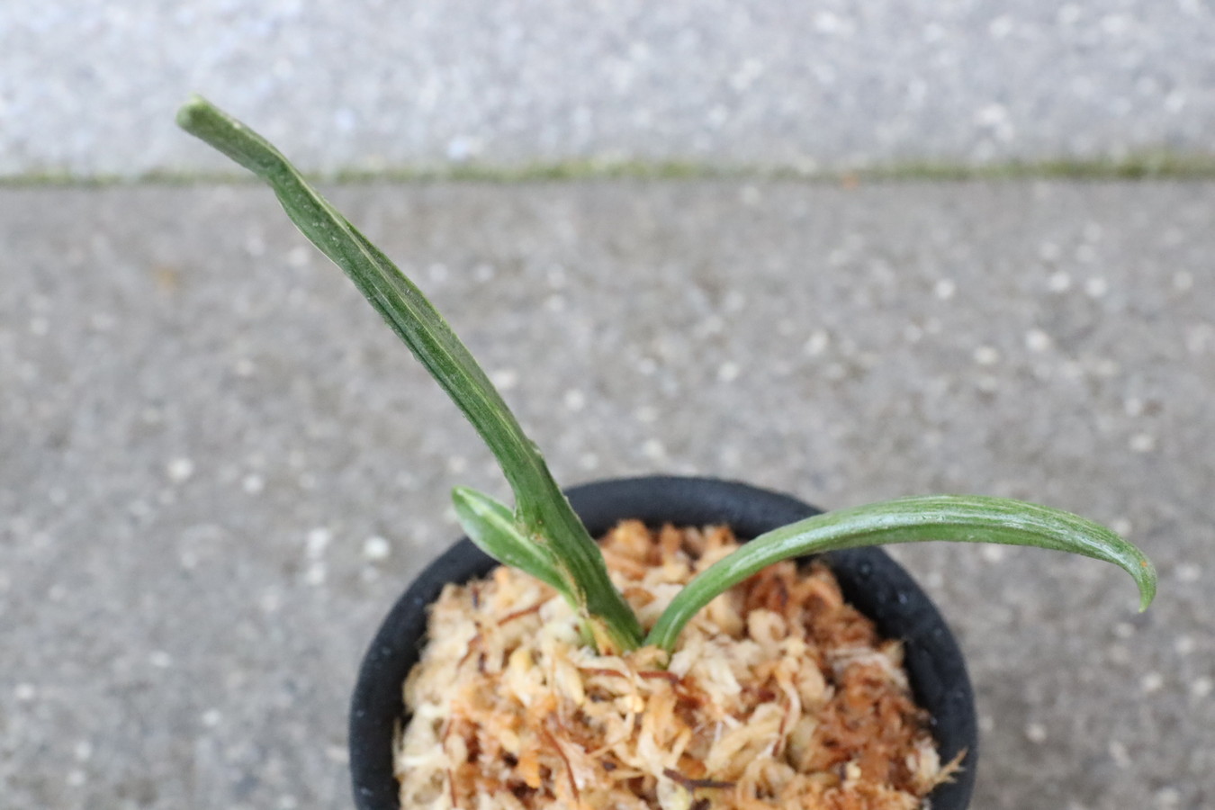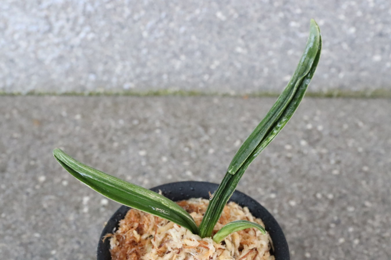 濃緑色で立ち葉性、独特の葉姿を見せる。