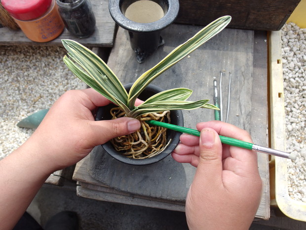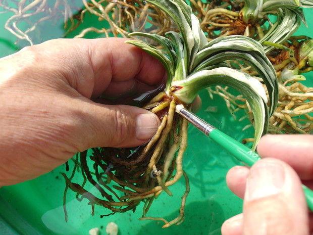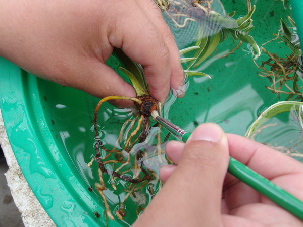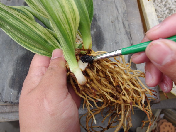 芋痛み防止に古葉の付け根・古い根・肥料カスなどが芋にへばりついていると雑菌が繁殖し芋痛みの原因になります、植え替えの際には適度な硬さの筆で洗い流しましょう。