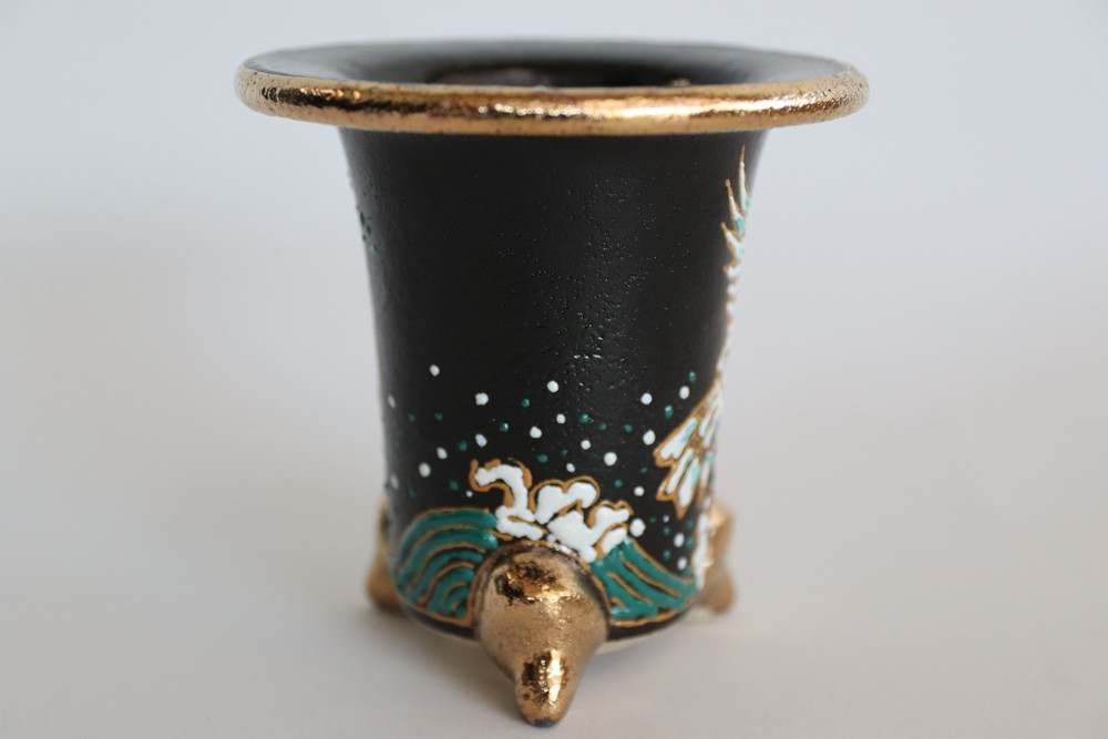 吉祥柄絵鉢おもと鉢 万年青鉢 オモト鉢楽焼は天正年間(約400年前)に始まる日本独特の焼き物です。楽焼は《急熱急冷》という特殊な焼成方法をとります。急熱急冷だから、鉢に細かな 微細な穴ができ、通気を良くしています万年青鉢 布施鉢