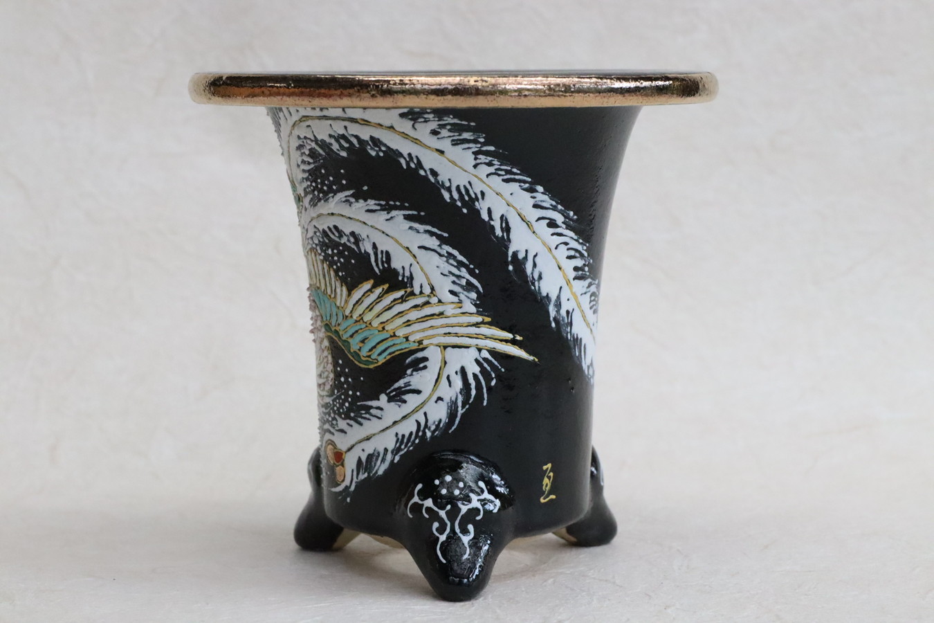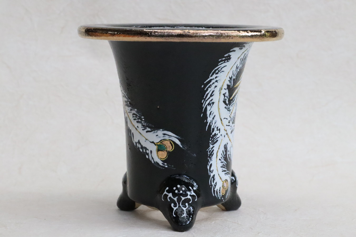 2024.7.2 万年青鉢 オモト鉢【希望価格25000円】楽焼は天正年間(約400年前)に始まる日本独特の焼き物です。楽焼は《急熱急冷》という特殊な焼成方法をとります。急熱急冷だから、鉢に細かな 微細な穴ができ、通気を良くしています。錦鉢 小菊の魅力