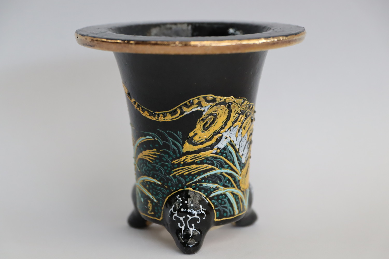 3080, 睨みつける虎 鉢 外径約11.8cm 亘サイン