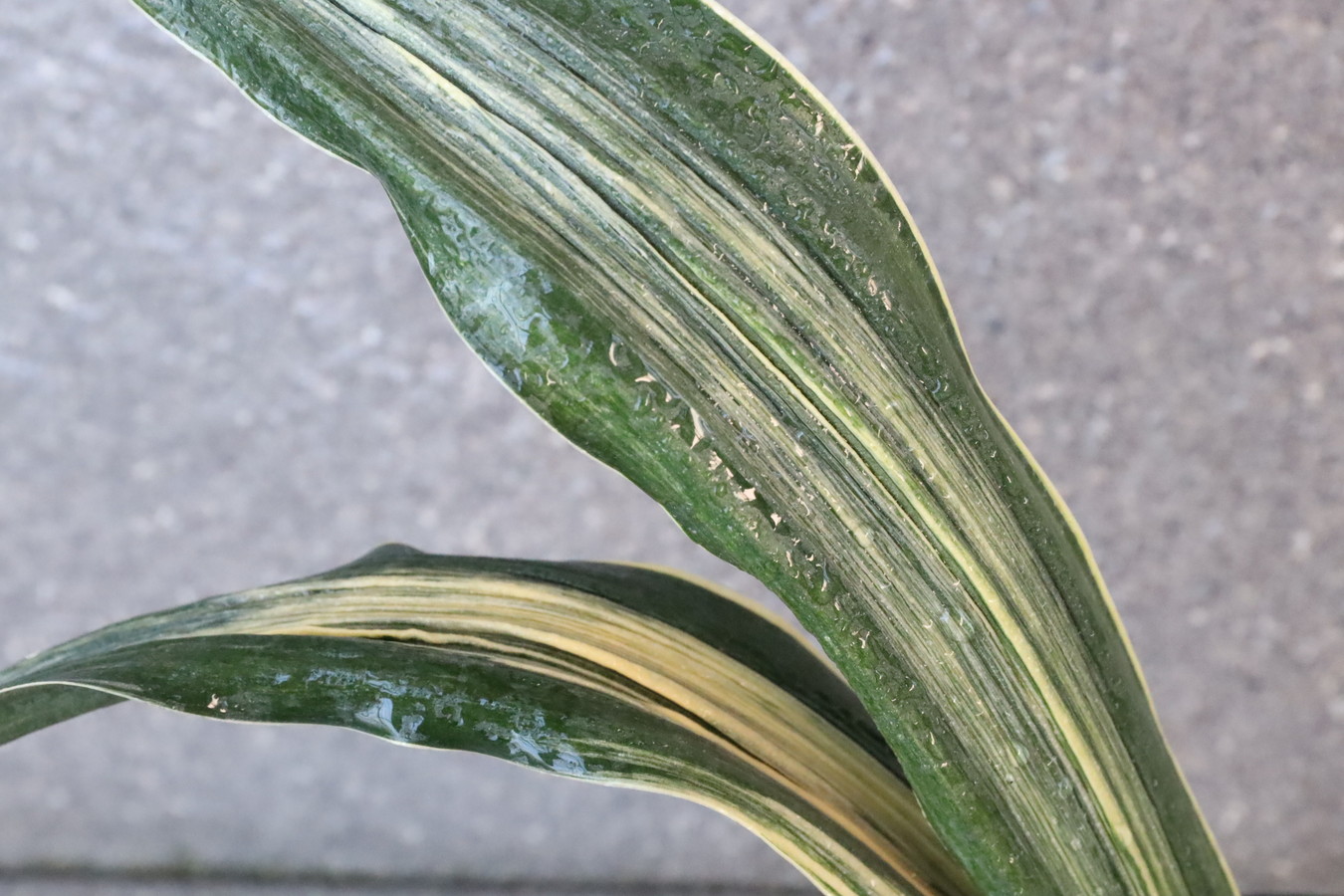万年青は一つ殖えるのに5年とも10年ともいわれる、寿命の非常に長い植物です。一つ一つの苗でも1-3年ほどかけて育て上げています。その間には台風、猛暑、寒さ、自然の虫など様々な障害をへて育っていくので、完全に無傷の万年青はありません。人以上の寿命のある万年青。風邪を一度も引いたことがない、かすり傷も一度もない人がいないように、ちょっとした傷もある意味、懸命に生きている証。そんな風に考えていただけると有難いです。