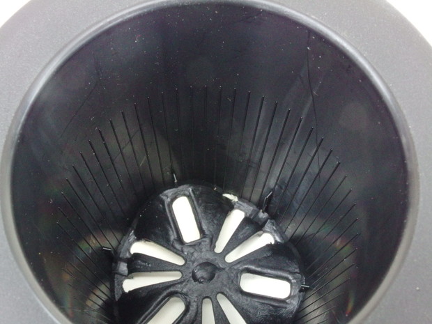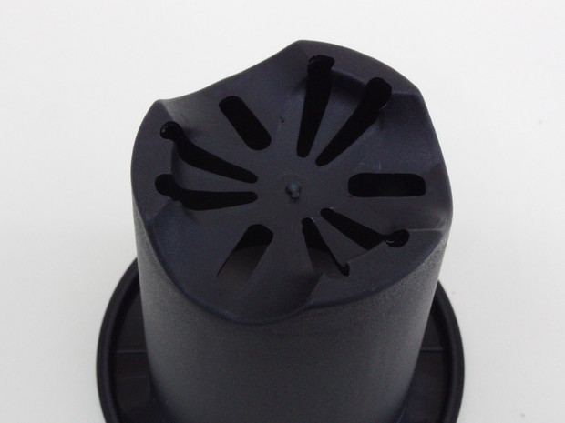 高級おもとプラ鉢 つや消し地黒色 古来からのおもと鉢を模したプラスチック鉢で内側に縦筋があり細身の形状で水管理が有利、抜き水による鉢内の換気も良好。