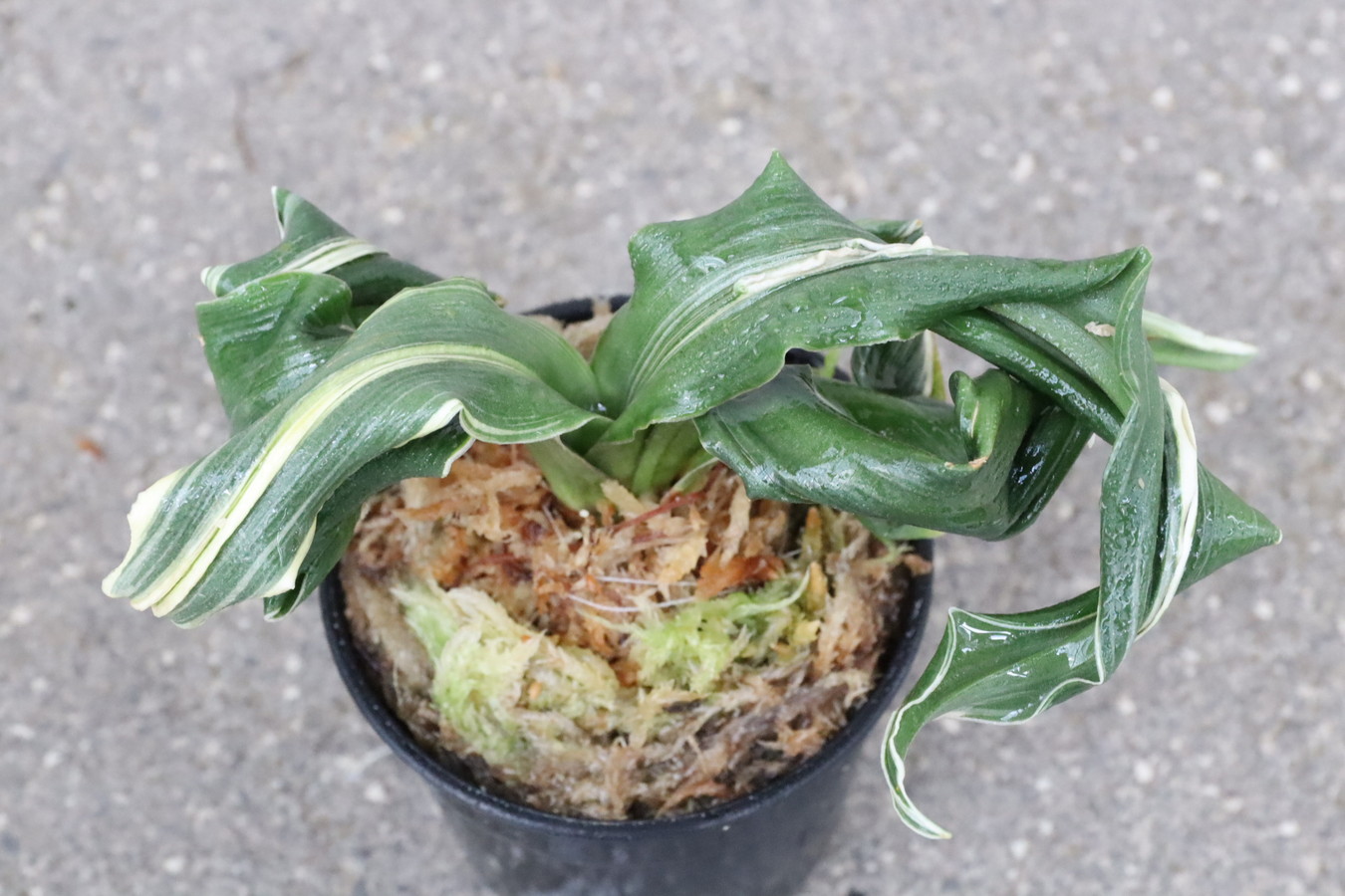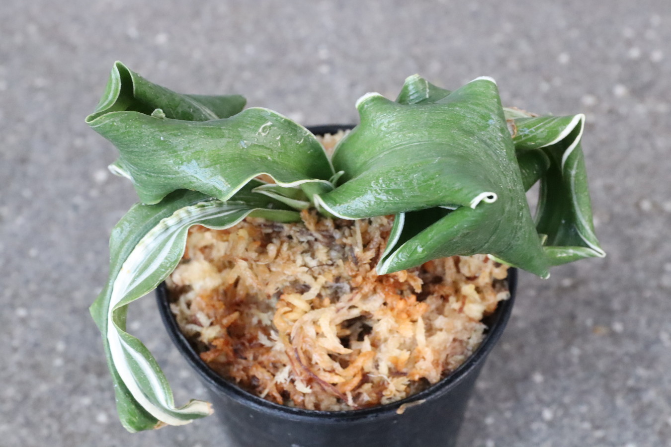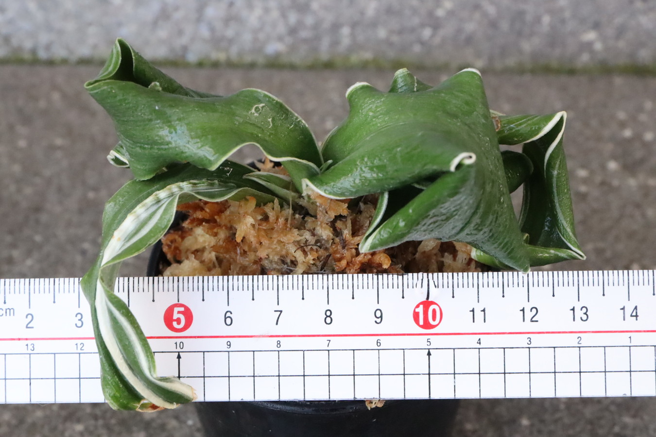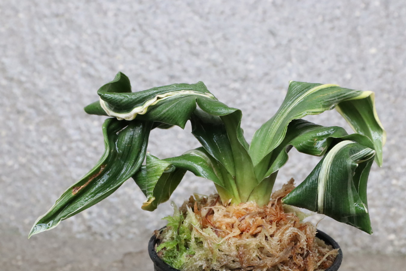厚い葉肉に白い雅糸竜・玉竜を現す。力強い角巻きの葉は竜が暴れているような迫力を感じさせる角巻獅子の代表種。古くからあるので、青、縞、覆輪、縞覆輪と柄に様々あるが、数の少なさから縞覆輪が最高の人気を呼んでいる。縞覆輪では性質は普通、肥料は控えめのほうがよい。子上げも良いが、芋吹きが主。