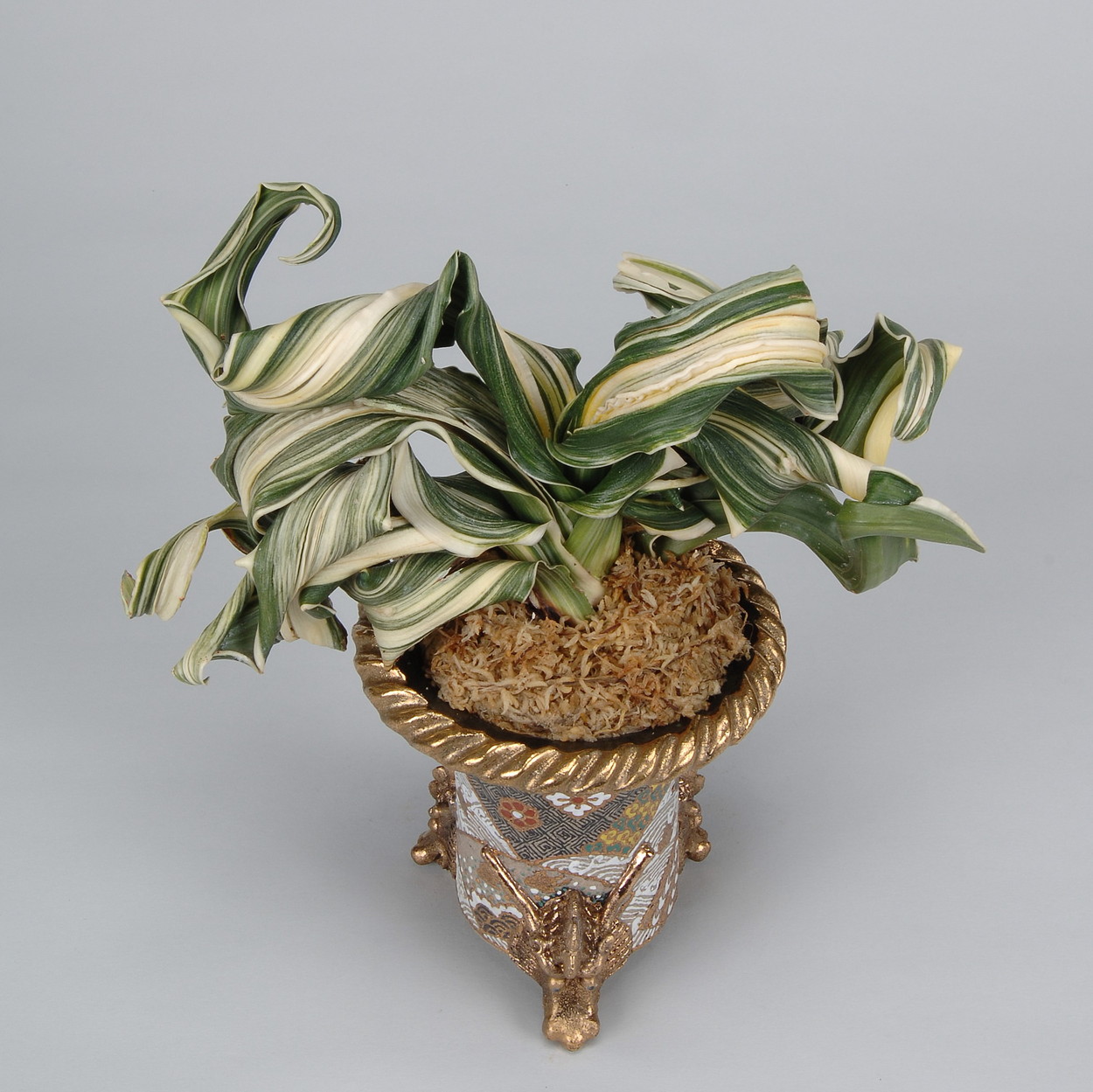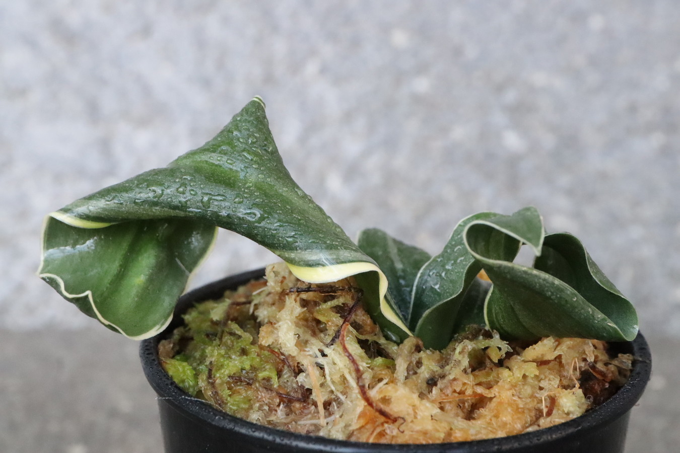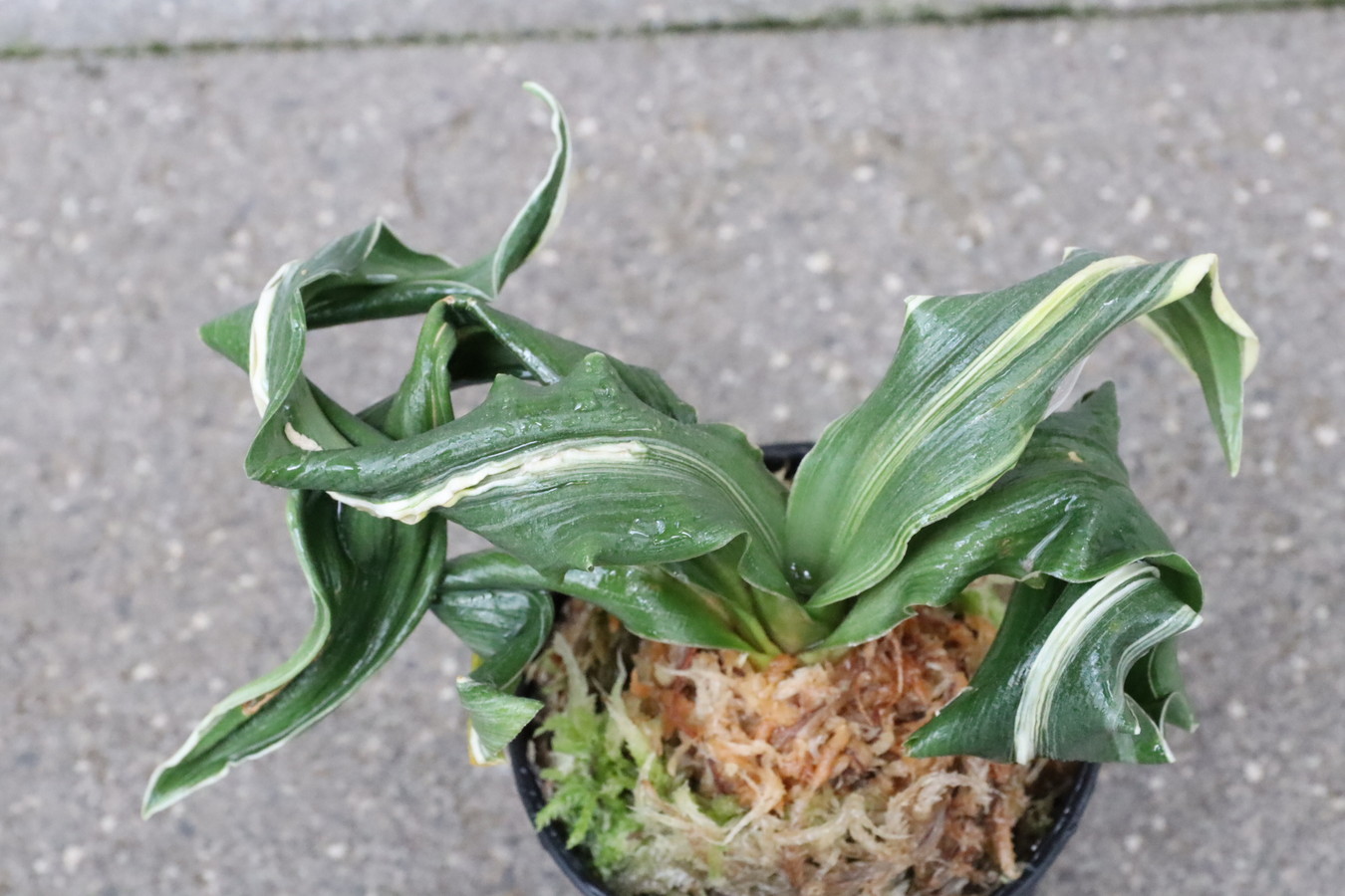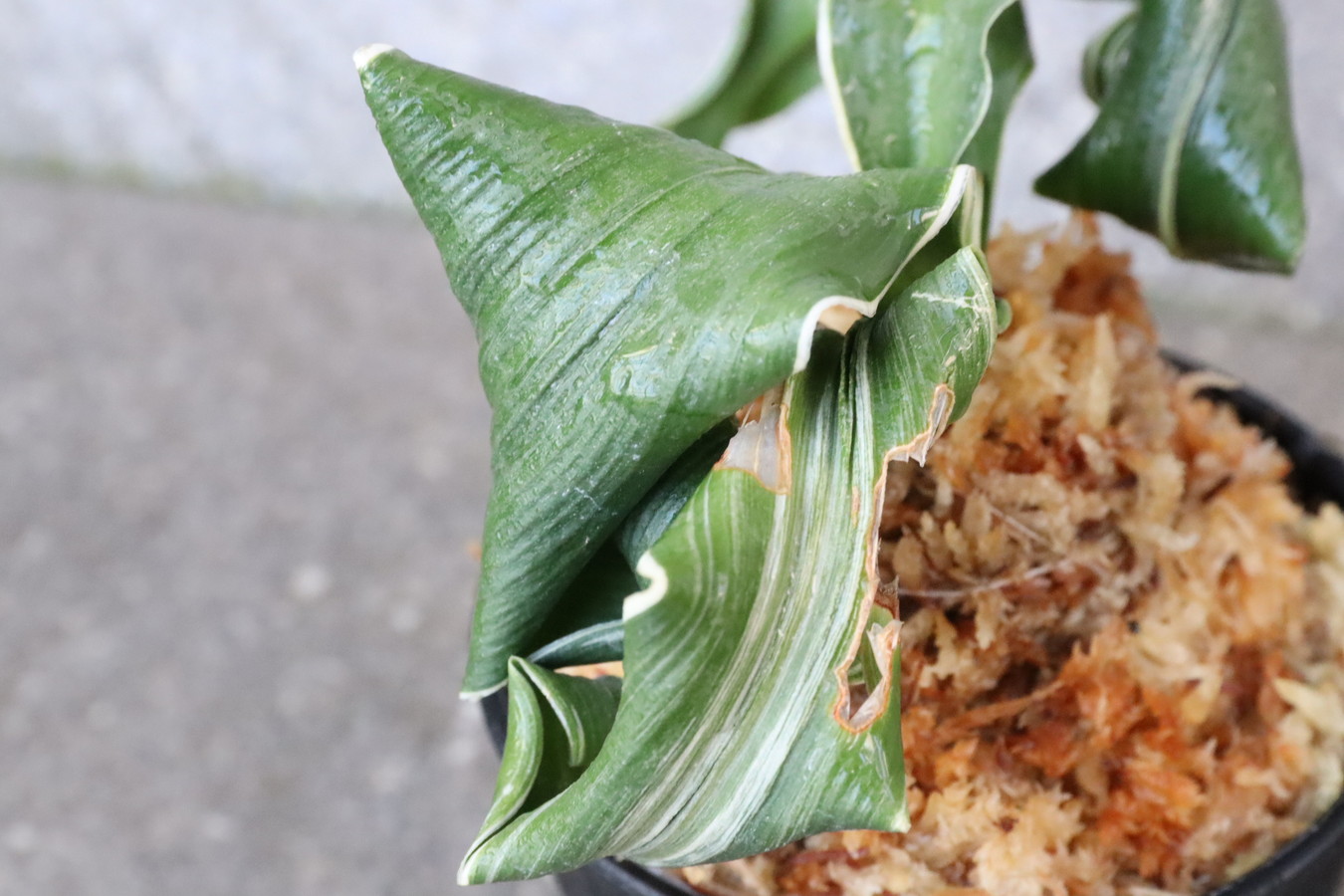 厚い葉肉に白い雅糸竜・玉竜を現す。力強い角巻きの葉は竜が暴れているような迫力を感じさせる角巻獅子の代表種。古くからあるので、青、縞、覆輪、縞覆輪と柄に様々あるが、数の少なさから縞覆輪が最高の人気を呼んでいる。縞覆輪では性質は普通、肥料は控えめのほうがよい。子上げも良いが、芋吹きが主。
