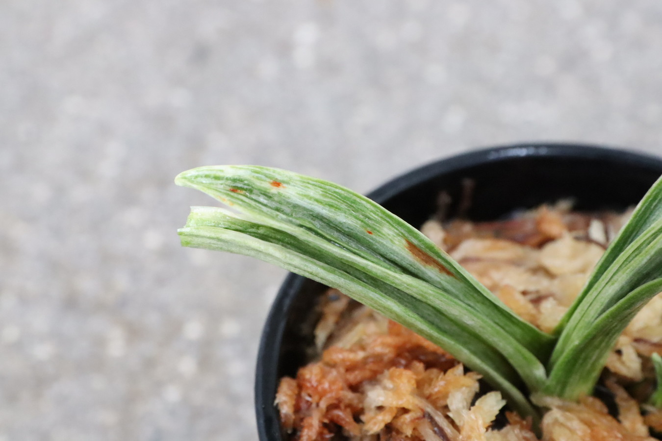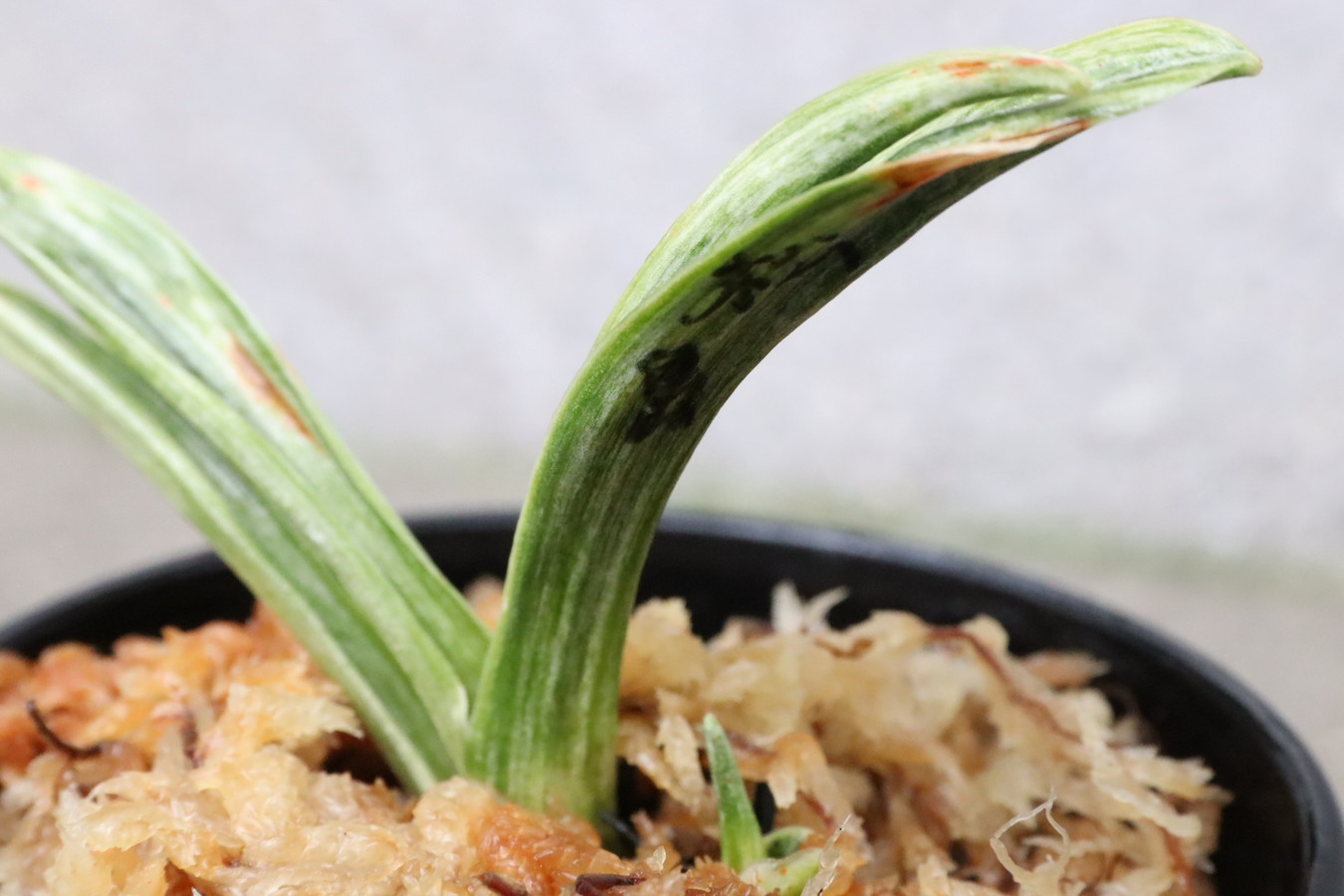 葉の全面を雅糸竜が覆うこともあり、芸非常に強い。日の具合がちょうどよいと、葉の半分が千代田斑に、半分が雅糸龍になり、時おり、玉龍を見せる。葉先はとがる。