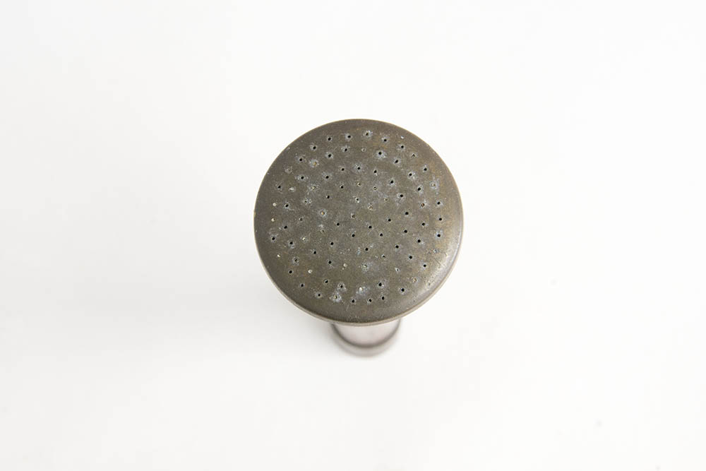 銅製如雨露は、銅の殺菌力により水を腐りにくくし、水に溶け出す銅イオン効果により、盆上の苔の生育がよくなる特徴があります。雨水をためた水瓶などから常温の水を汲む際、葉やごみなどが浮いても、入り込まないよう、給水口に「こし網」を付けています。如雨露の竿を長くすることで、水の圧力をコントロールし、水圧が一定の安定した散水ができます。