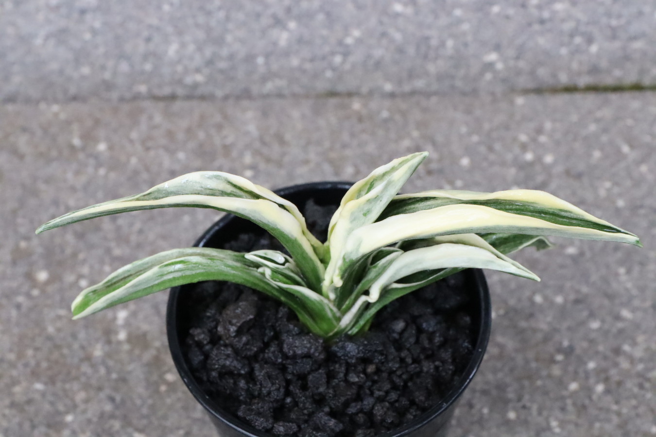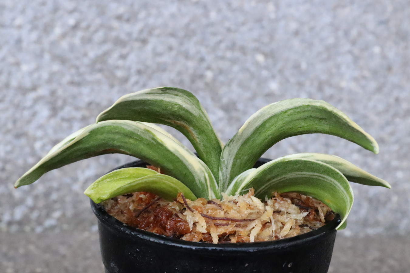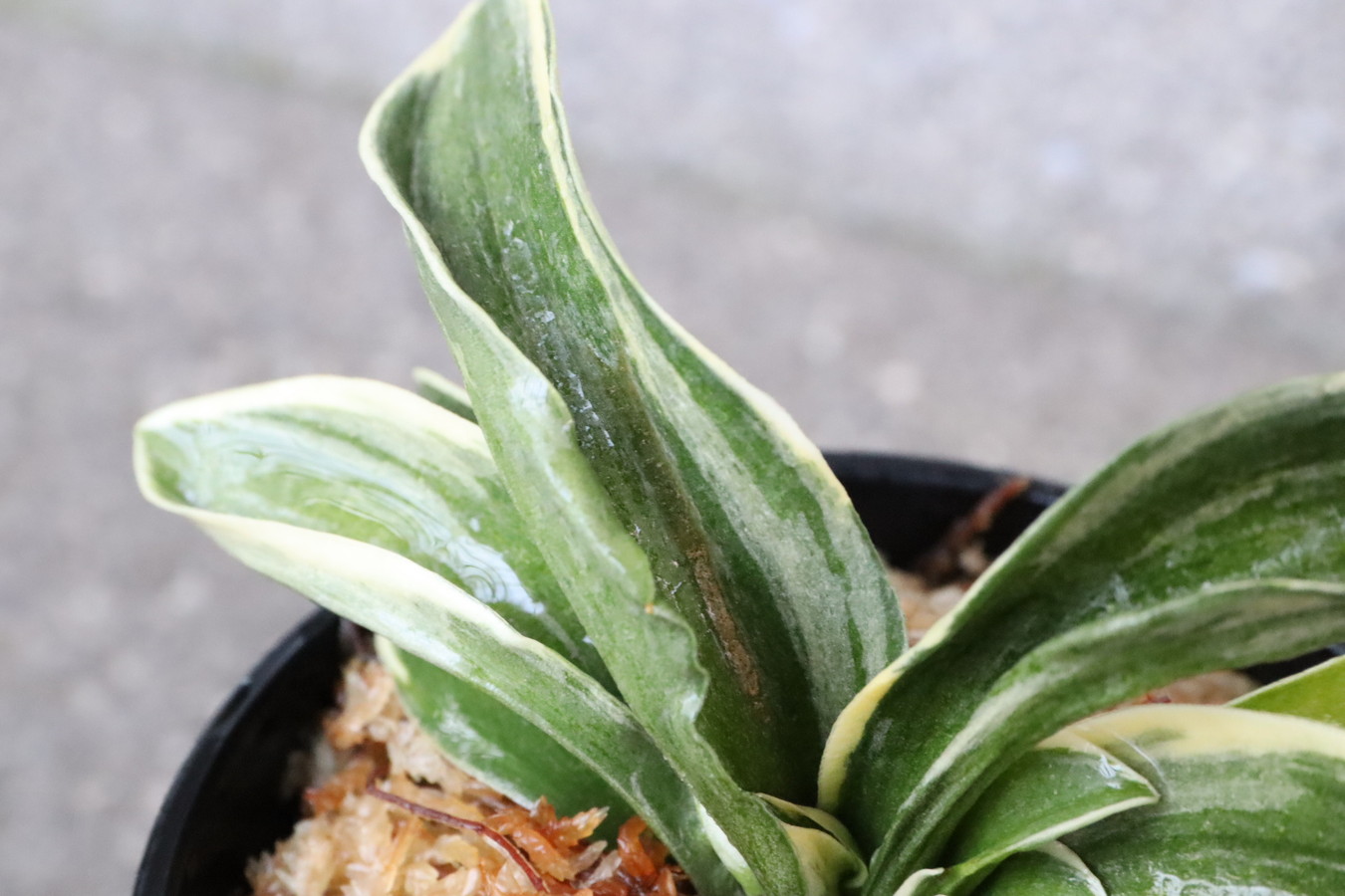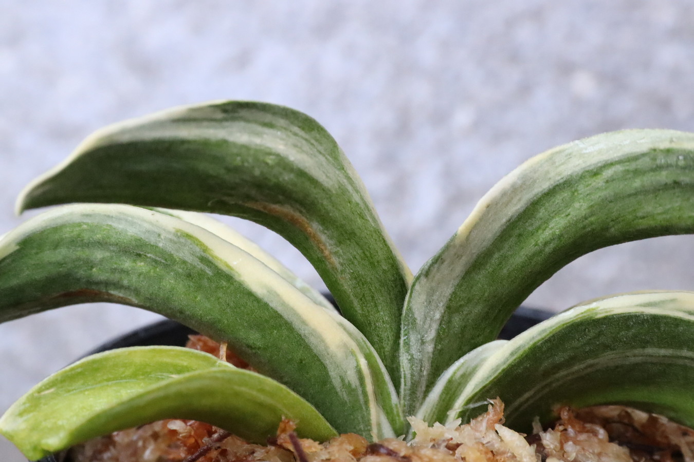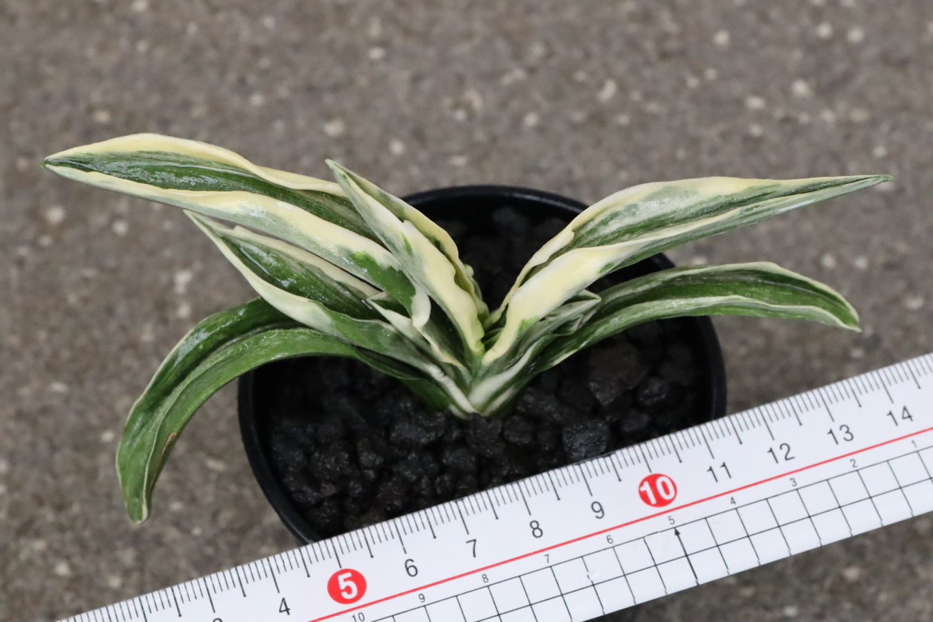 小型の木に、熨斗葉、特徴的な深い覆輪を見せる
