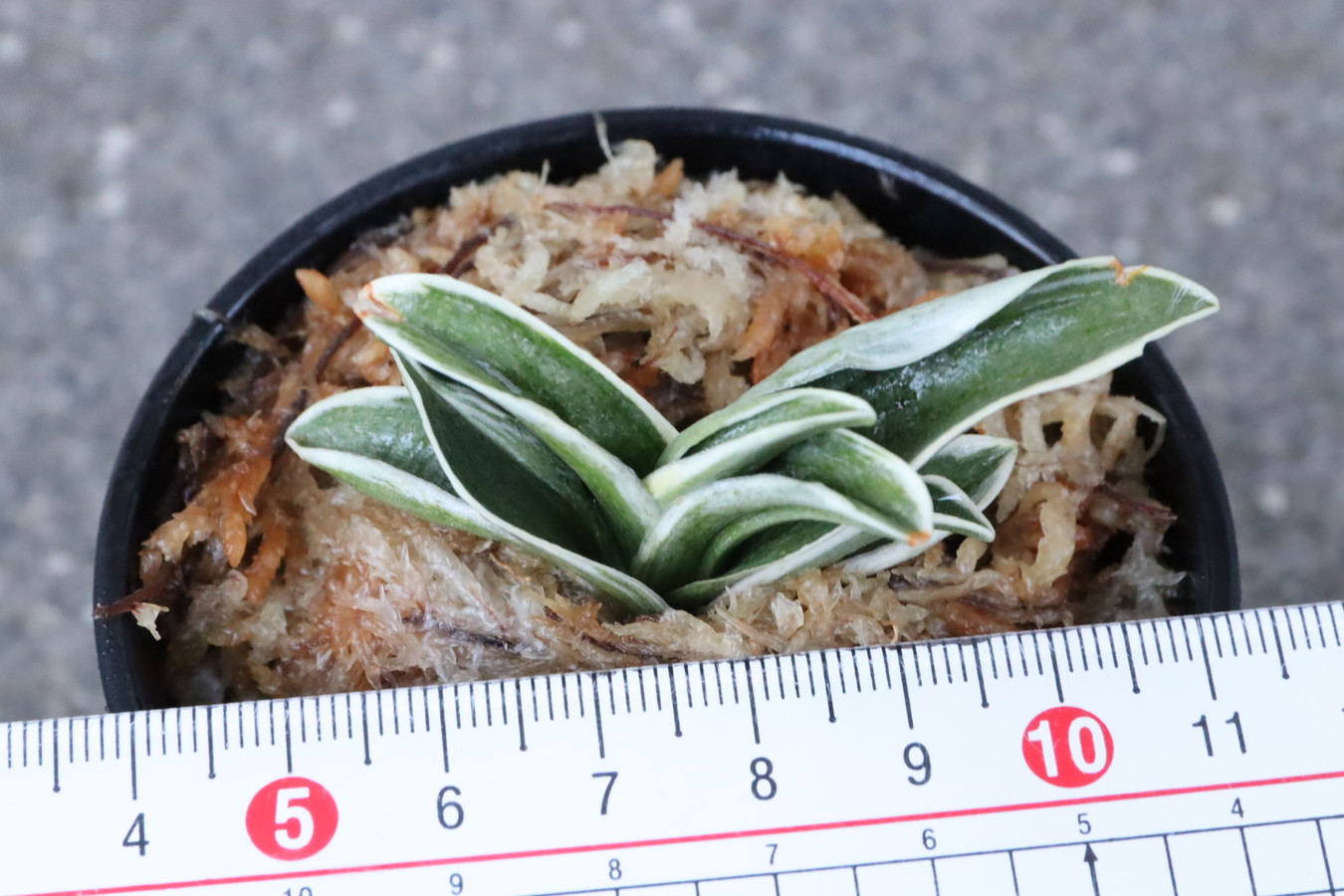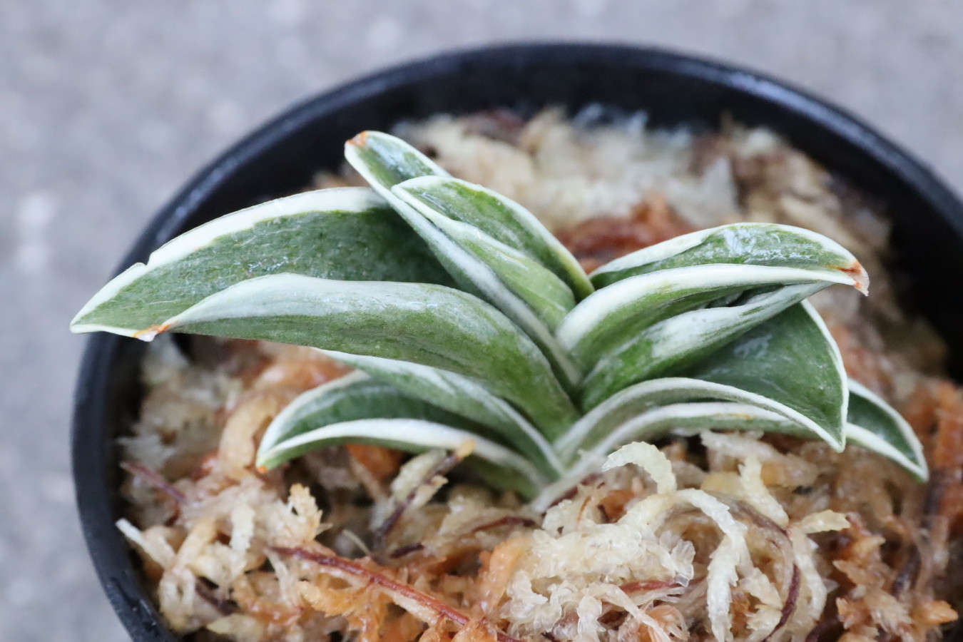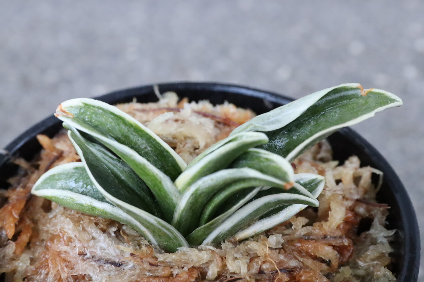 純白の覆輪からの特上芸をみせる、中型種で葉肉厚く丸葉型、濃緑色の艶消しの地合い性質は強健品種。特徴がはっきりしている丈夫な品種