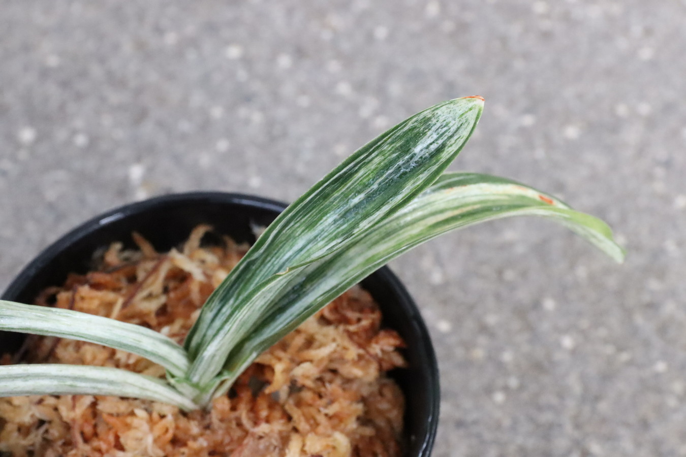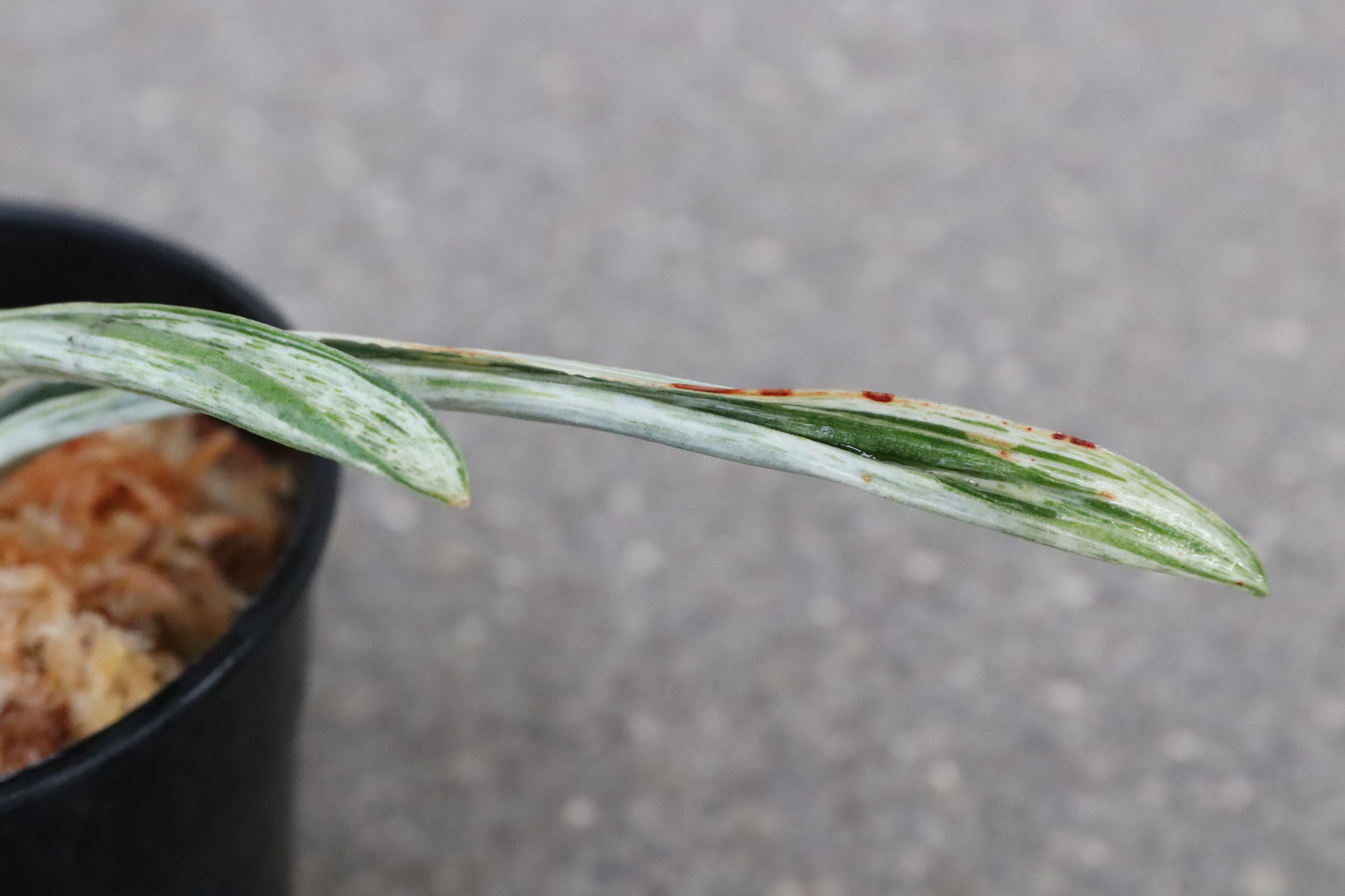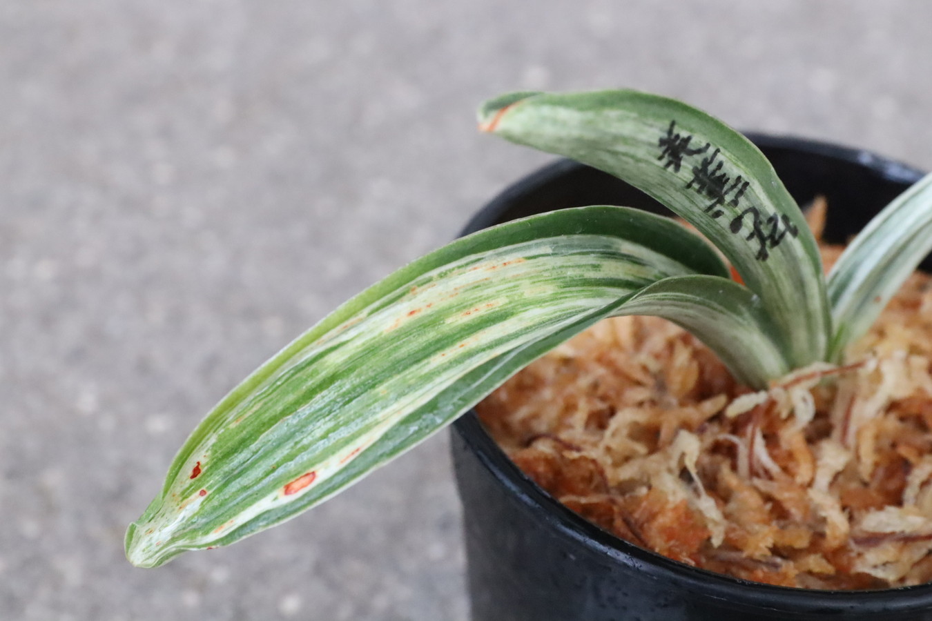 葉の全面を雅糸竜が覆うこともあり、芸非常に強い。日の具合がちょうどよいと、葉の半分が千代田斑に、半分が雅糸龍になり、時おり、玉龍を見せる。葉先はとがる。