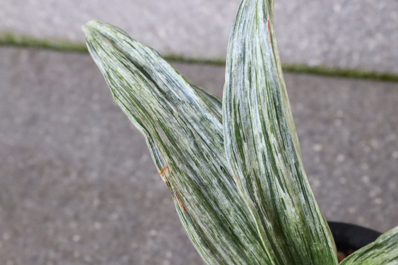 葉の全面を雅糸竜が覆うこともあり、芸非常に強い。日の具合がちょうどよいと、葉の半分が千代田斑に、半分が雅糸龍になり、時おり、玉龍を見せる。葉先はとがる。