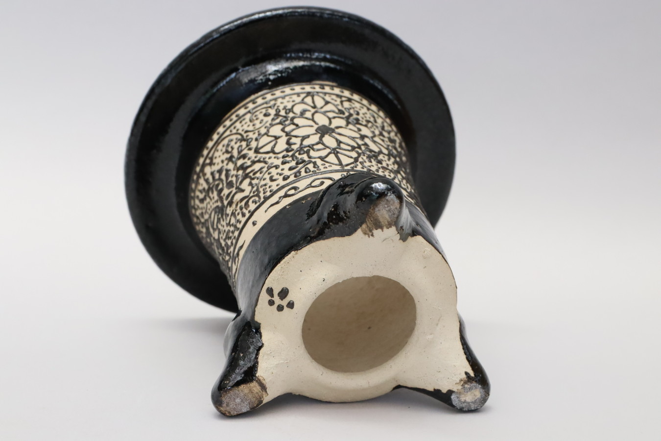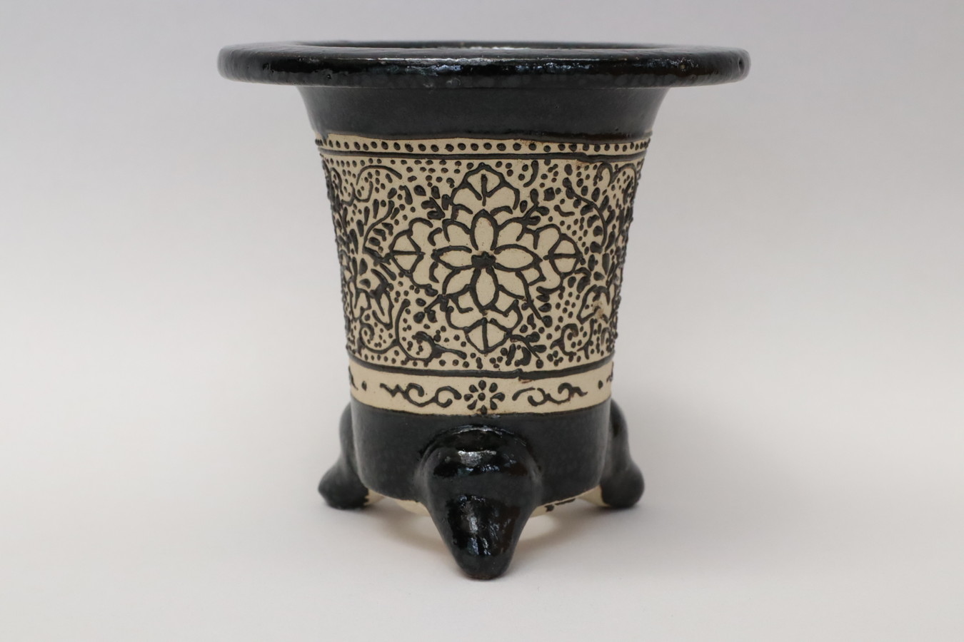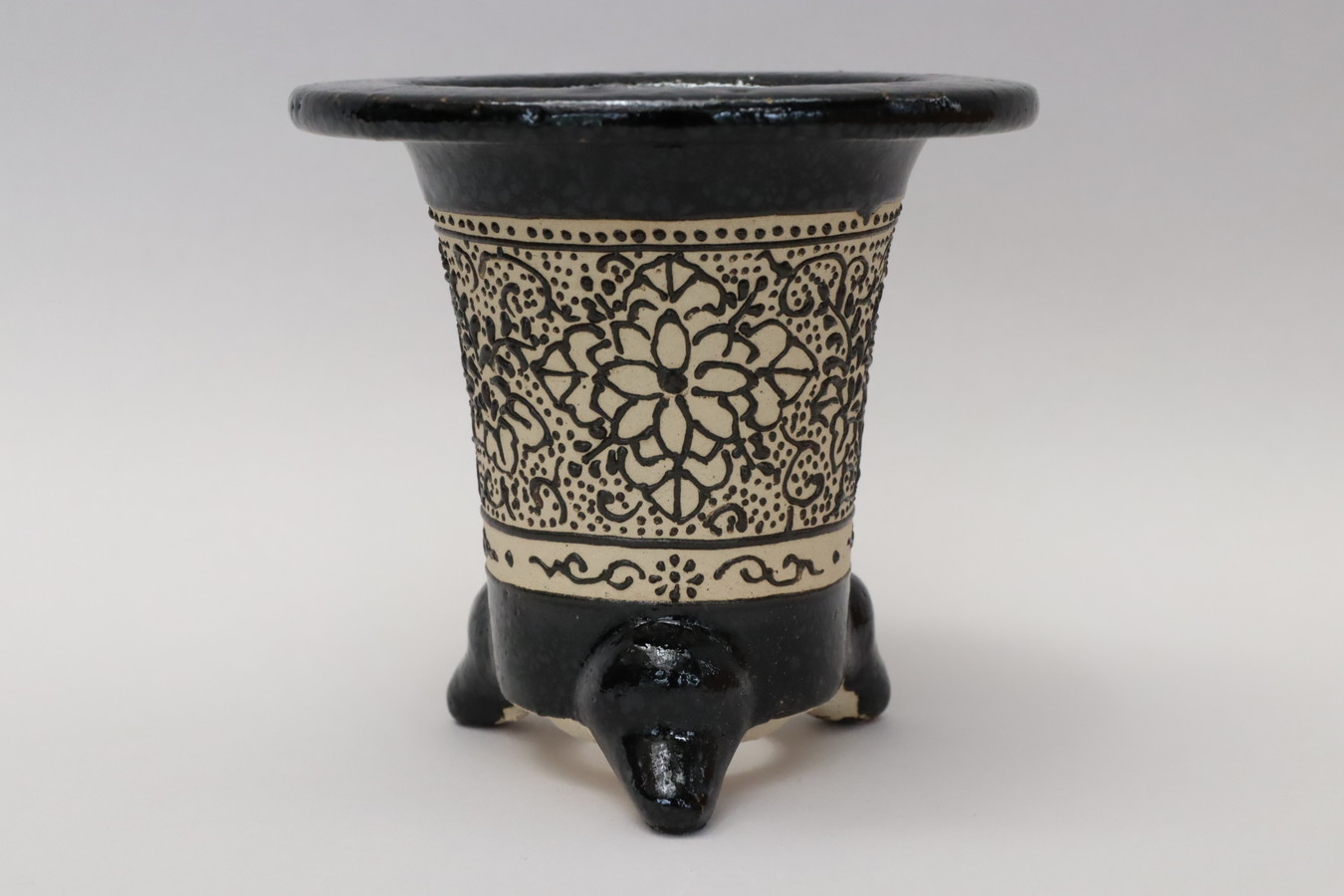 黒釉薬の艶が良い この鉢独特の釉薬の飛びがある