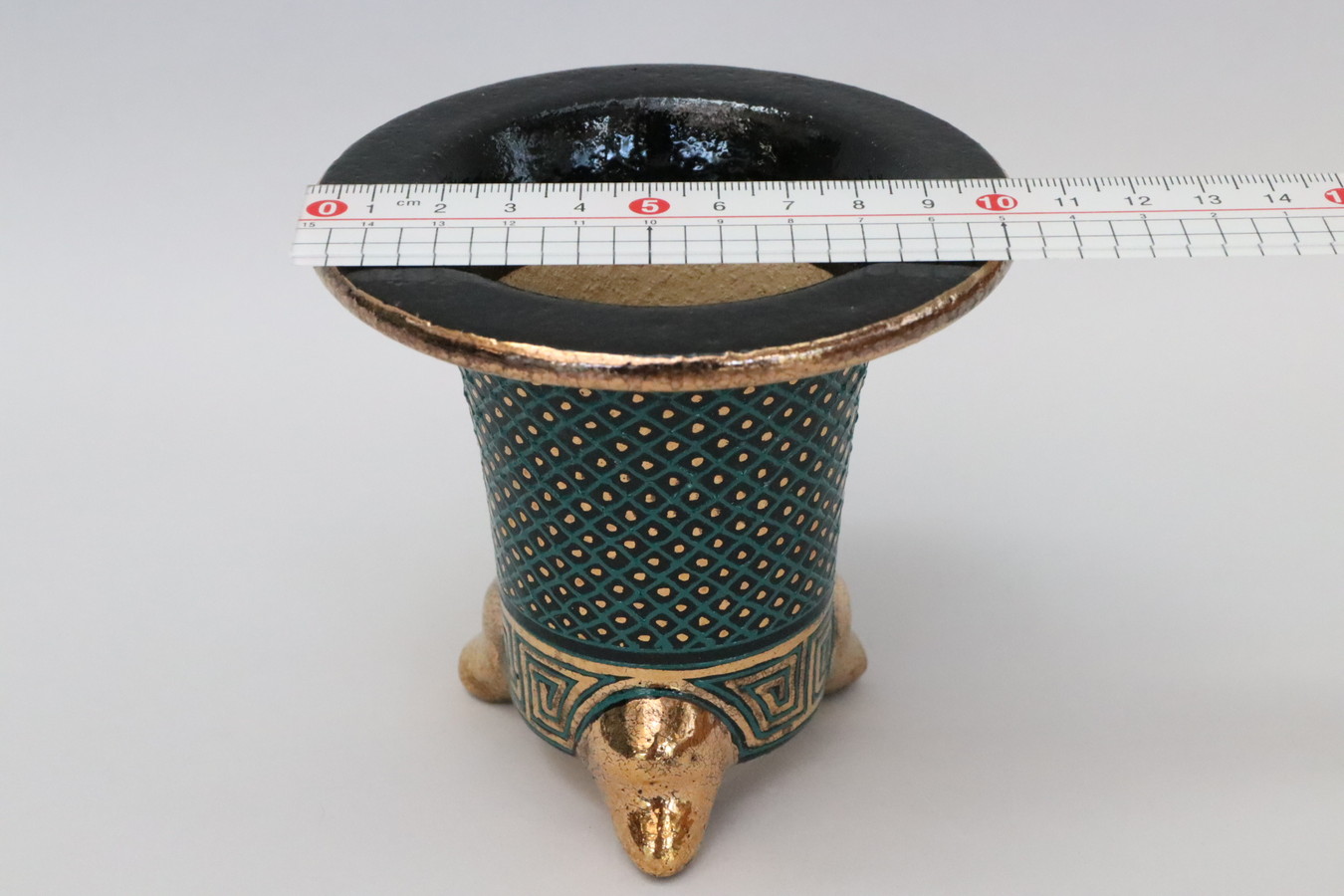 古くから使われるおもと錦鉢の柄。もとは、小さな輪の文様の集まりが、魚の卵を連想させる事から、「七子」「魚子」「斜子」などの字があてられている。古くからある柄のようで、延宝六年(一六七八)の加賀藩の工芸標本『百工比照』の中に、「ななこ」の名称が見られる。また小浜藩の藩医が延宝年間に記した書物にも「魚子塗」の言葉が見える。鉢の柄は渋く、おもとを引き立てる、ということで古くから愛され、使われてきた。単純な柄ゆえ、その作家さんの技量もでて、素晴らしい物は古いものはもちろん、新しい物も価値が高い。格子の中の点である、金の絵具は、絵付けの時は黒く、地の鉢も黒鉢で、必ずといっていいほど目残しがある。手間も非常にかかる鉢でもある。古くからあるので、描き方も様々。