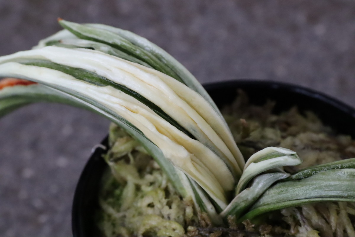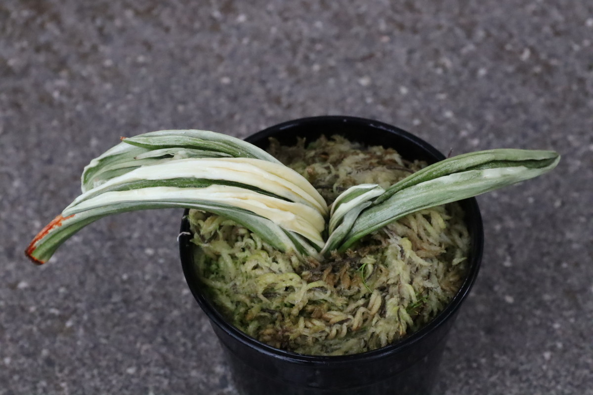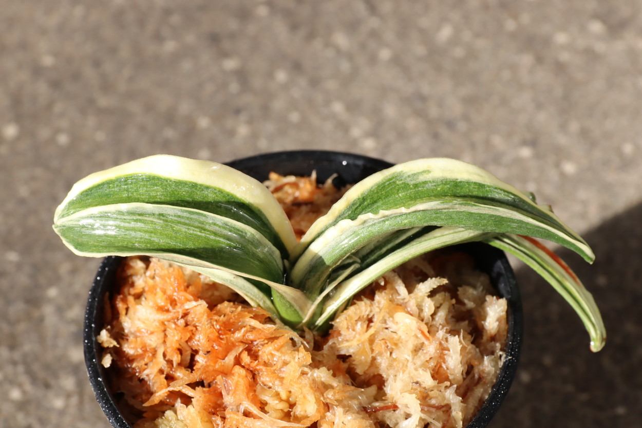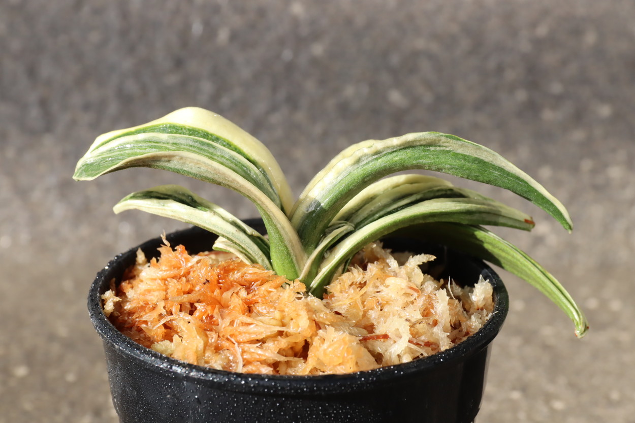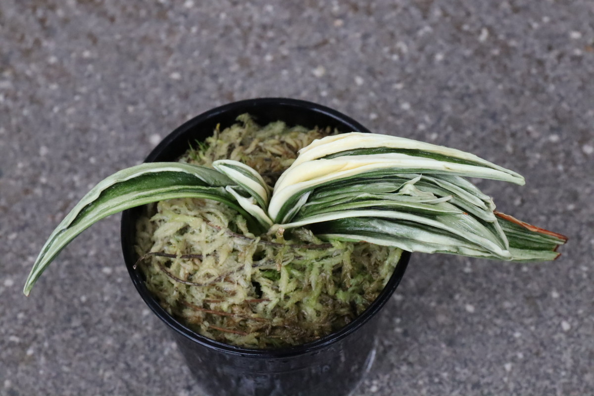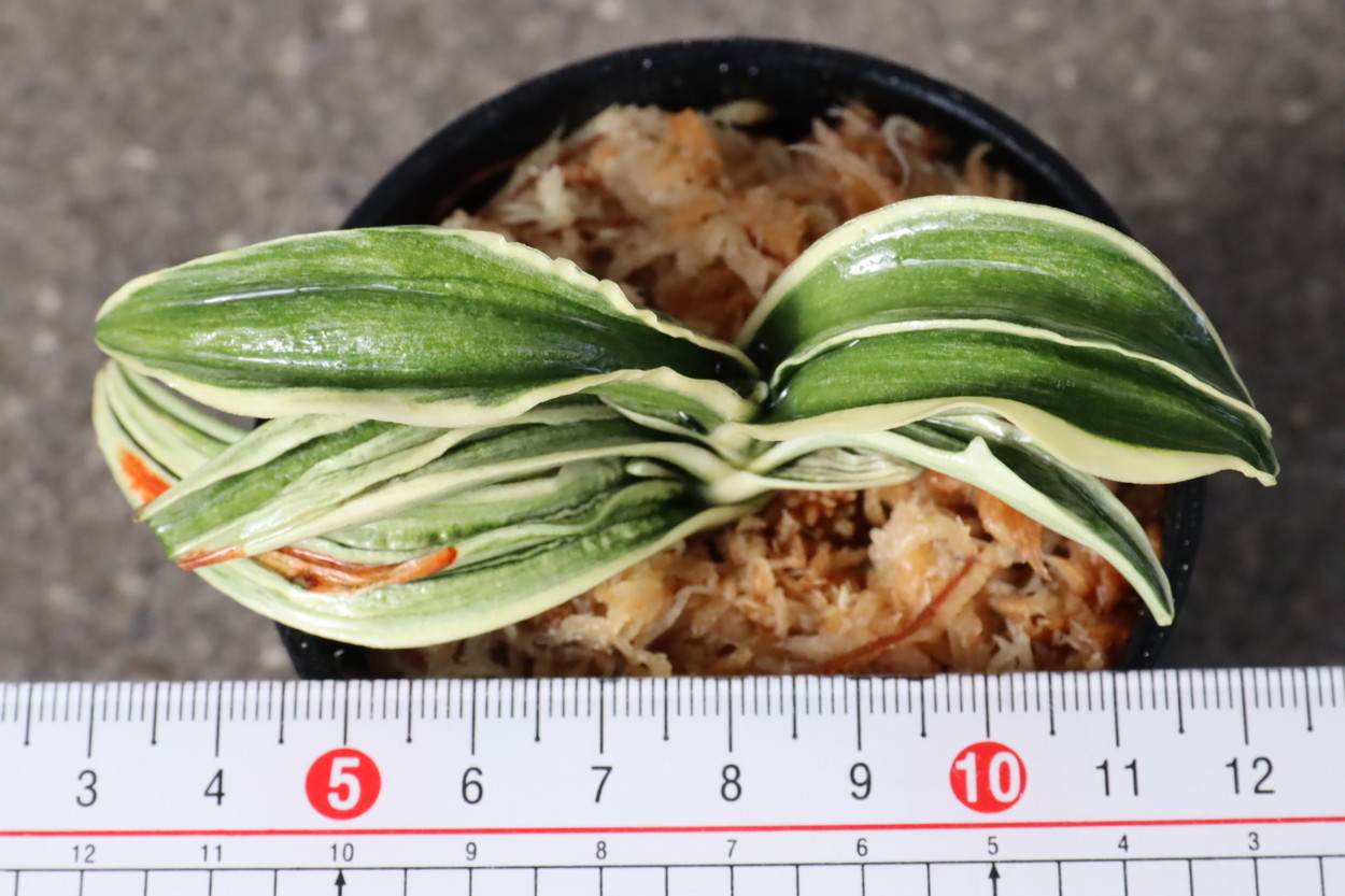 奈良錦(ならにしき) 葉長7㎝、葉幅3㎝内外の中型種。首元が太く、腰折れの良い中立ち葉の容姿に、葉先は丸止めになる。地合いは粗れ地で、深い覆輪がかかり、熨斗葉、甲竜を主体にした葉芸は、年とともに雅糸竜、跳ね竜、玉竜など多彩な芸を現し、個性的で作り込む楽しみがある。性質は丈夫で作りやすく、繁殖も良い。採光は強めで良い。作出後かなり年数がたつが、最近全国的に数が少なく、質を思うと価格的に割安なため、じっくりと作り込むマニアにお勧めしたい。
