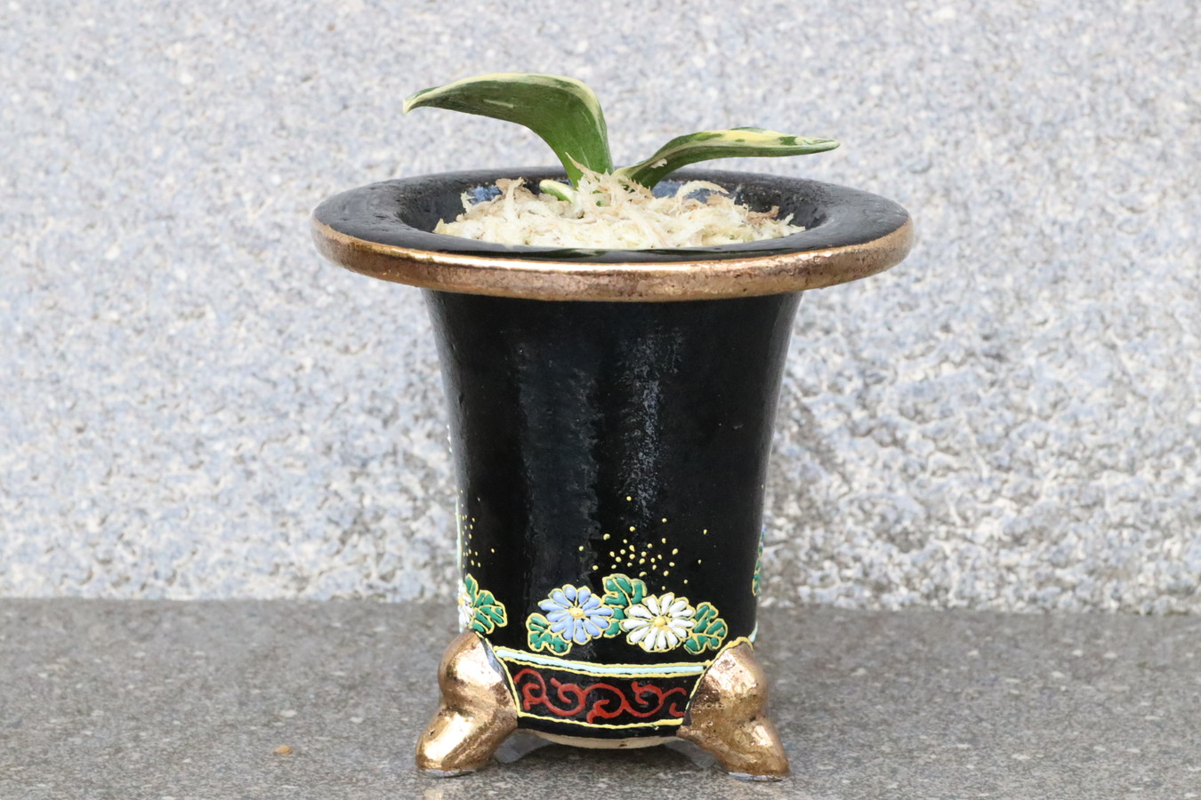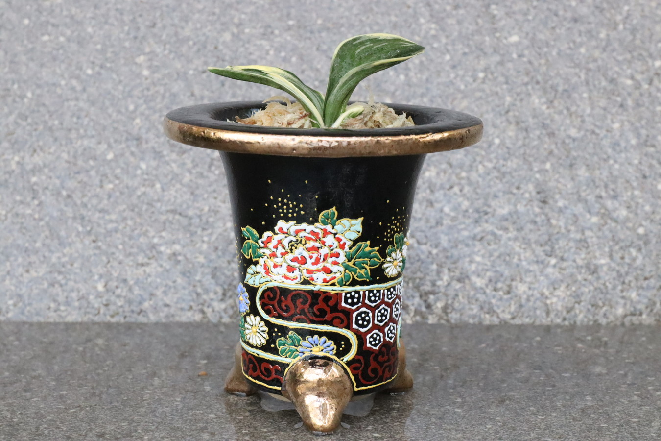 長命、寿を願う【菊】や【牡丹】、繁栄を現す【唐草】や本人の守護や魔除けを意味する【亀甲】など、吉祥を願い、デザインされた祝い鉢。手作り鉢。