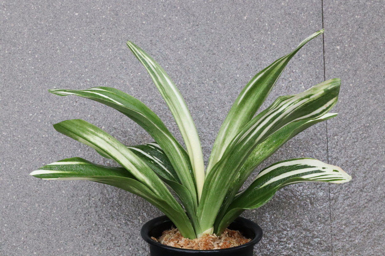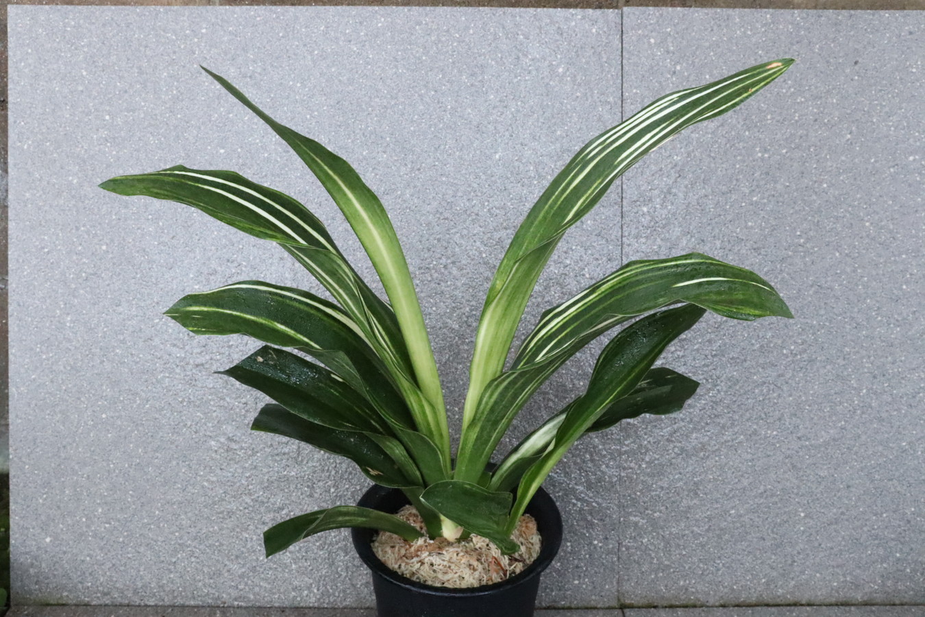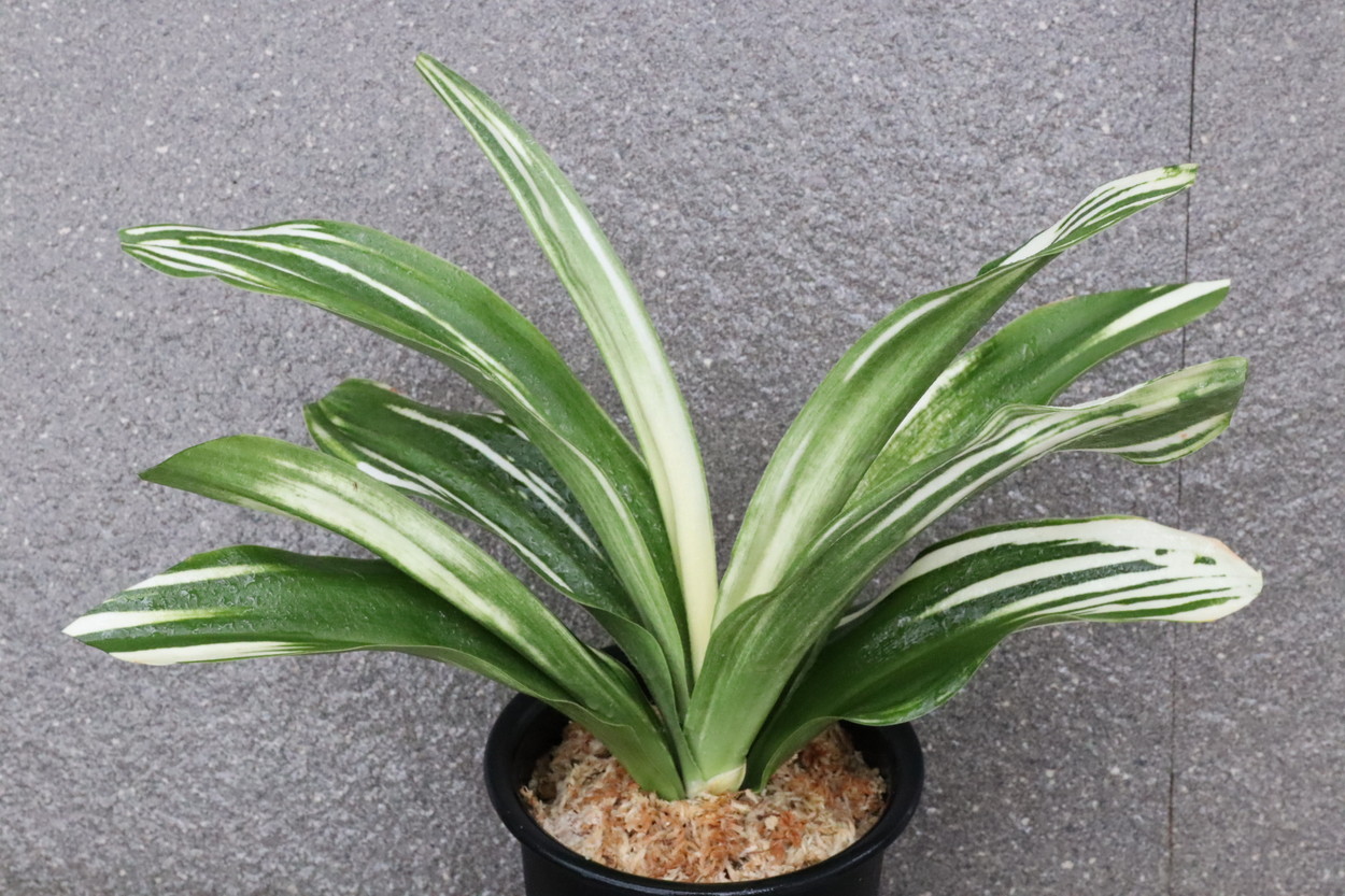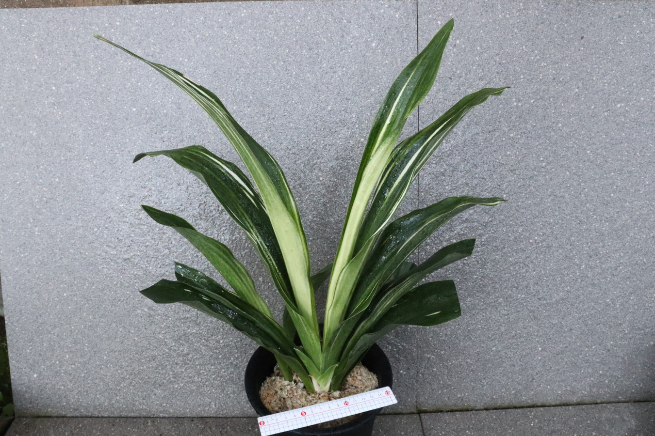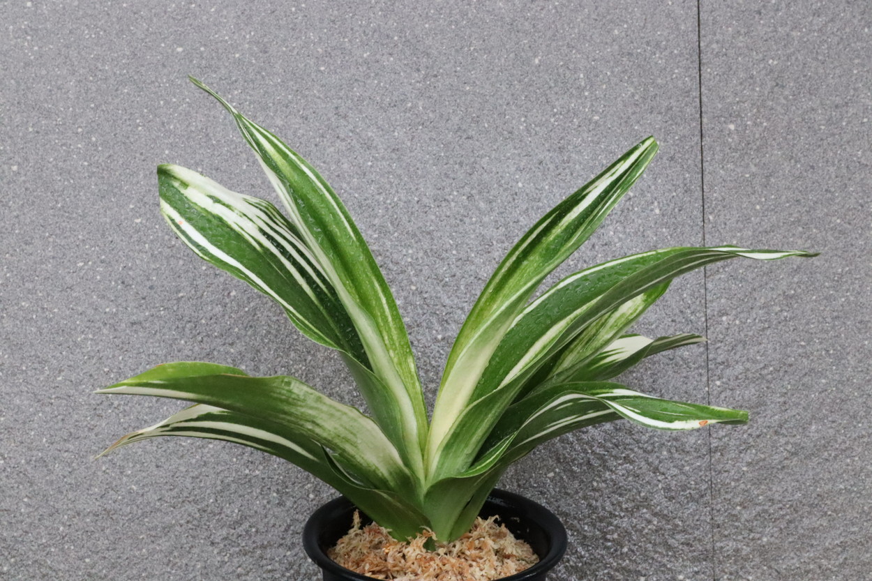 広い葉幅に曙柄、流れるような白虎柄を見せる。