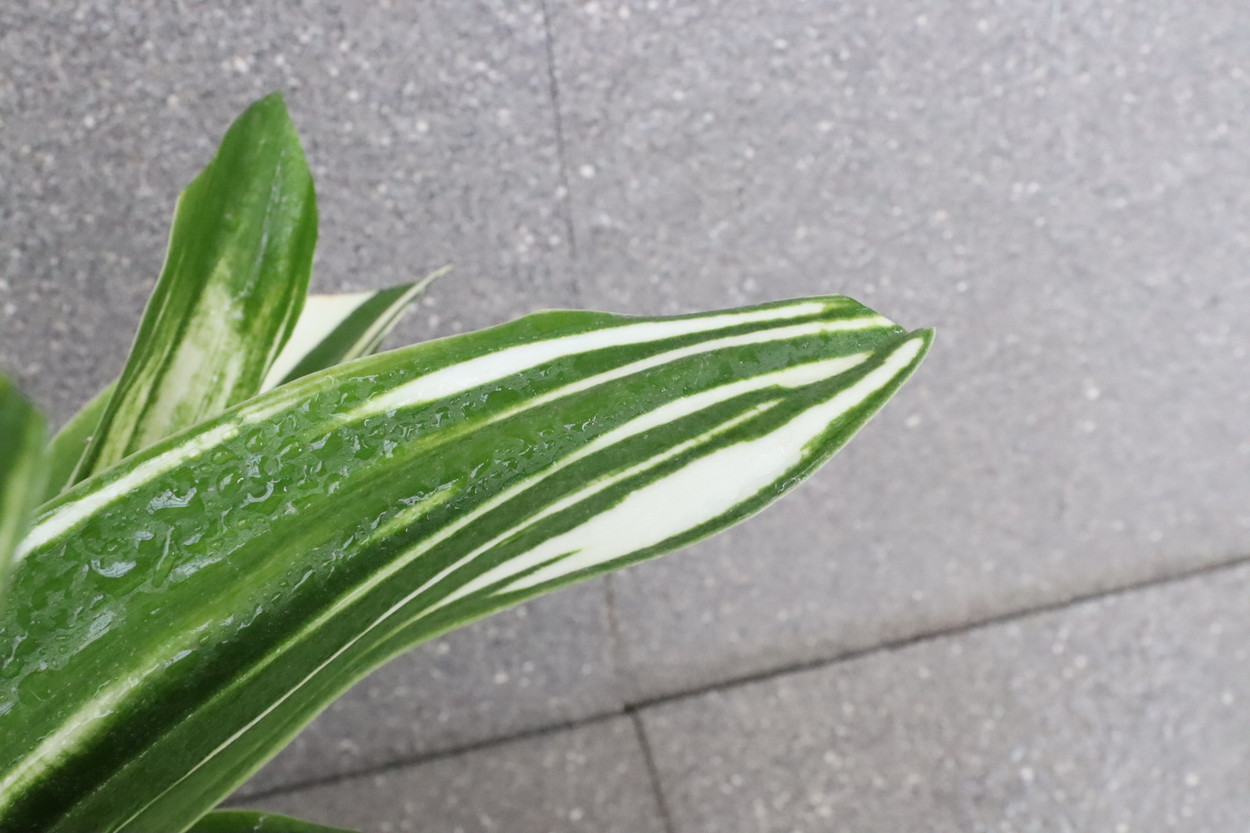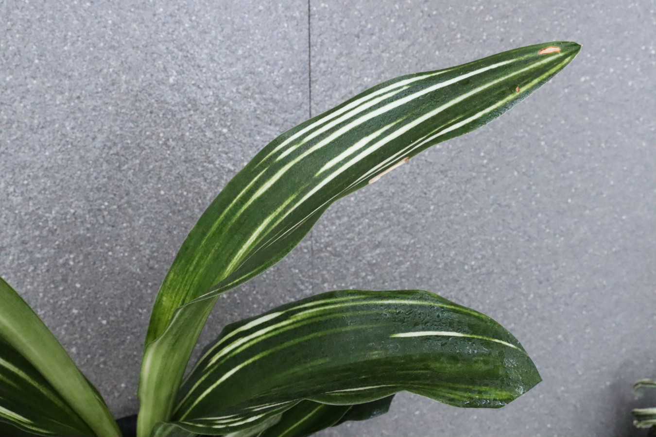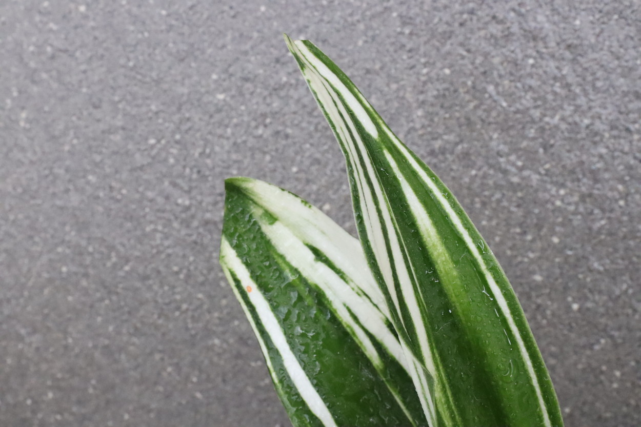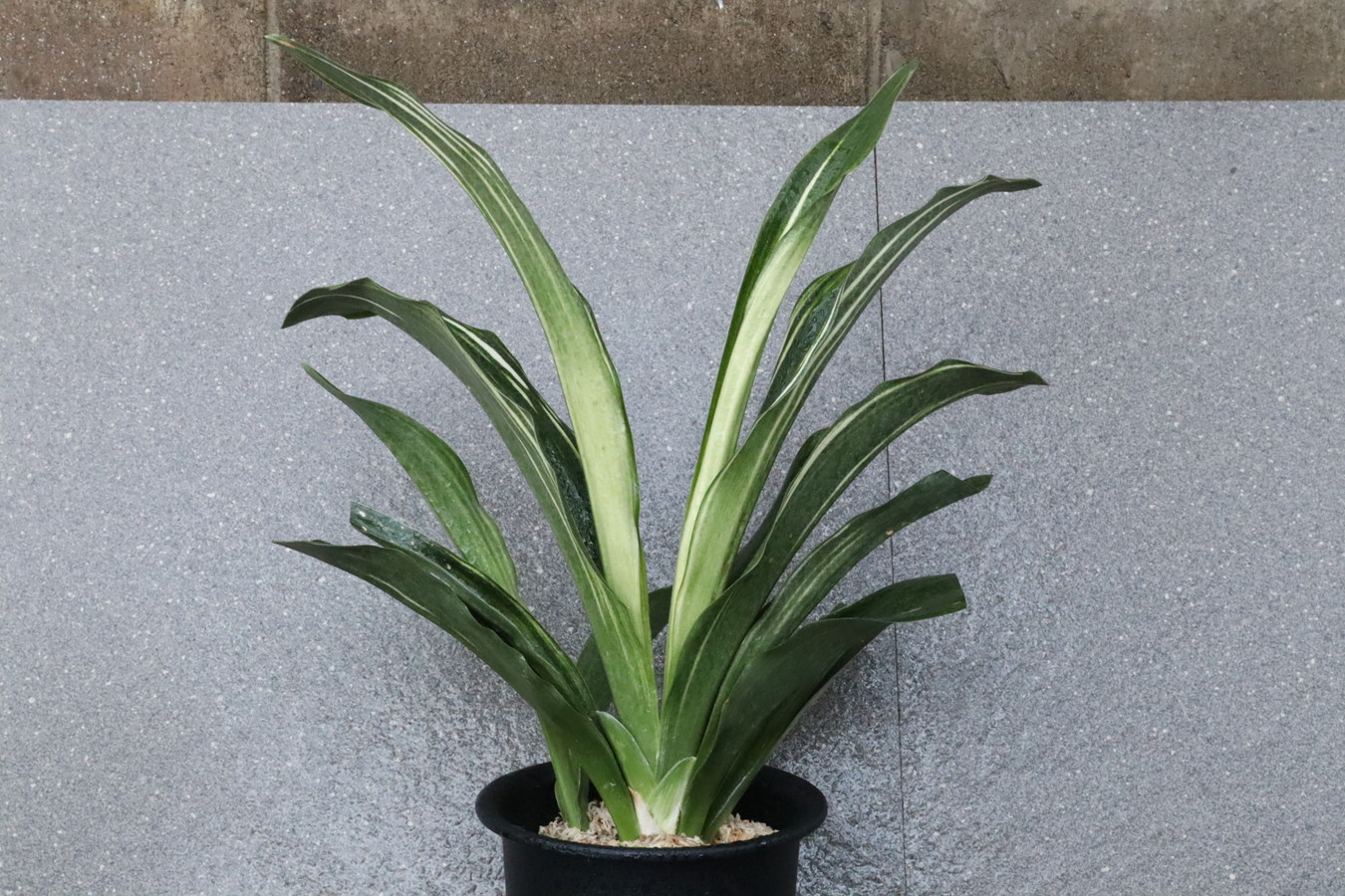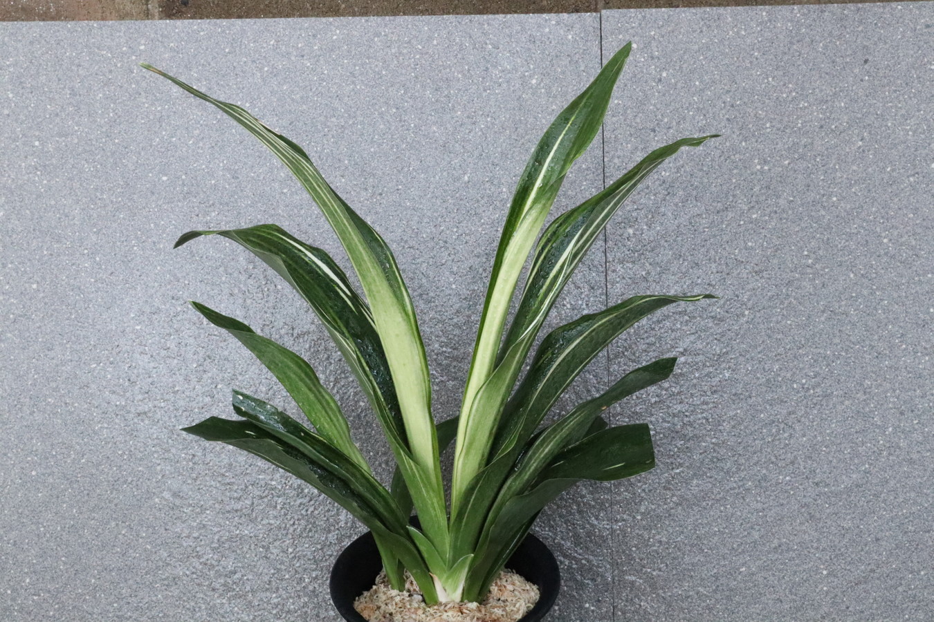 広い葉幅に曙柄、流れるような白虎柄を見せる。