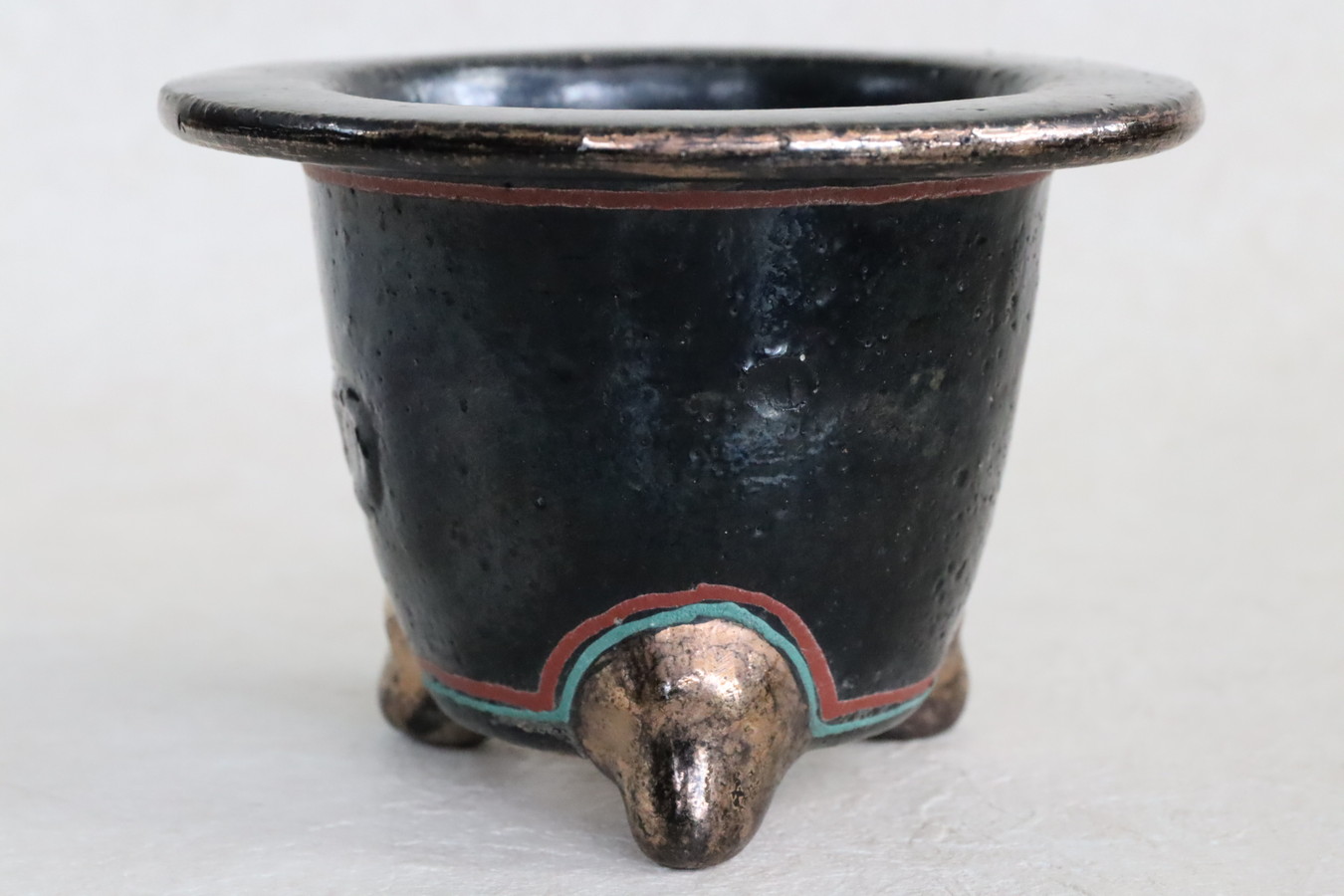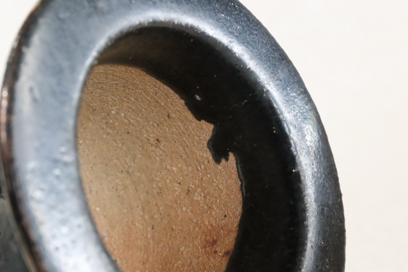 作家さんの大切にしているコレクションから特別に分けていただいたもの。土も非常に古く、加茂黒味あり、形素晴らしい。古鉢のコレクターはこの黒だけ、土の地合いだけで酒が呑めるというが、本当にその通りの出来。もう一段か二段古いと文化財クラスか。