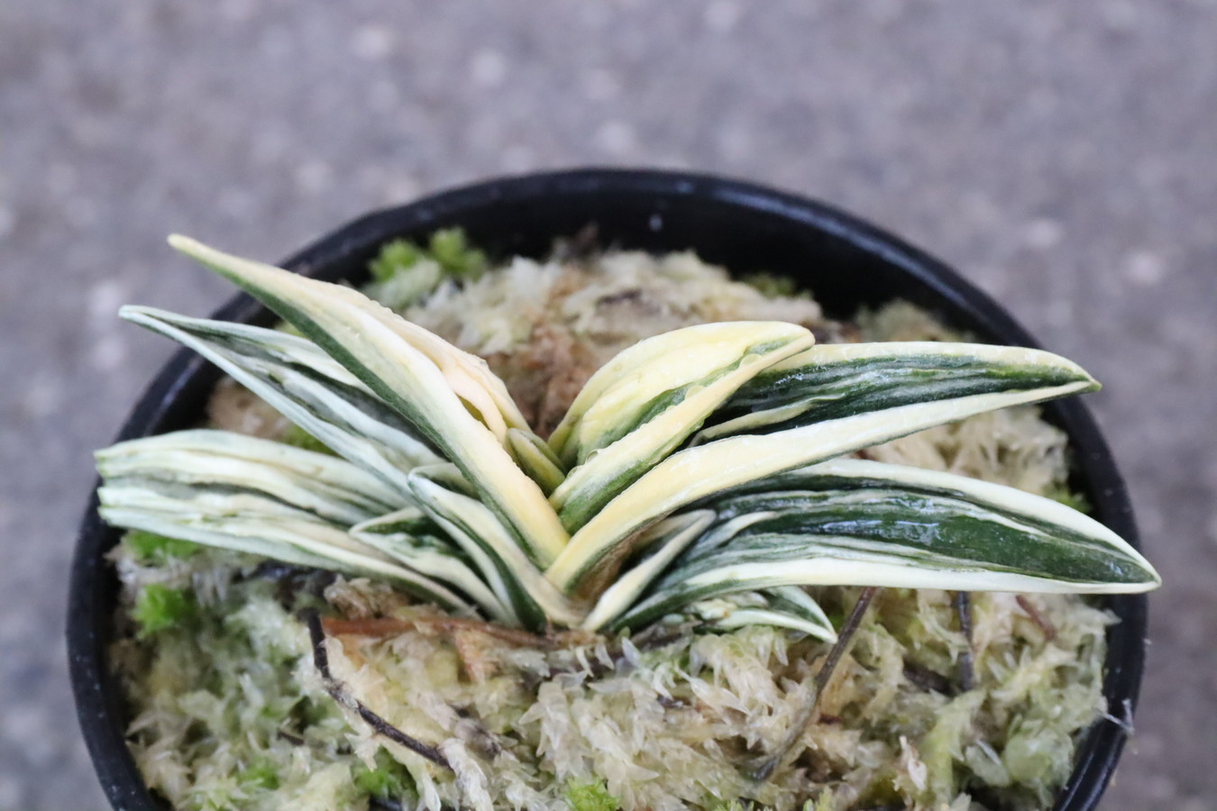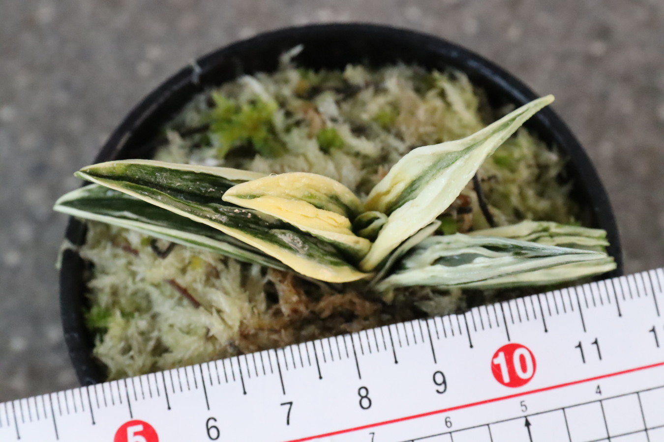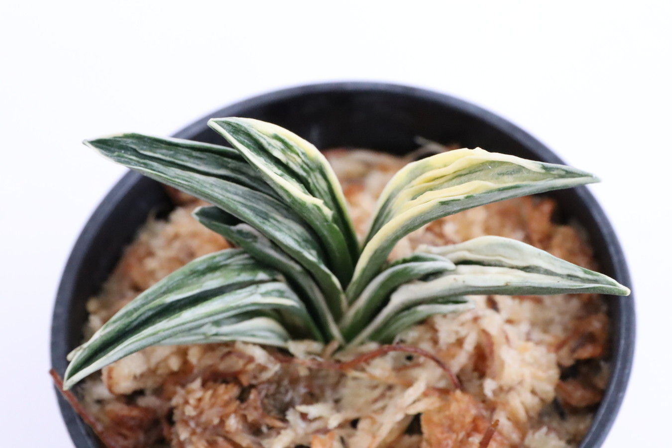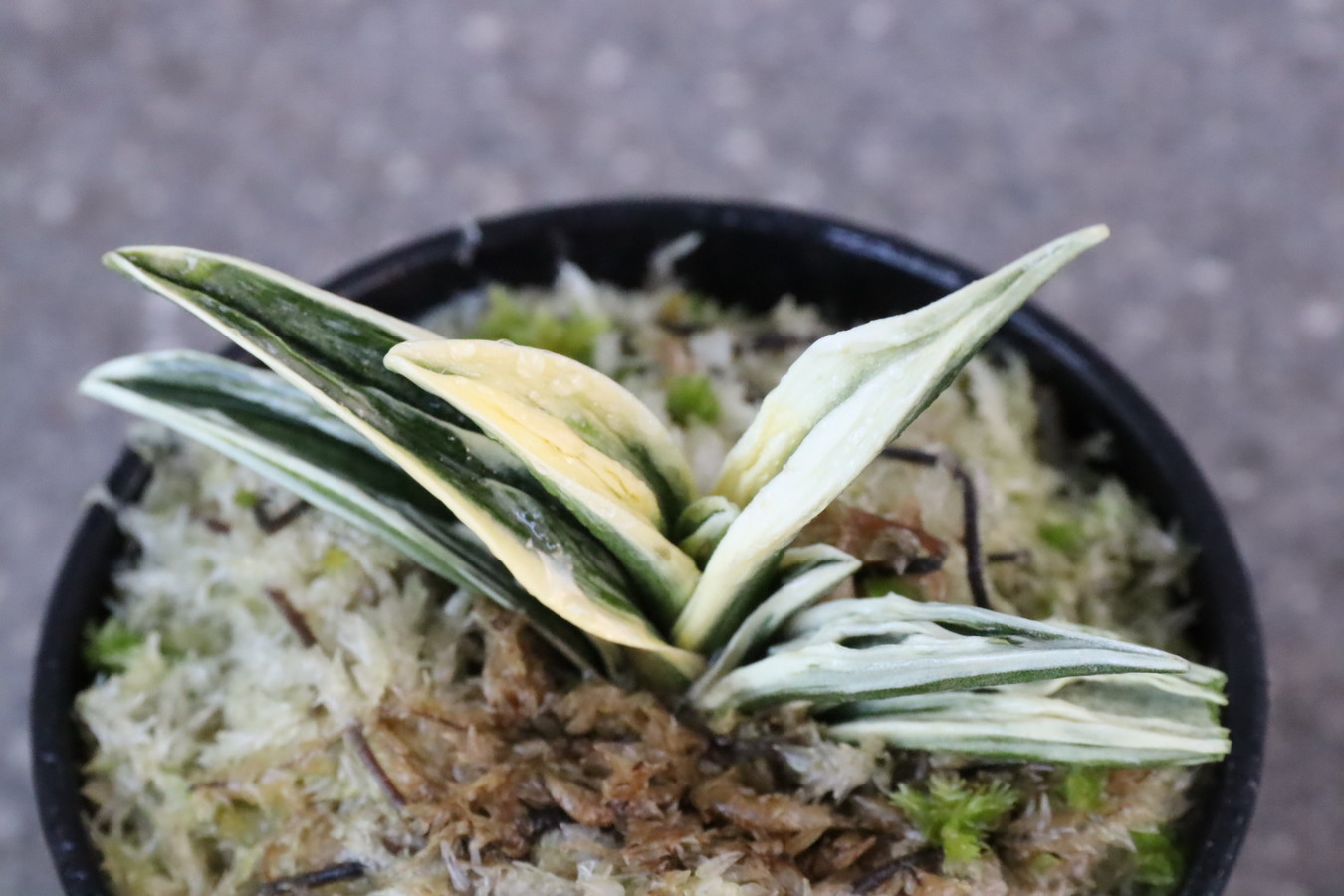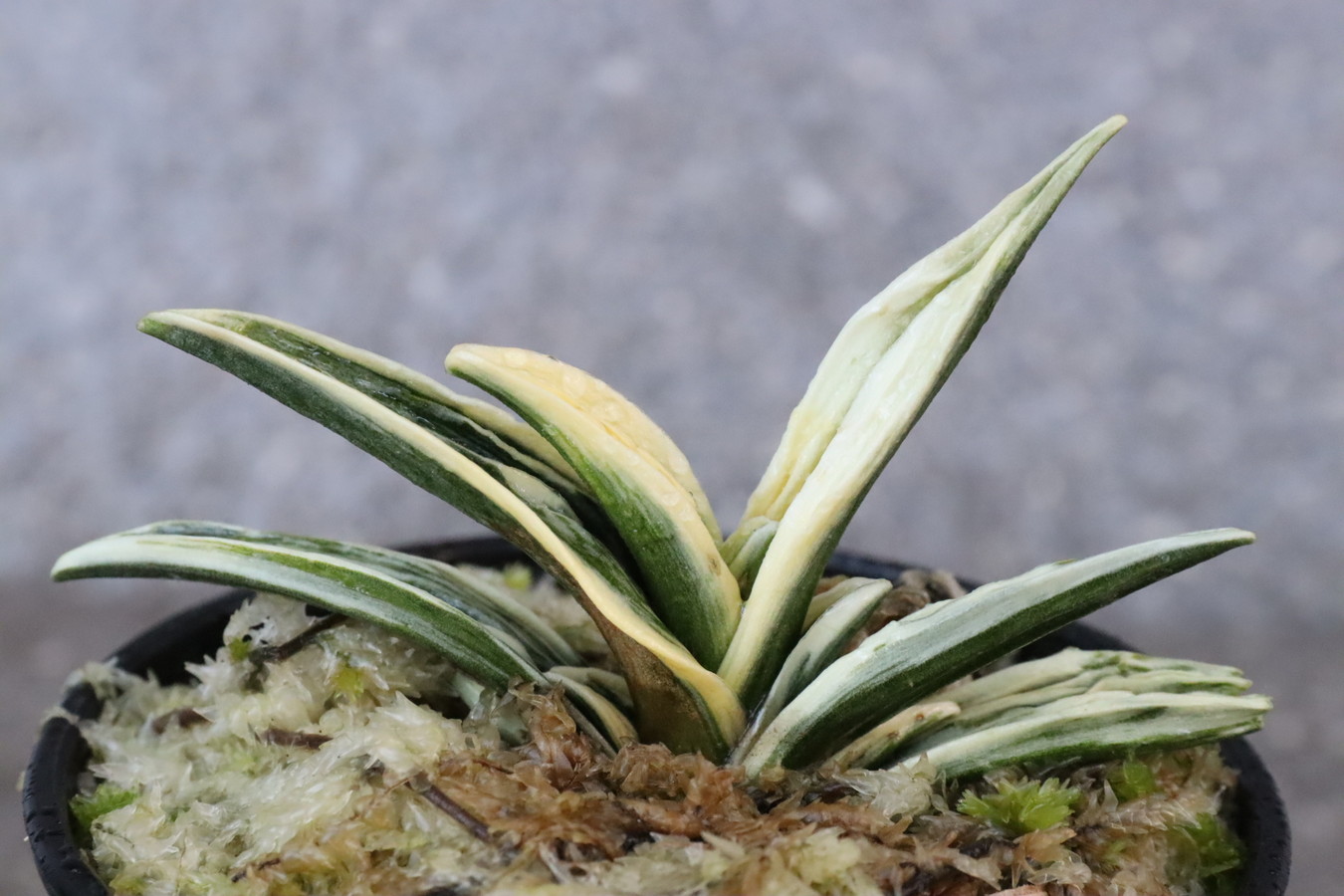 鋭い葉先、純白の雅糸竜は盛り上がり、肉厚の羅紗らしい葉をみせる。小型でしまった姿は、本種のきりりとした魅力を引き出している。若いうちの紺地の強い緻密な地合い、葉姿の乱れることのない端正な姿も魅力の作り易い品種。性質は強健、採光、肥料は強め。芋吹き良く吹き上がり、子上げもする。