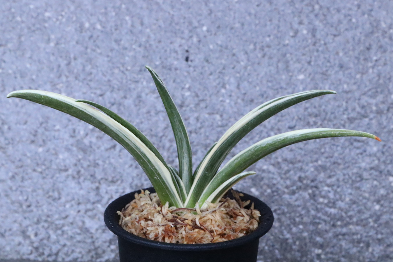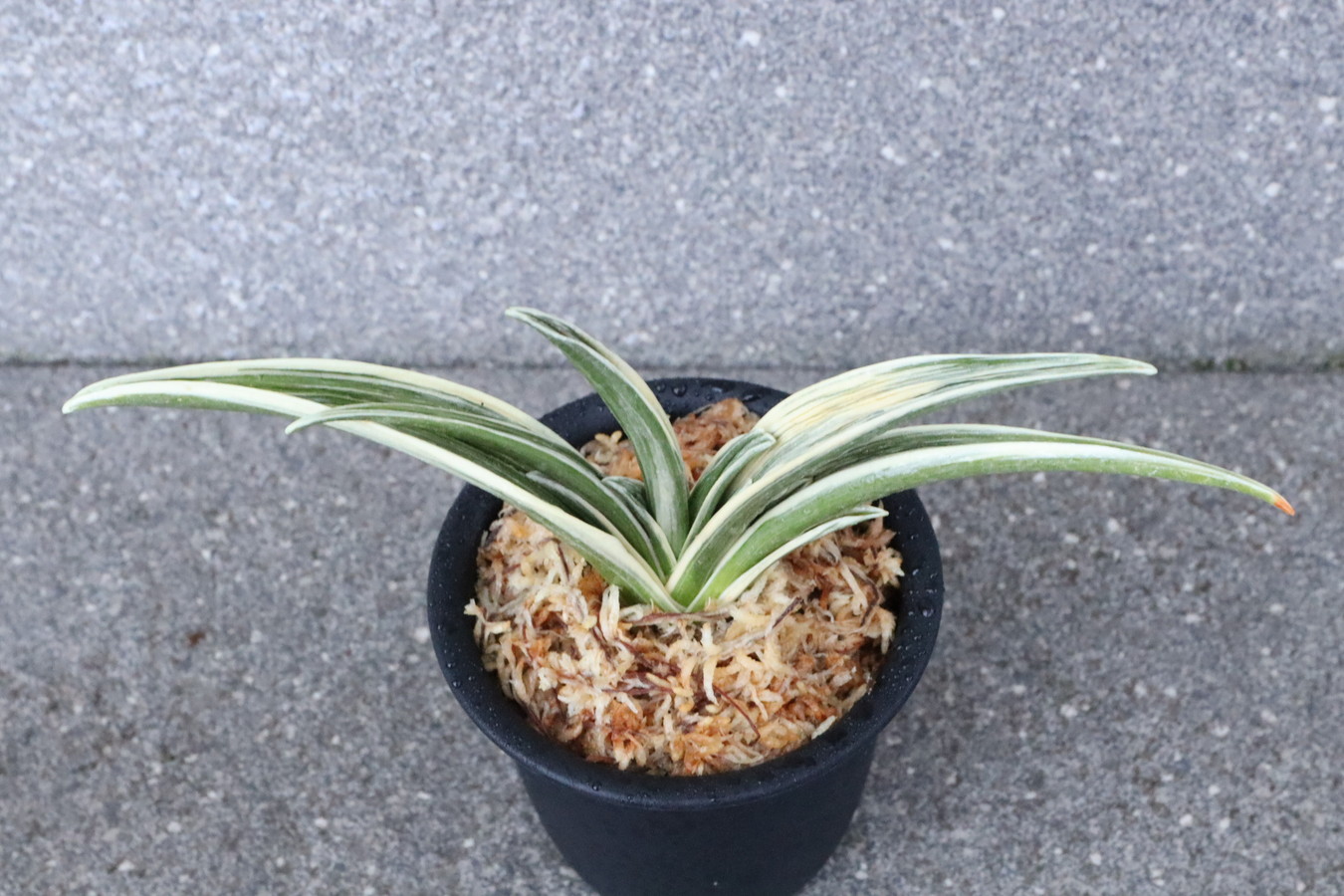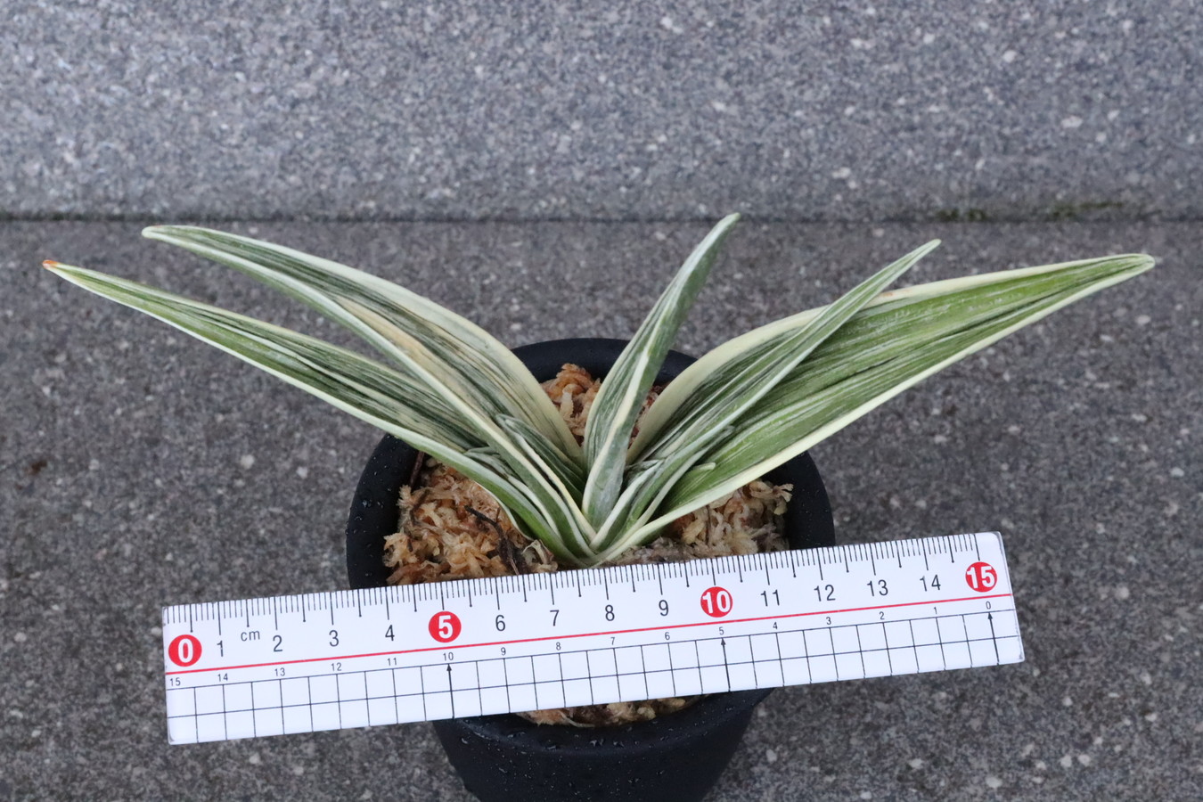 羅紗系のなかで大型種。縞甲竜系統「晃明殿」の実生。その魅力を存分に引き継ぎ、葉の中ほどでぐっと膨らみ、そこから葉先に向けて鋭くなる肉厚の葉。繊細で葉全体が輝く総雅糸竜をみせ、腰の張った重量感ある葉姿。全国の趣味者に名前を募集して命名された、稀代の銘品。