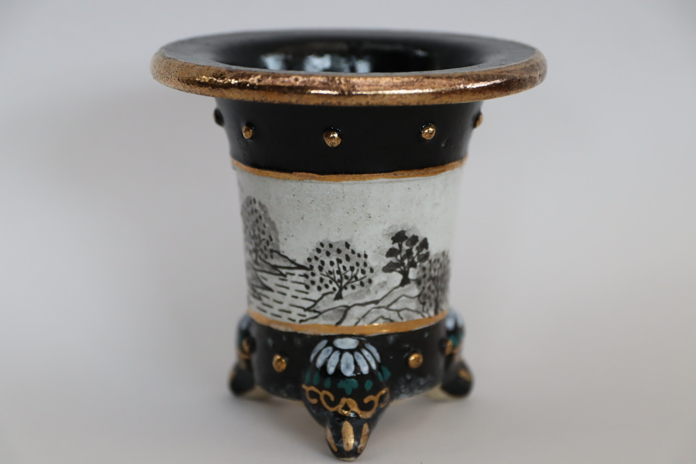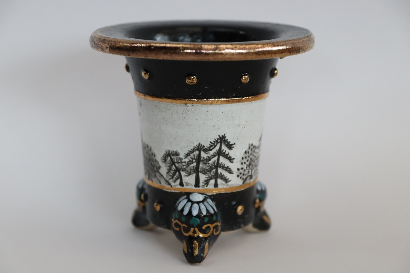 2135,太鼓胴山水 外径約10.8cm 利山窯手作り鉢 中古