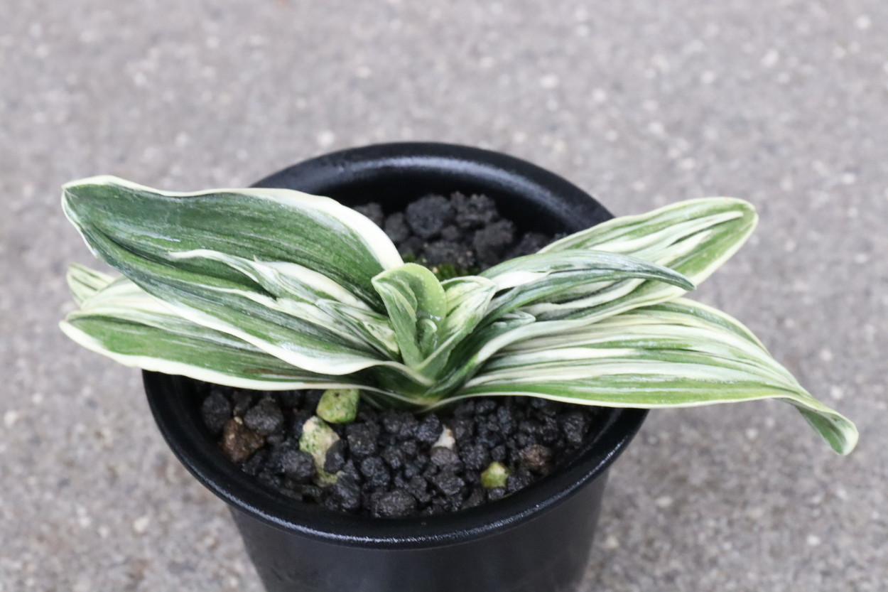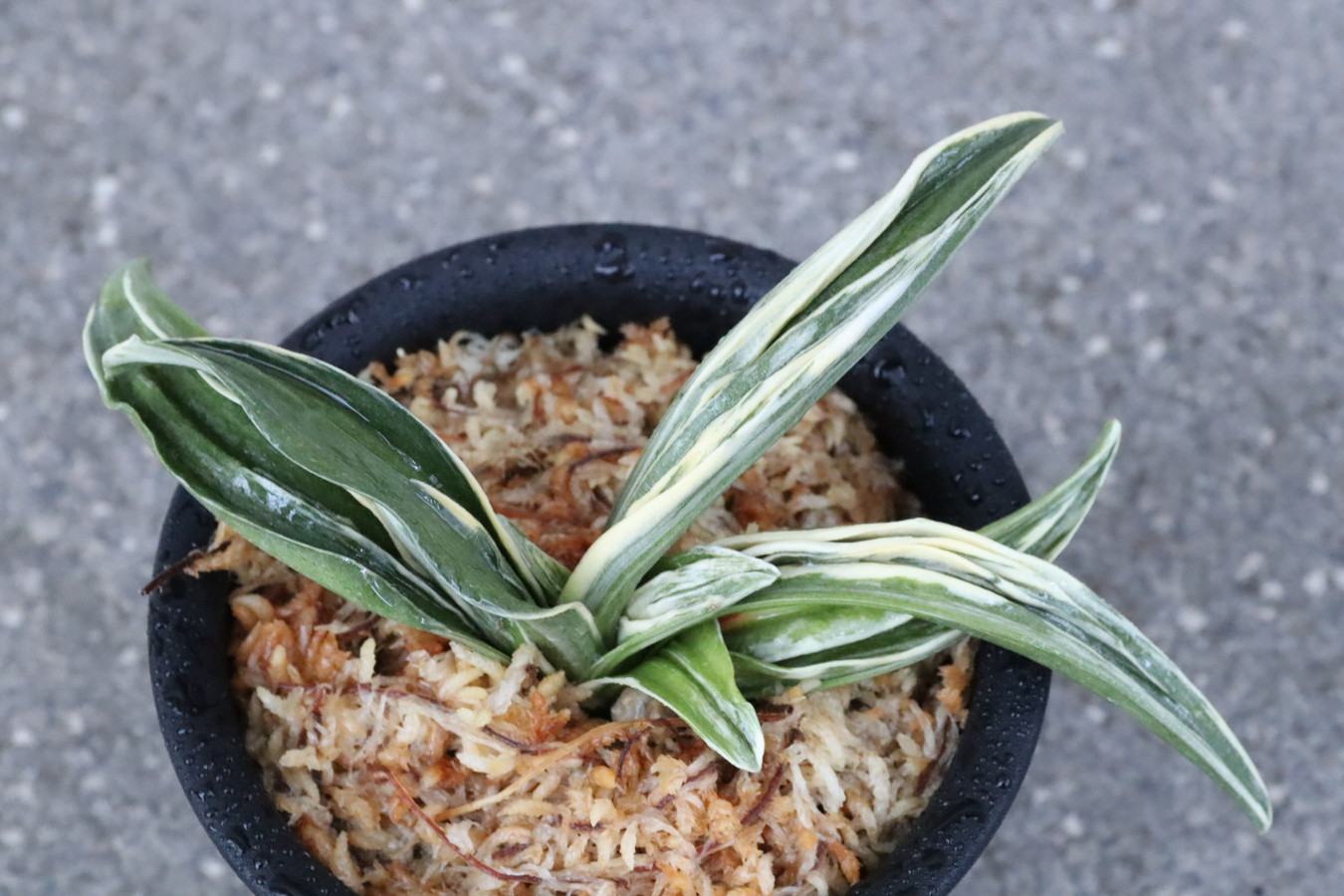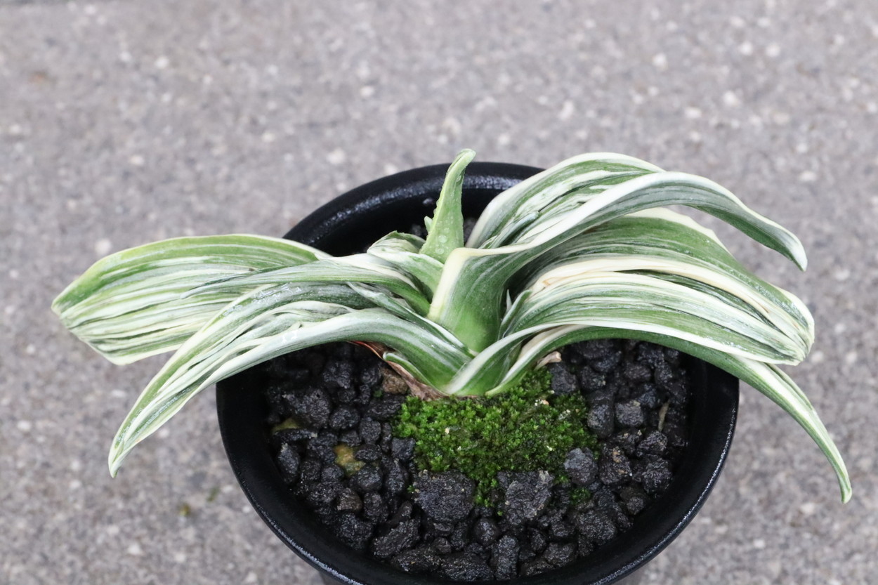 濃緑色の厚い葉に雅糸竜、甲竜、のし葉を現す。腰太の重量感ある姿になります。繁殖は芋吹き、性質は強健で作りやすい品種です。