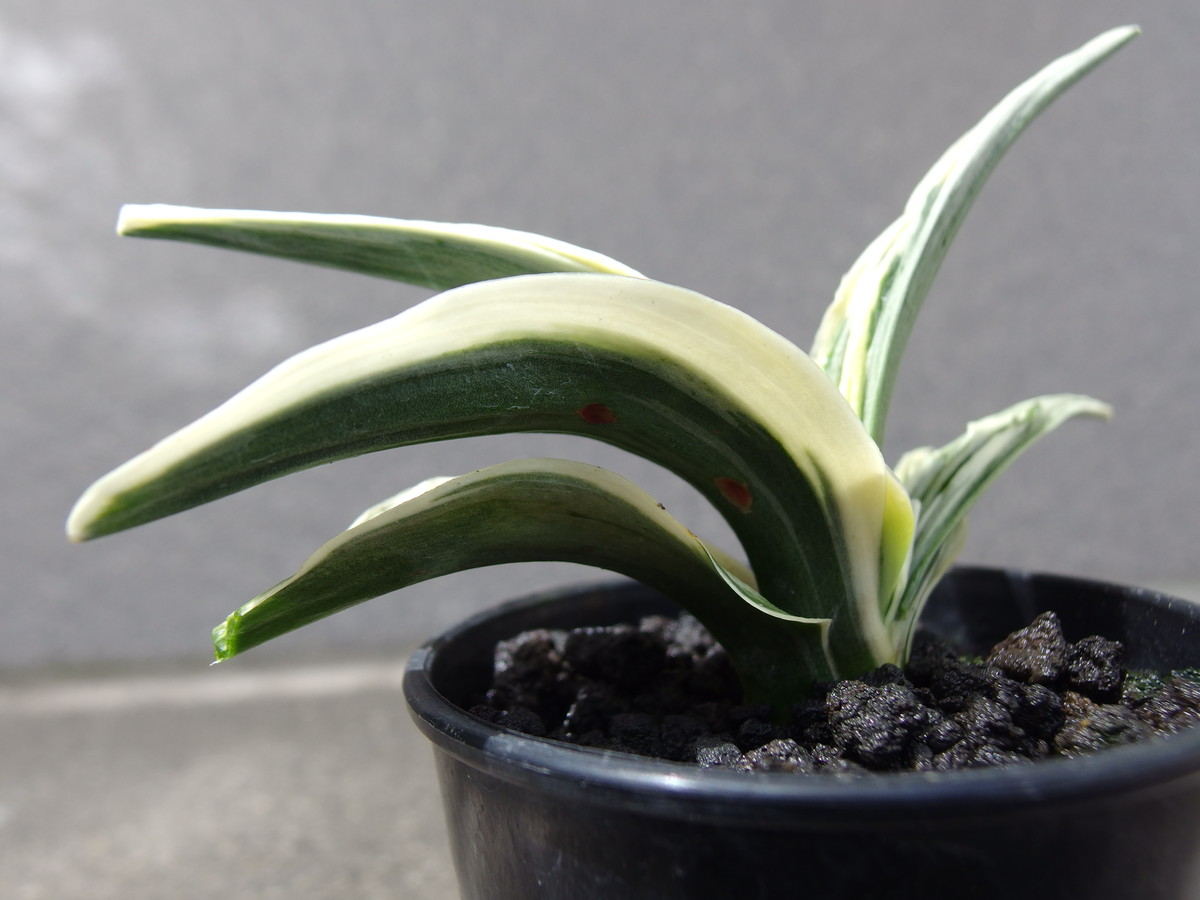 立ち葉で、葉元は広く、葉先は鋭く尖り、葉一面に総雅糸竜を現し、少し黄色みを帯びた覆輪は深くかかり黄金色に輝き、綺麗である。性質は強く、葉繰はやや悪いが、容姿端麗である。採光はやや弱いほうが良く施肥は普通が良い。