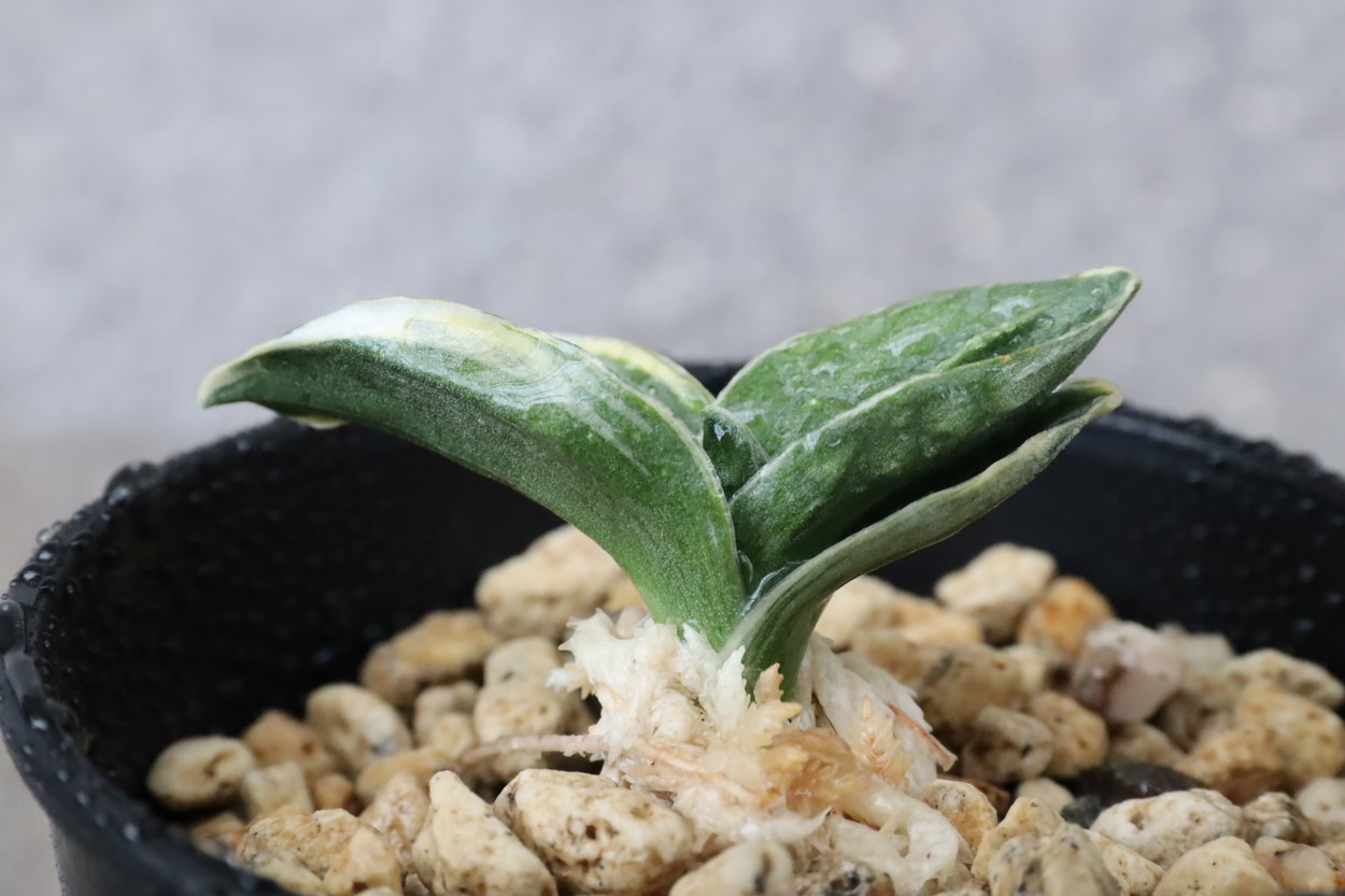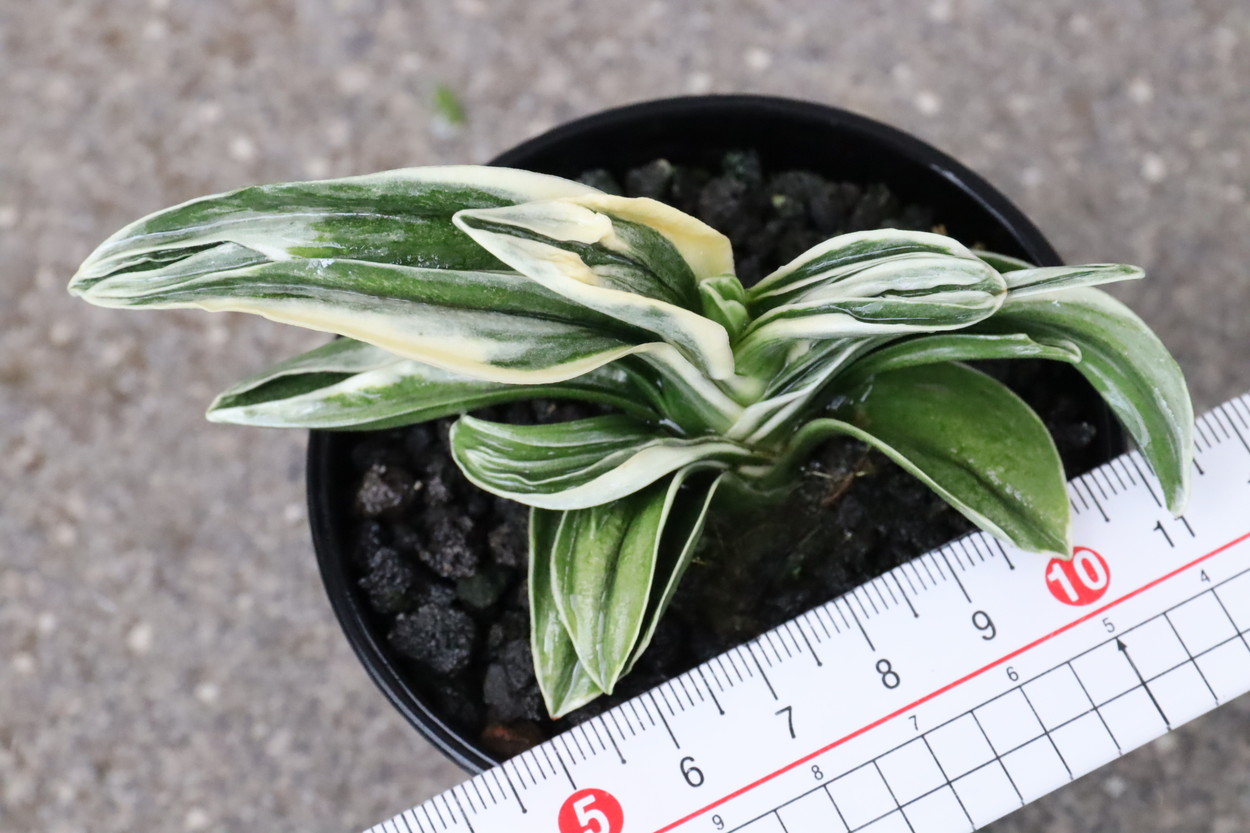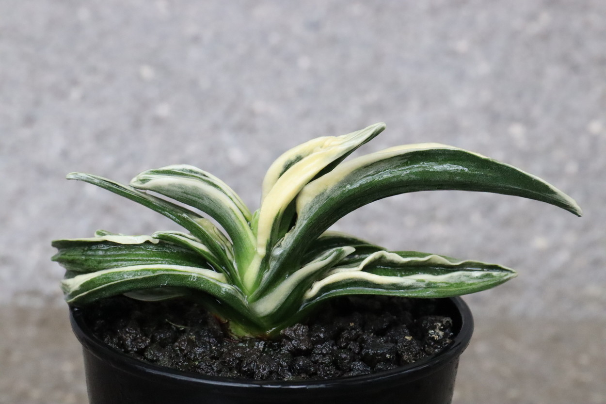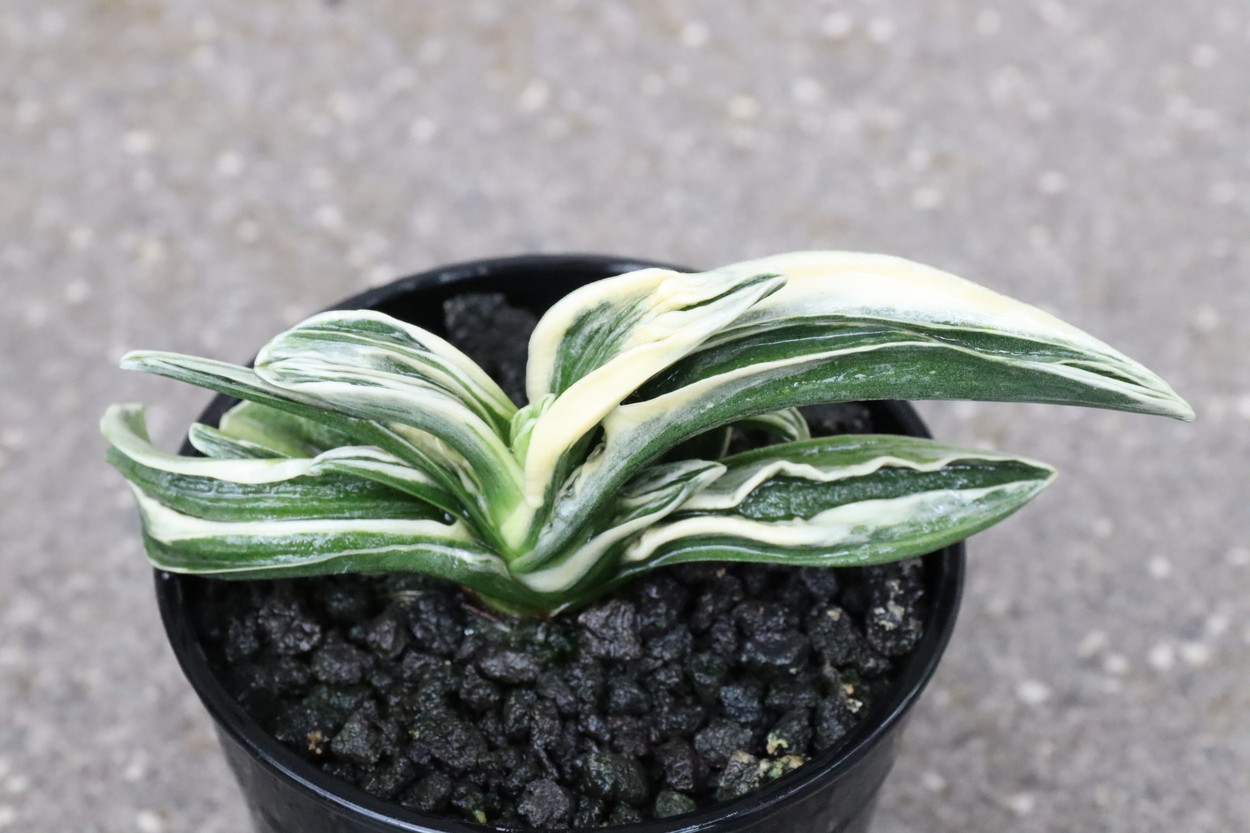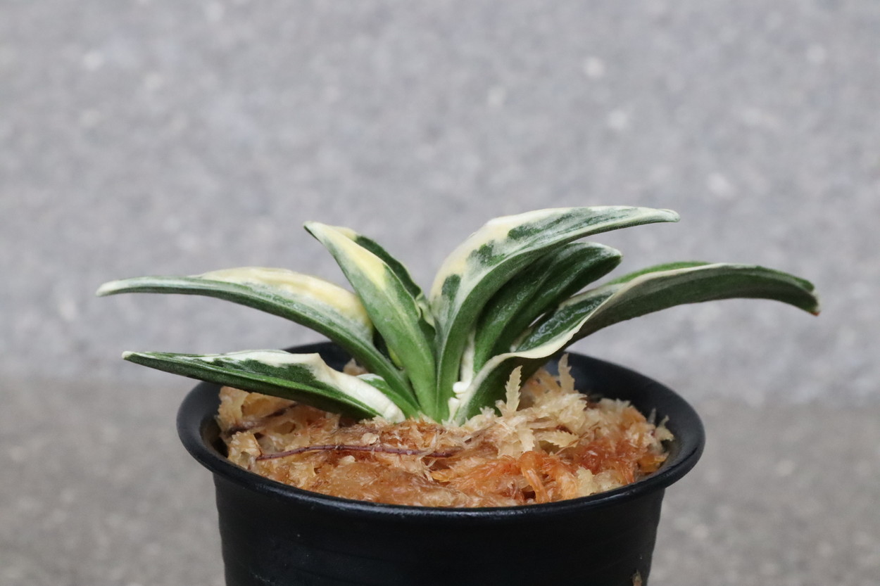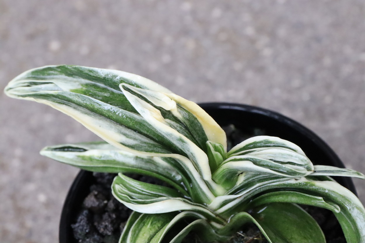 中型から小型。厚い葉に、やや淡い紺性に艶消しの地合い。乳白色の覆輪。葉巾は広く、葉長はつまり、力和ほどではないが、丸葉で愛らしい。総雅糸竜、変化をする甲竜、熨斗葉、剣葉と多芸で、首元太く力強い。