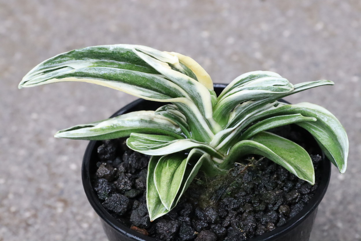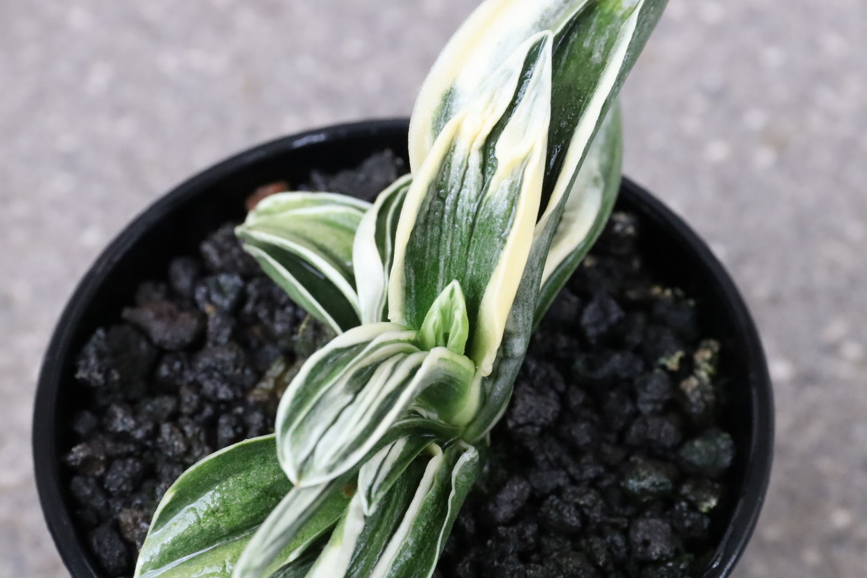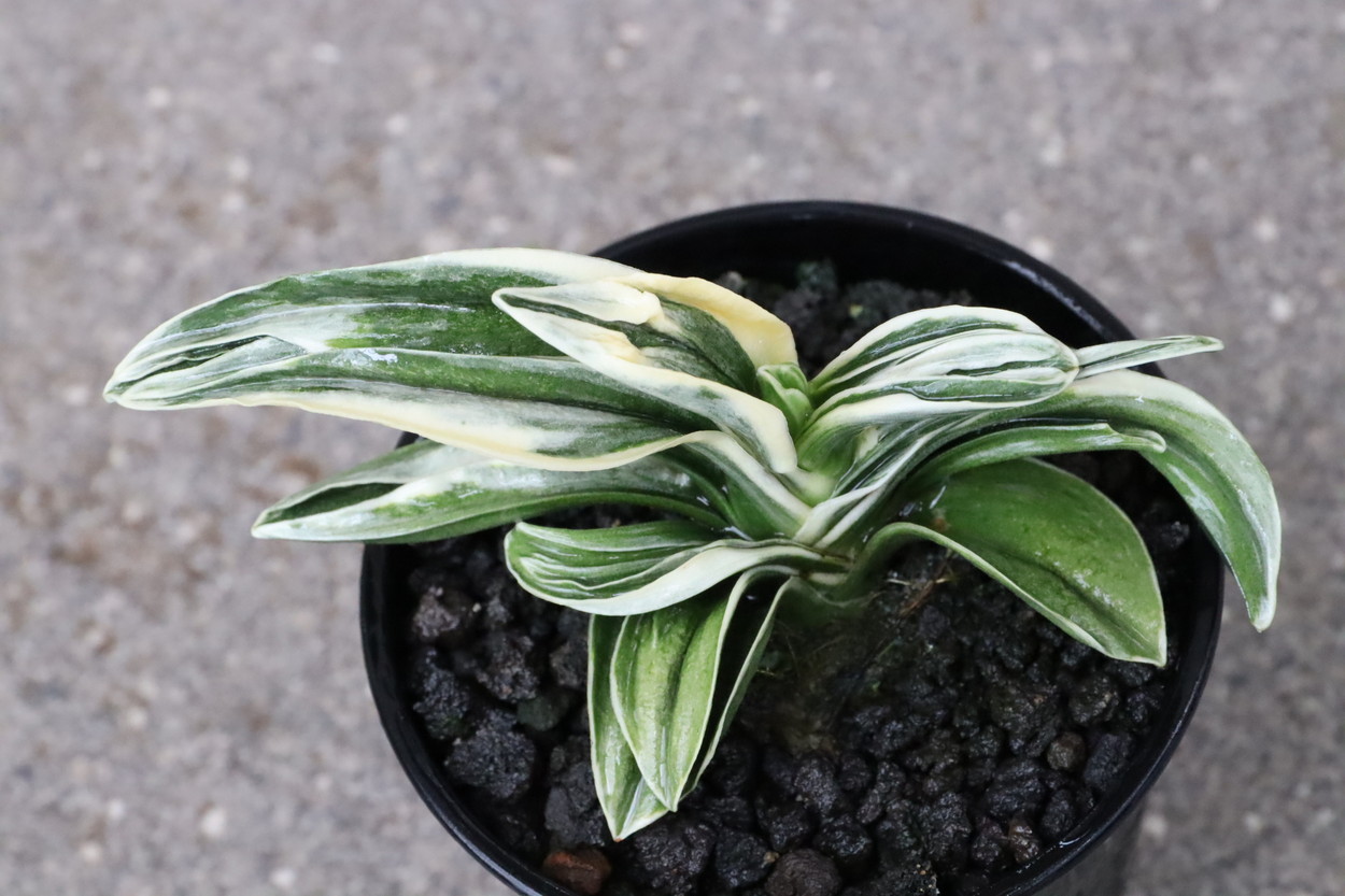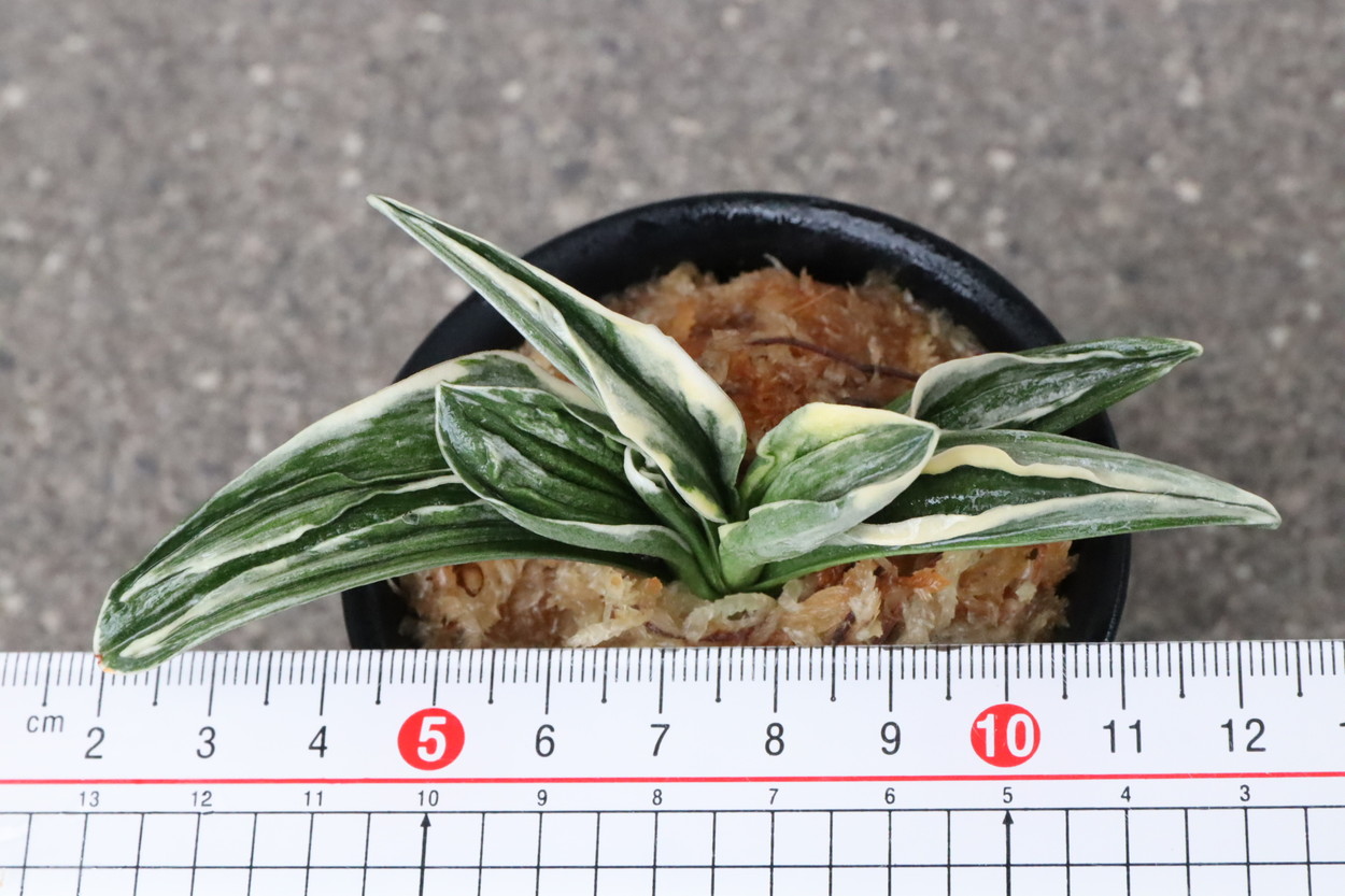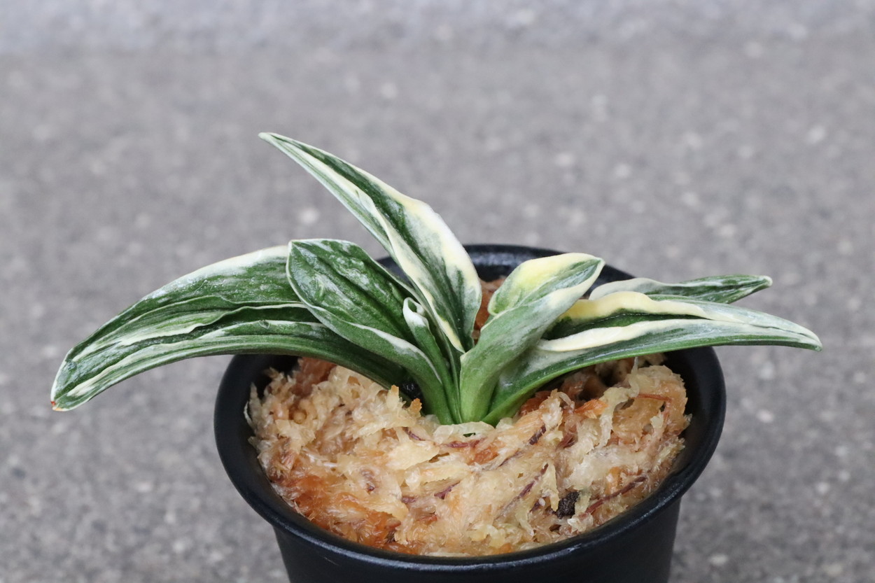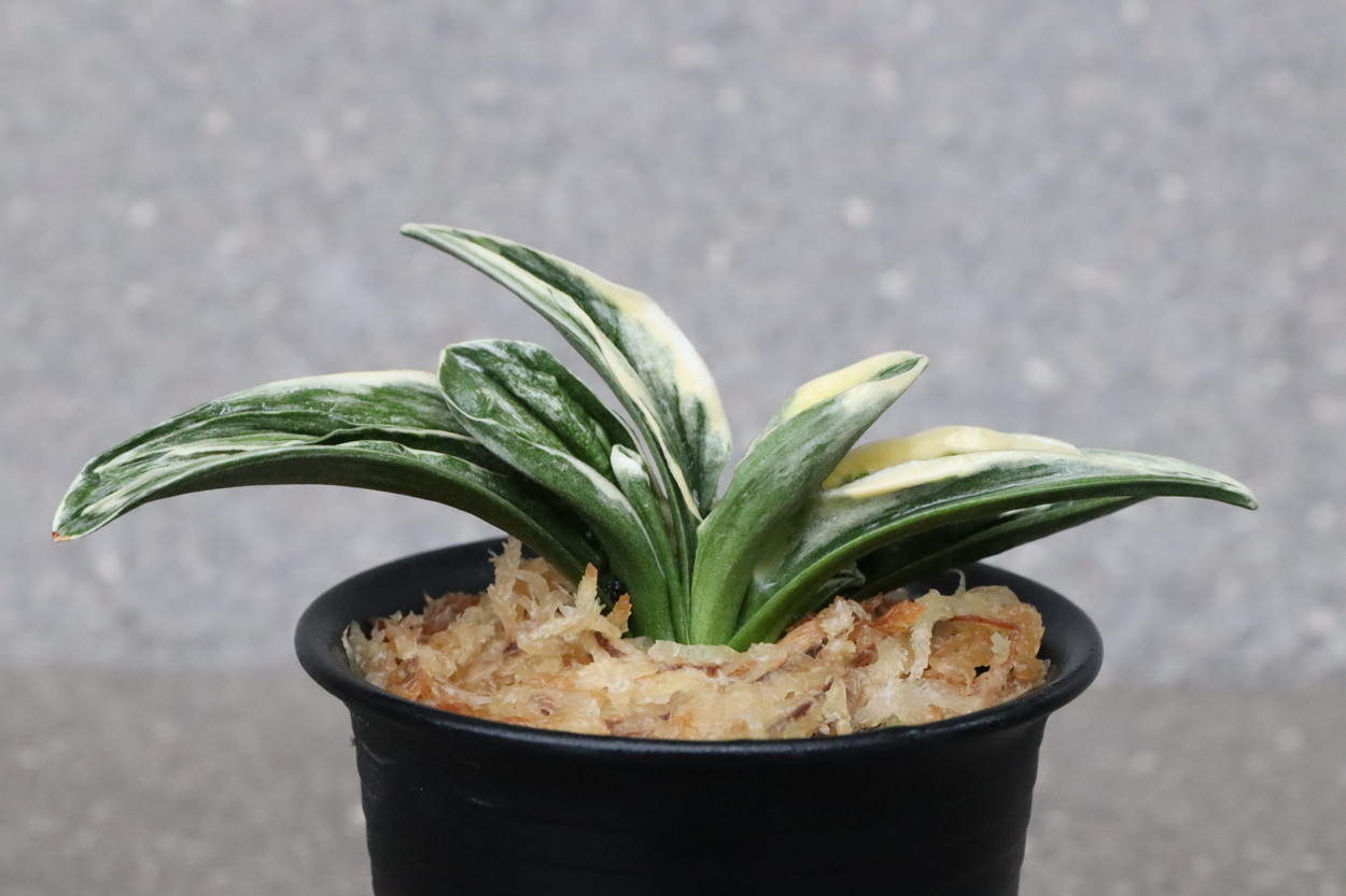 中型から小型。厚い葉に、やや淡い紺性に艶消しの地合い。乳白色の覆輪。葉巾は広く、葉長はつまり、力和ほどではないが、丸葉で愛らしい。総雅糸竜、変化をする甲竜、熨斗葉、剣葉と多芸で、首元太く力強い。