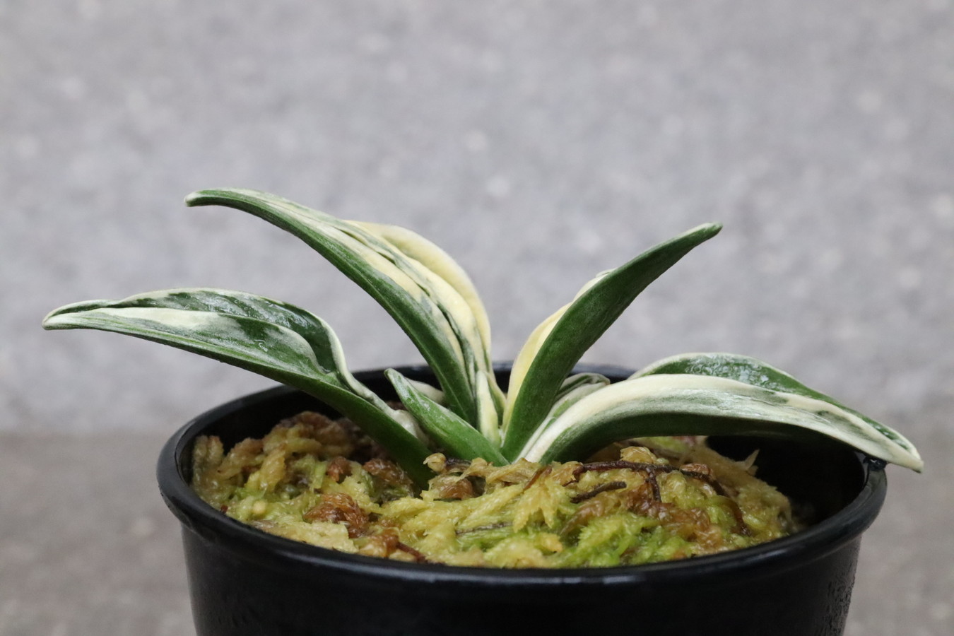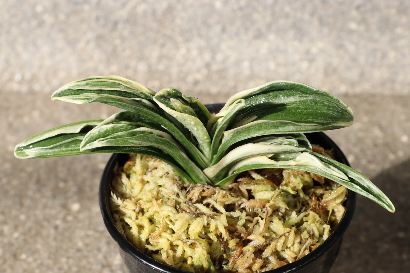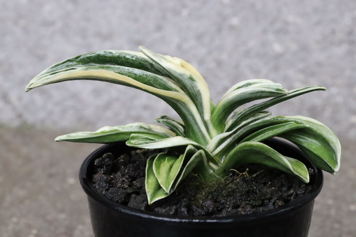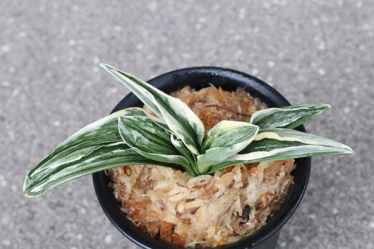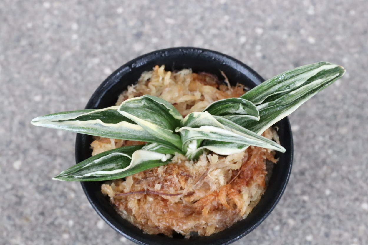 中型から小型。厚い葉に、やや淡い紺性に艶消しの地合い。乳白色の覆輪。葉巾は広く、葉長はつまり、力和ほどではないが、丸葉で愛らしい。総雅糸竜、変化をする甲竜、熨斗葉、剣葉と多芸で、首元太く力強い。