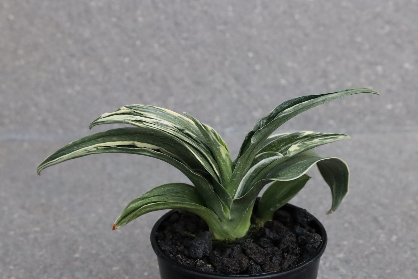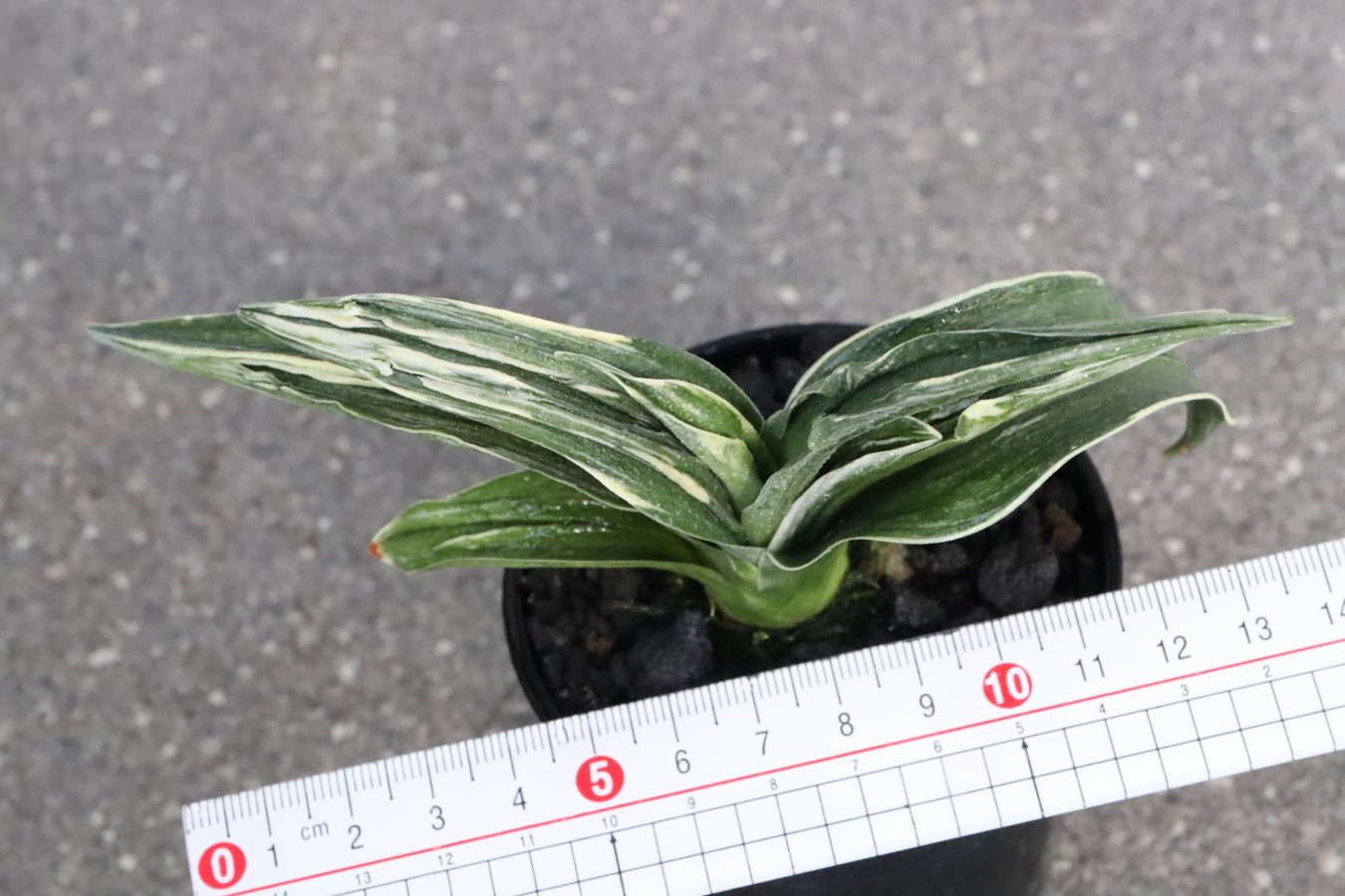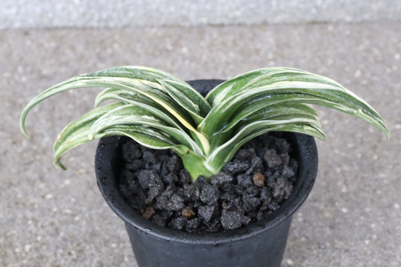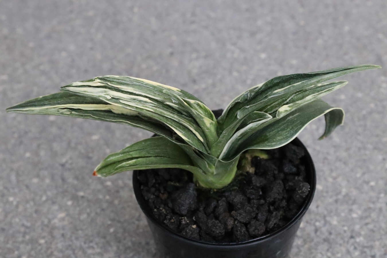 葉先が尖り、特徴をつかみやすい 初心者でも見分けがつく、ということが100年残る万年青、人気の出る万年青。プロでも名札がないとわからなくなってしまう万年青は表札万年青といって名札を売っているようなもの、というのが初代の信念です。錦麒麟や四君子、楊貴妃や新生殿が常に人気があるのは誰でもわかる万年青だから。
