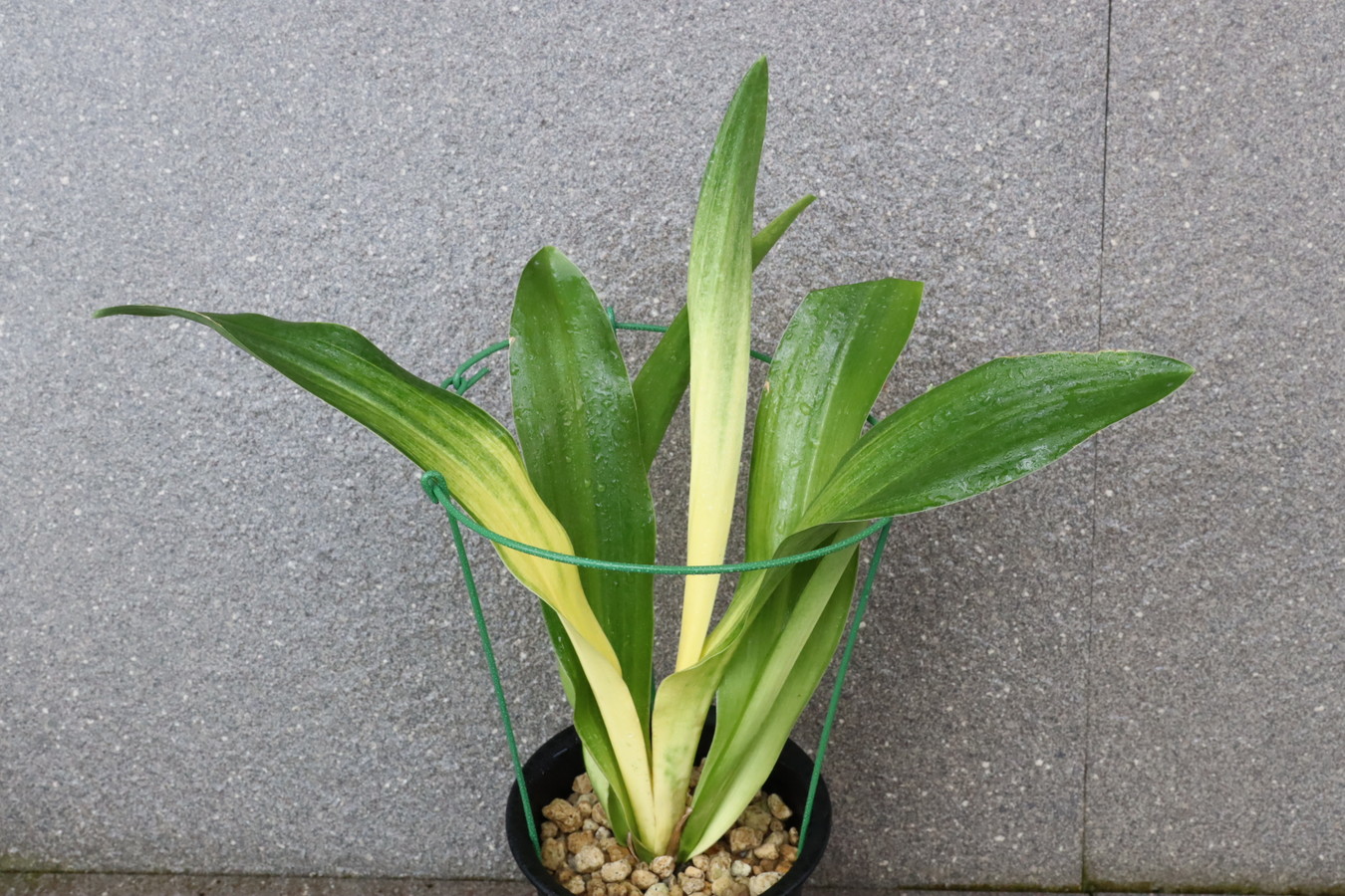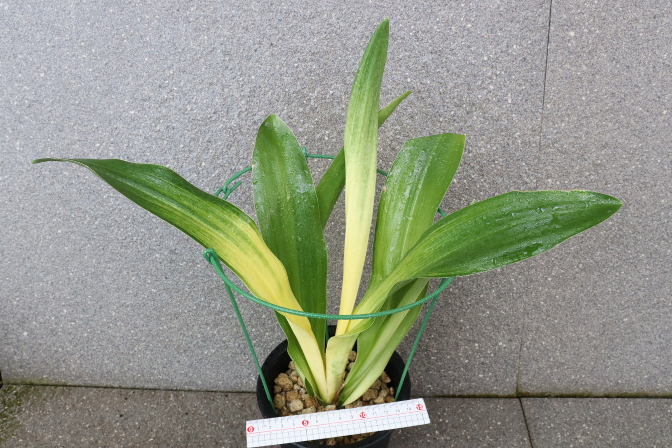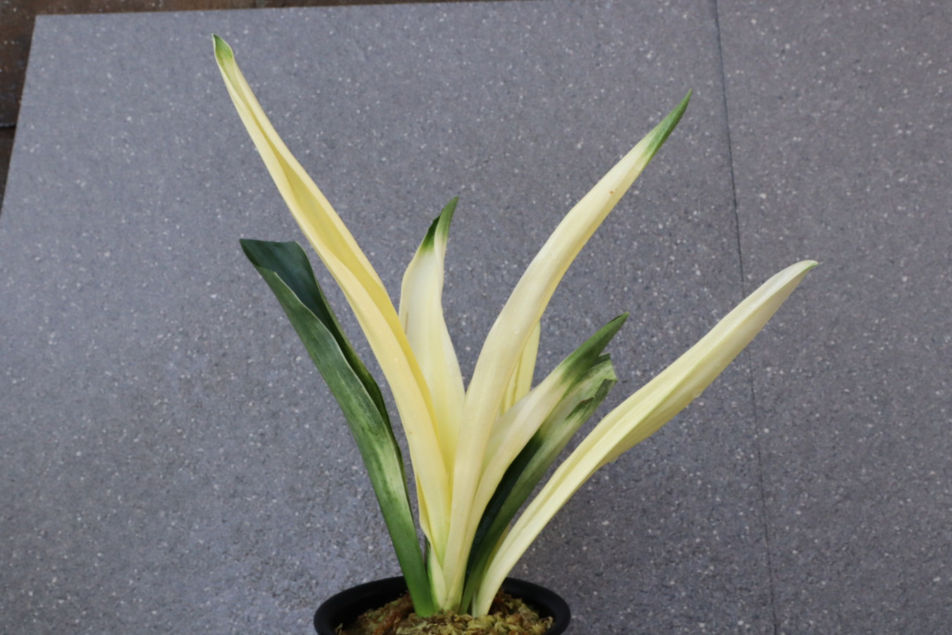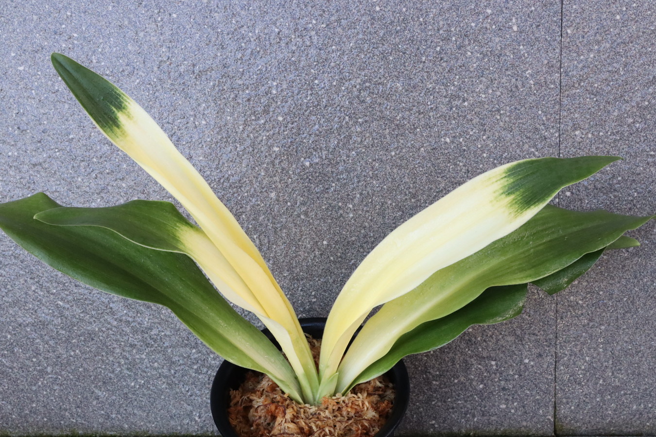 交換会で売りに出された2枚葉の実生を求め作る。葉幅が広く立ち葉性で紺性強く、その中に独特の卵黄色の美しい曙虎を現す。曙系品種は多種多様だが、その中でもひときわ目を見張る美しさがある。葉長40㎝、葉幅8㎝内外。当初、性質はやや弱いところがありましたが、殖えていくにつれて丈夫になっていきました。子上は大変良く、根出しも良い。肥料を控えめに与えれば栽培が容易な品種で4月~6月に十分日光に充てて作ることにより美しい曙虎を現す。美麗品。