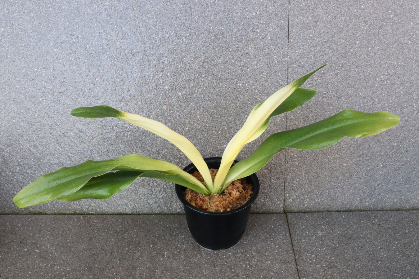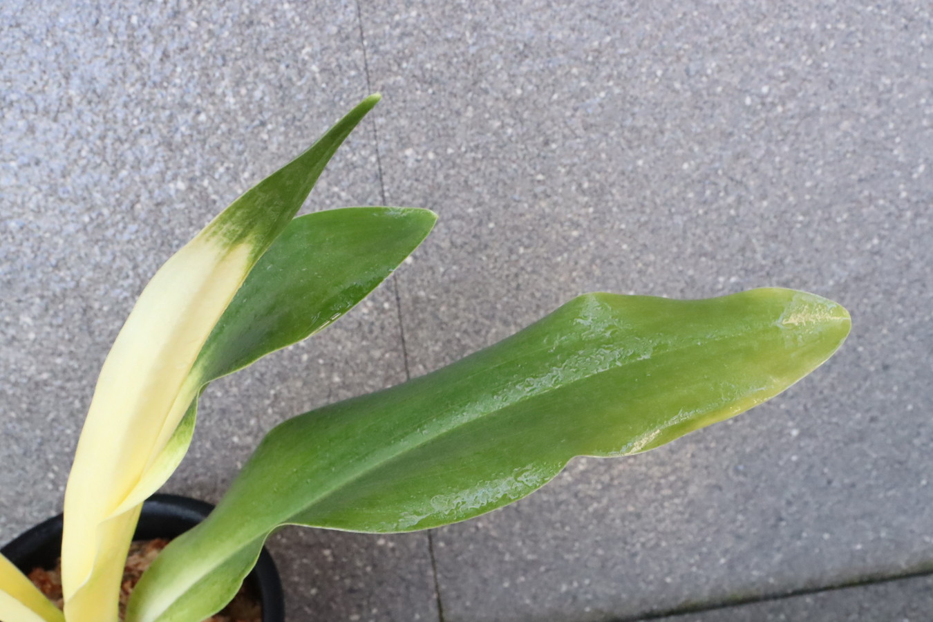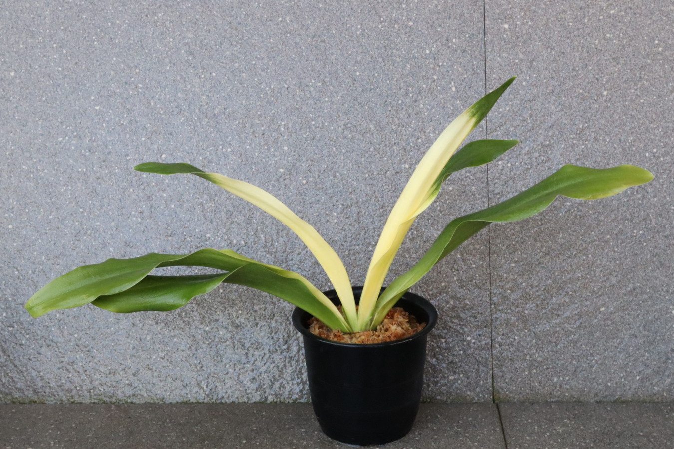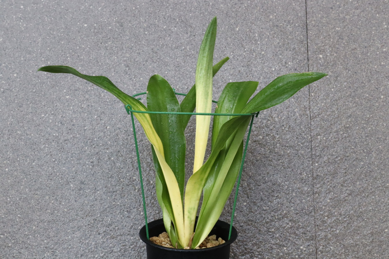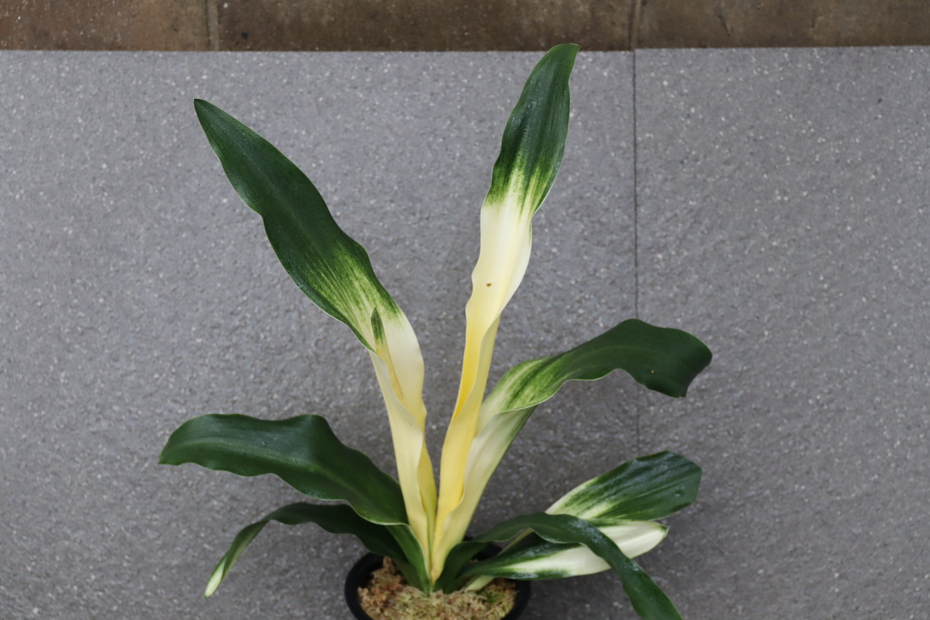 交換会で売りに出された2枚葉の実生を求め作る。葉幅が広く立ち葉性で紺性強く、その中に独特の卵黄色の美しい曙虎を現す。曙系品種は多種多様だが、その中でもひときわ目を見張る美しさがある。葉長40㎝、葉幅8㎝内外。当初、性質はやや弱いところがありましたが、殖えていくにつれて丈夫になっていきました。子上は大変良く、根出しも良い。肥料を控えめに与えれば栽培が容易な品種で4月~6月に十分日光に充てて作ることにより美しい曙虎を現す。美麗品。