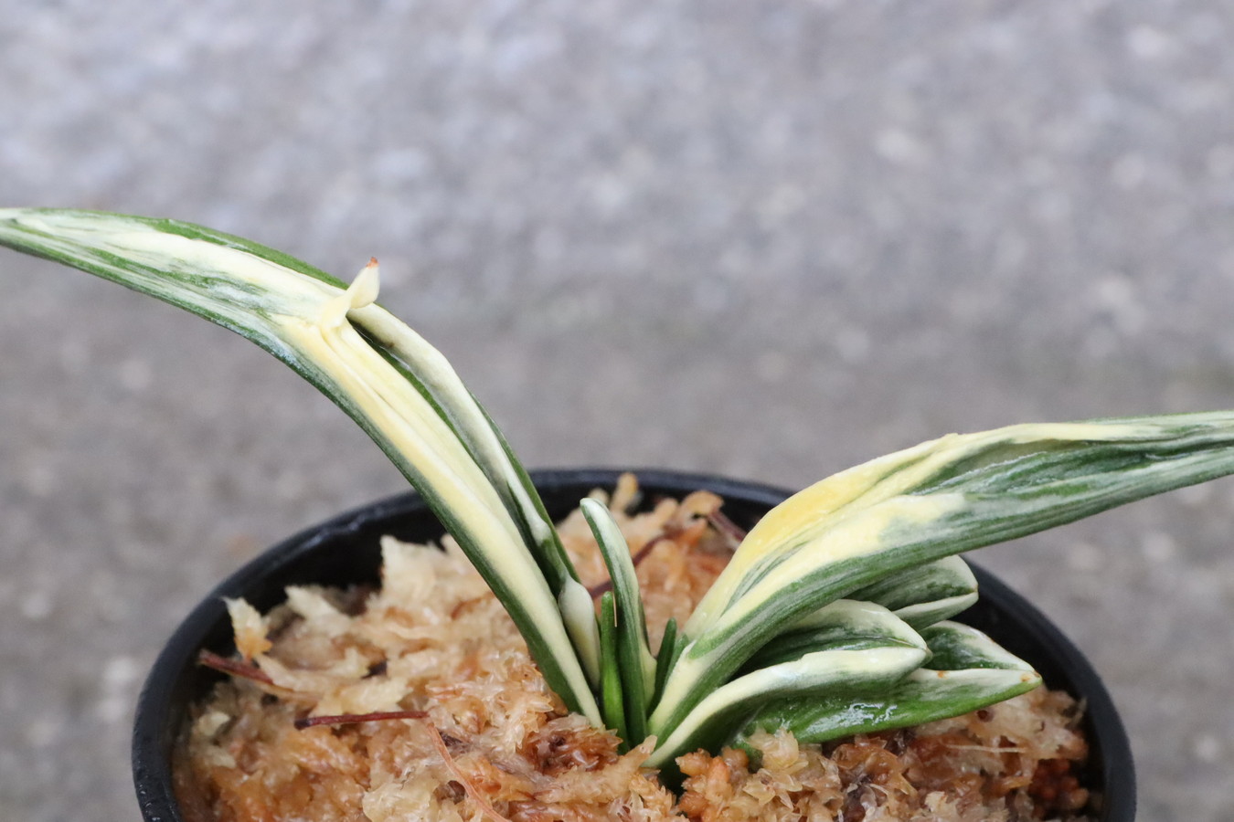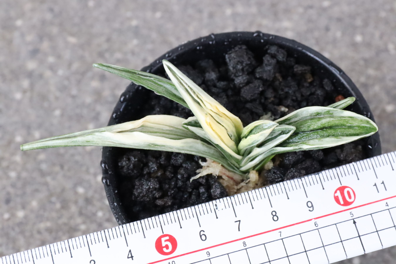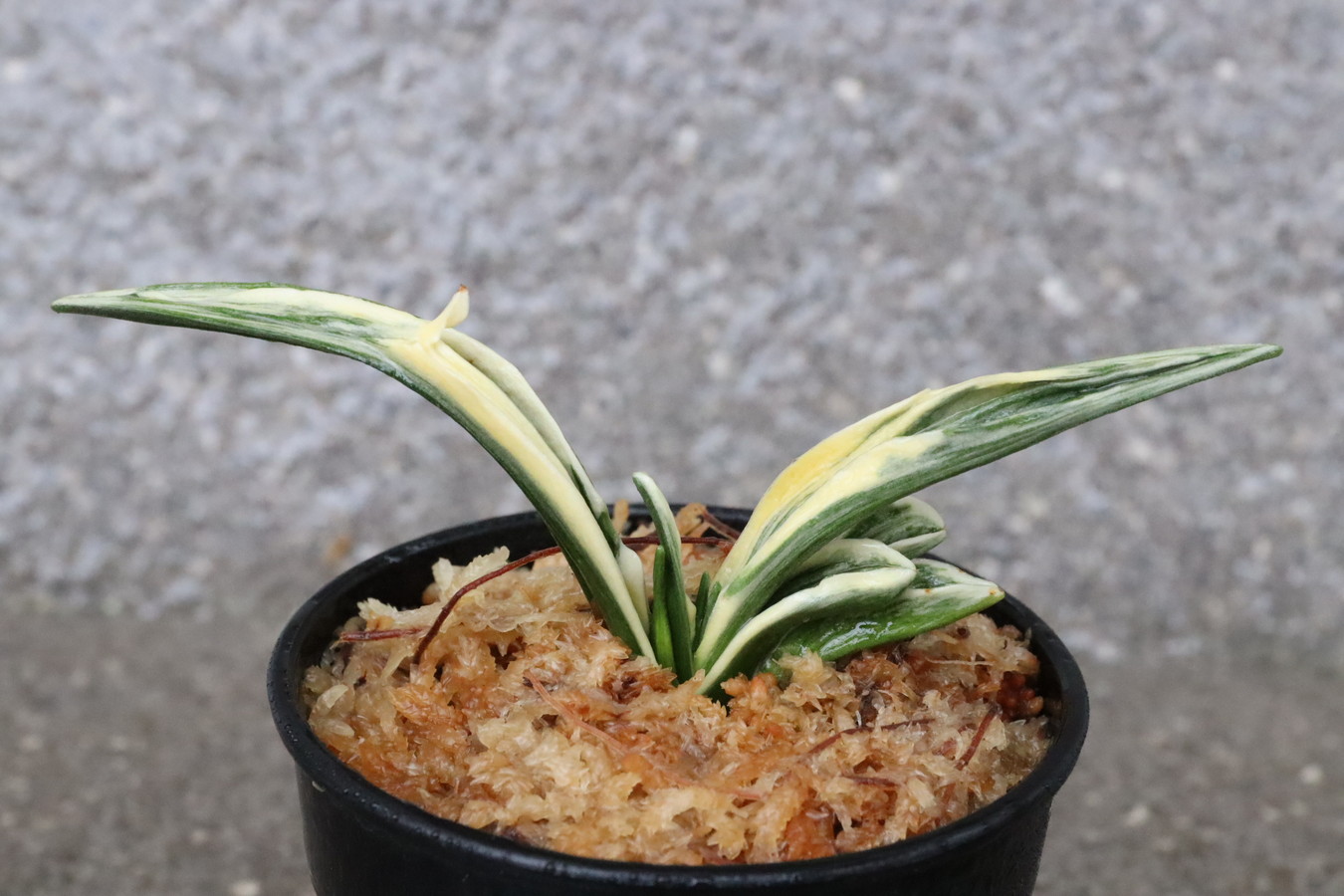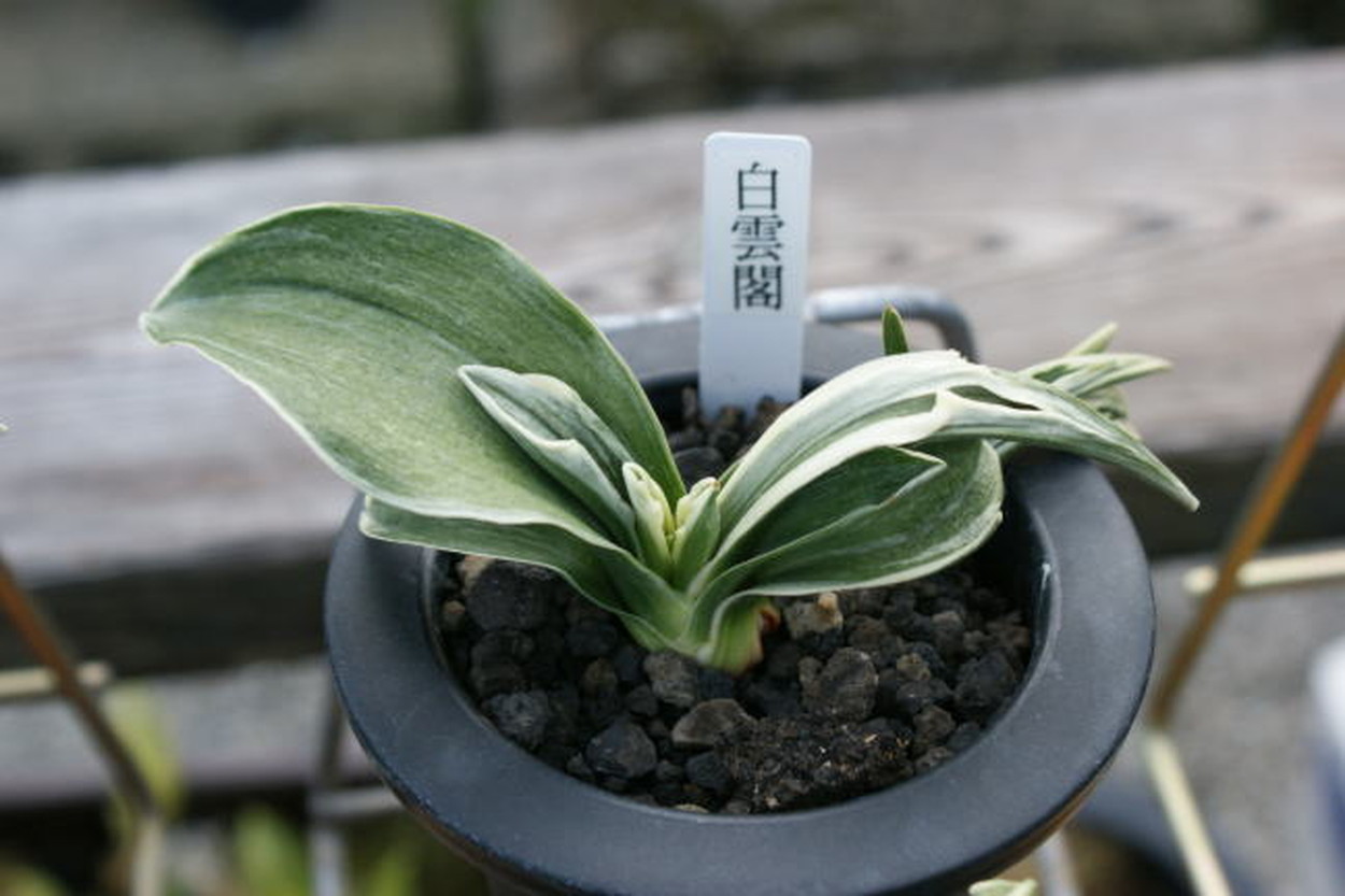 葉長7cm、葉幅3㎝内外の中型種。腰折れが低く、平葉型で、熨斗葉、本剣、棒葉、葉面溢れるばかりの総雅糸竜を見せる。濃紺地に純白の鮮明な覆輪をかける。葉面を純白な糊に覆われた姿は魅力的である。少し芋が柔らかいので、肥料は少なめが良い。子出し良く、繁殖は良い。