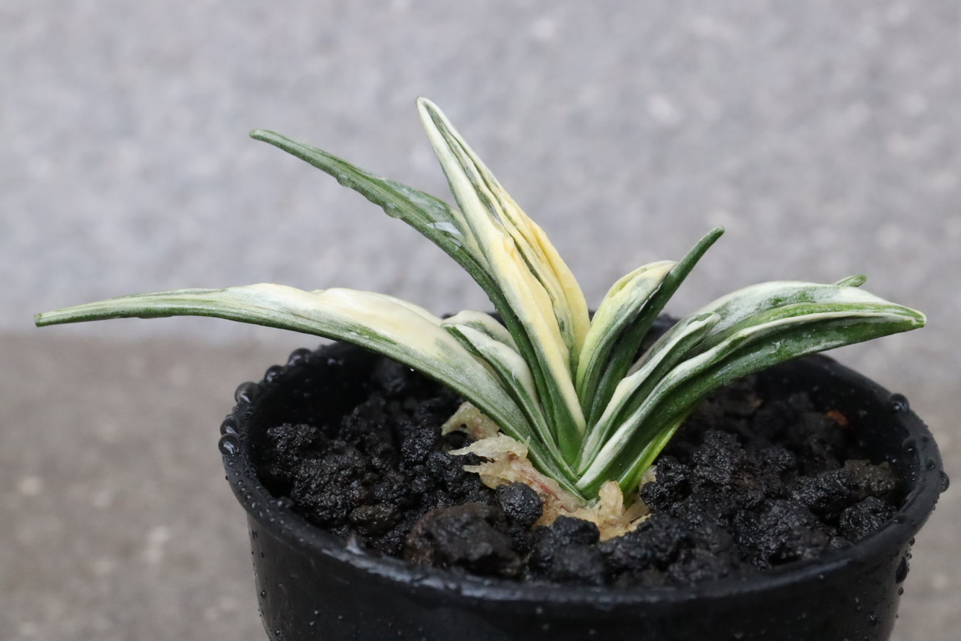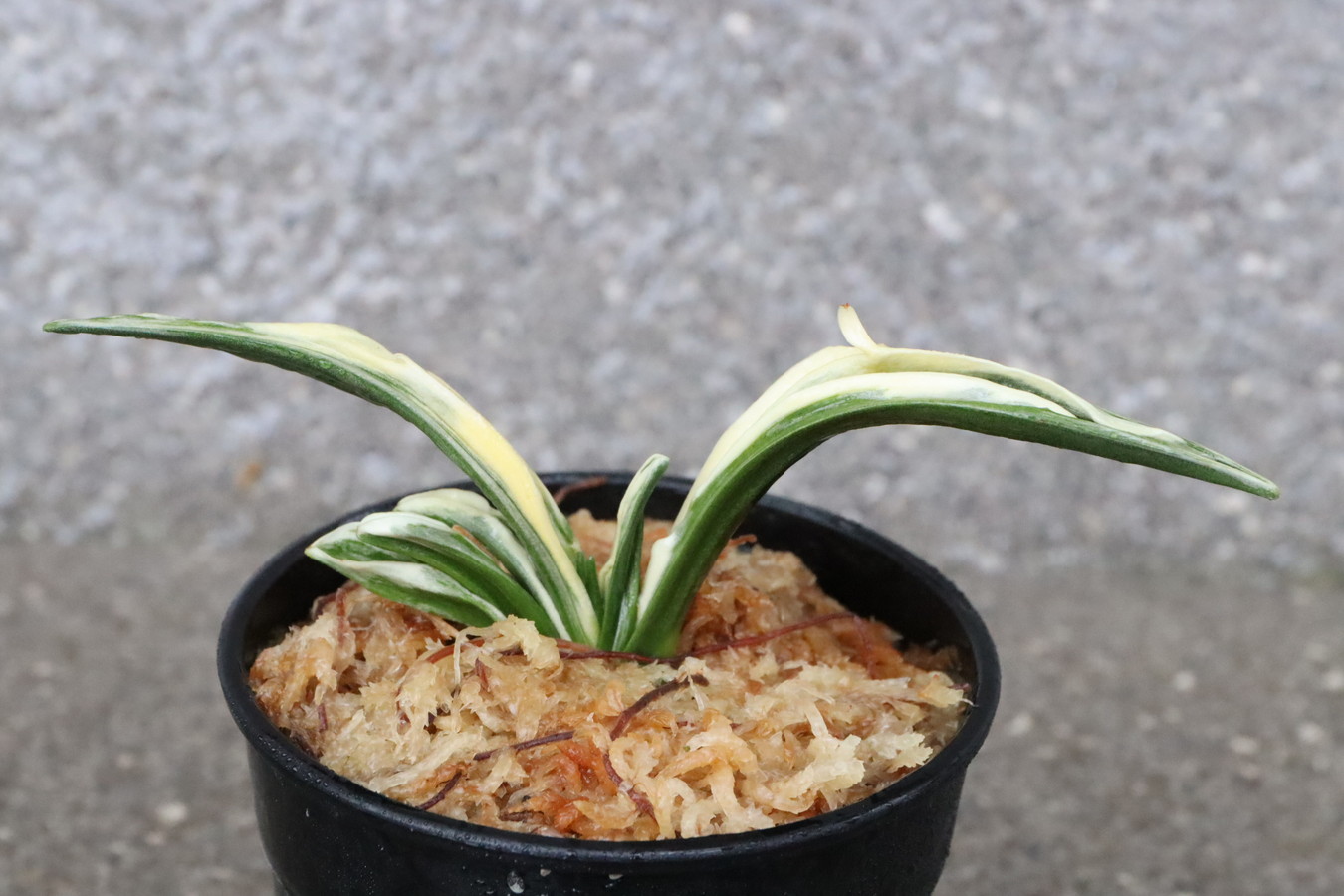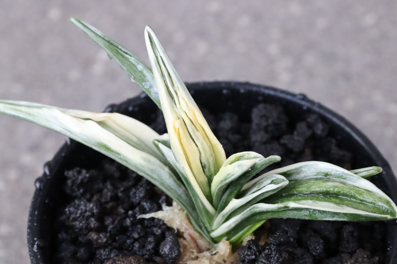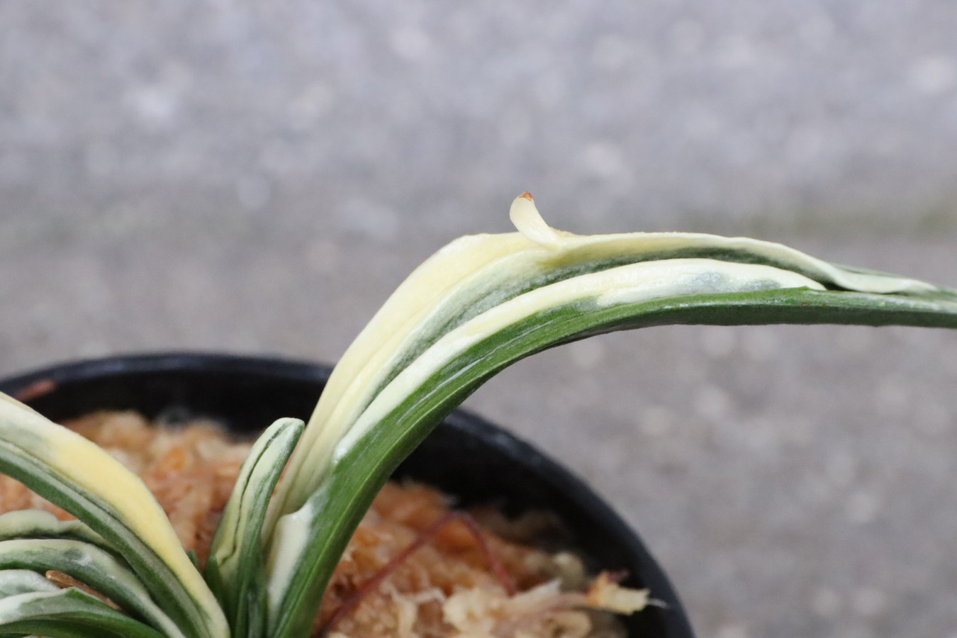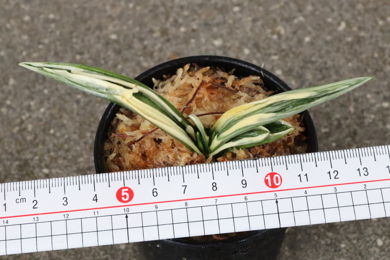 葉長7cm、葉幅3㎝内外の中型種。腰折れが低く、平葉型で、熨斗葉、本剣、棒葉、葉面溢れるばかりの総雅糸竜を見せる。濃紺地に純白の鮮明な覆輪をかける。葉面を純白な糊に覆われた姿は魅力的である。少し芋が柔らかいので、肥料は少なめが良い。子出し良く、繁殖は良い。