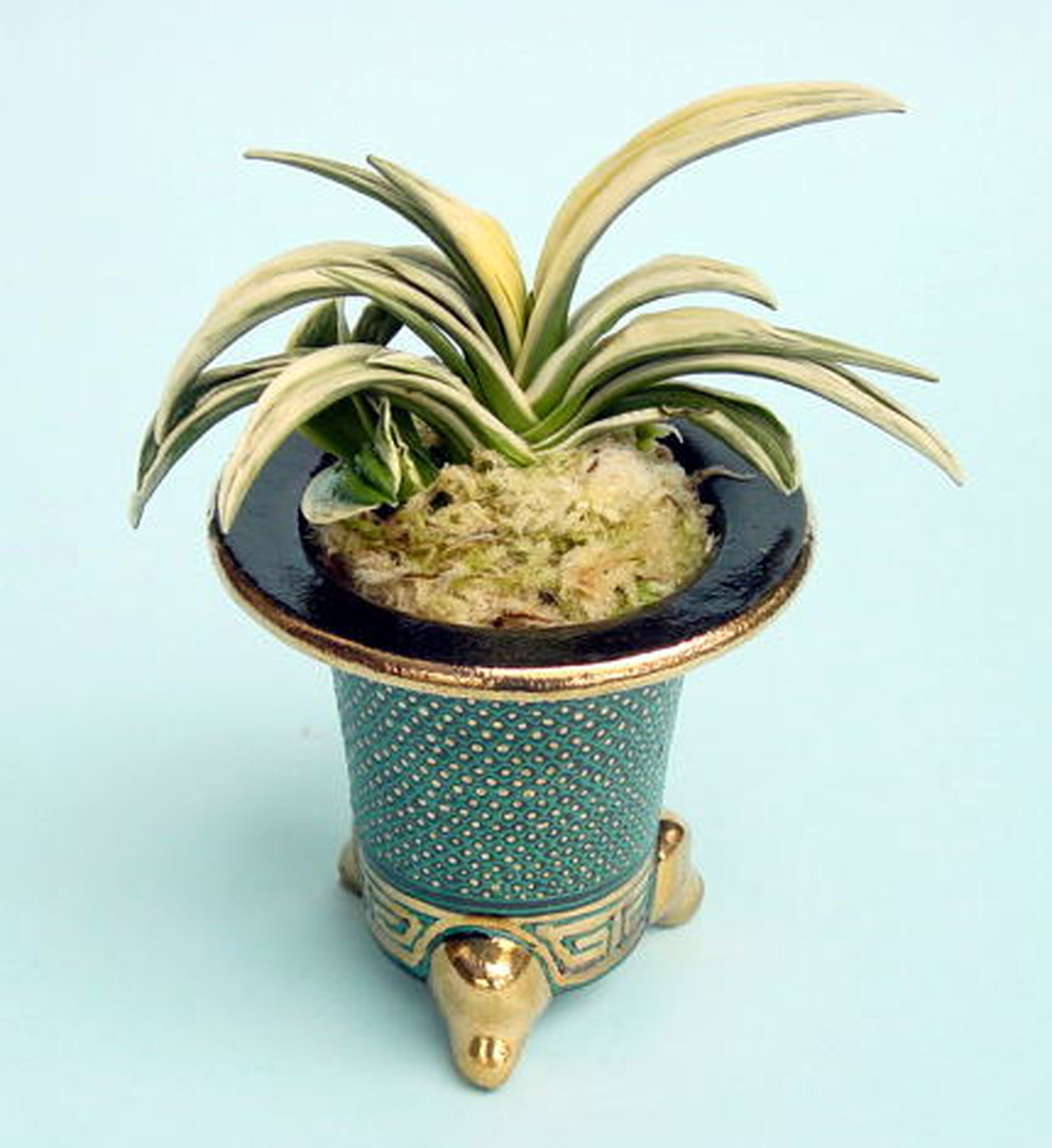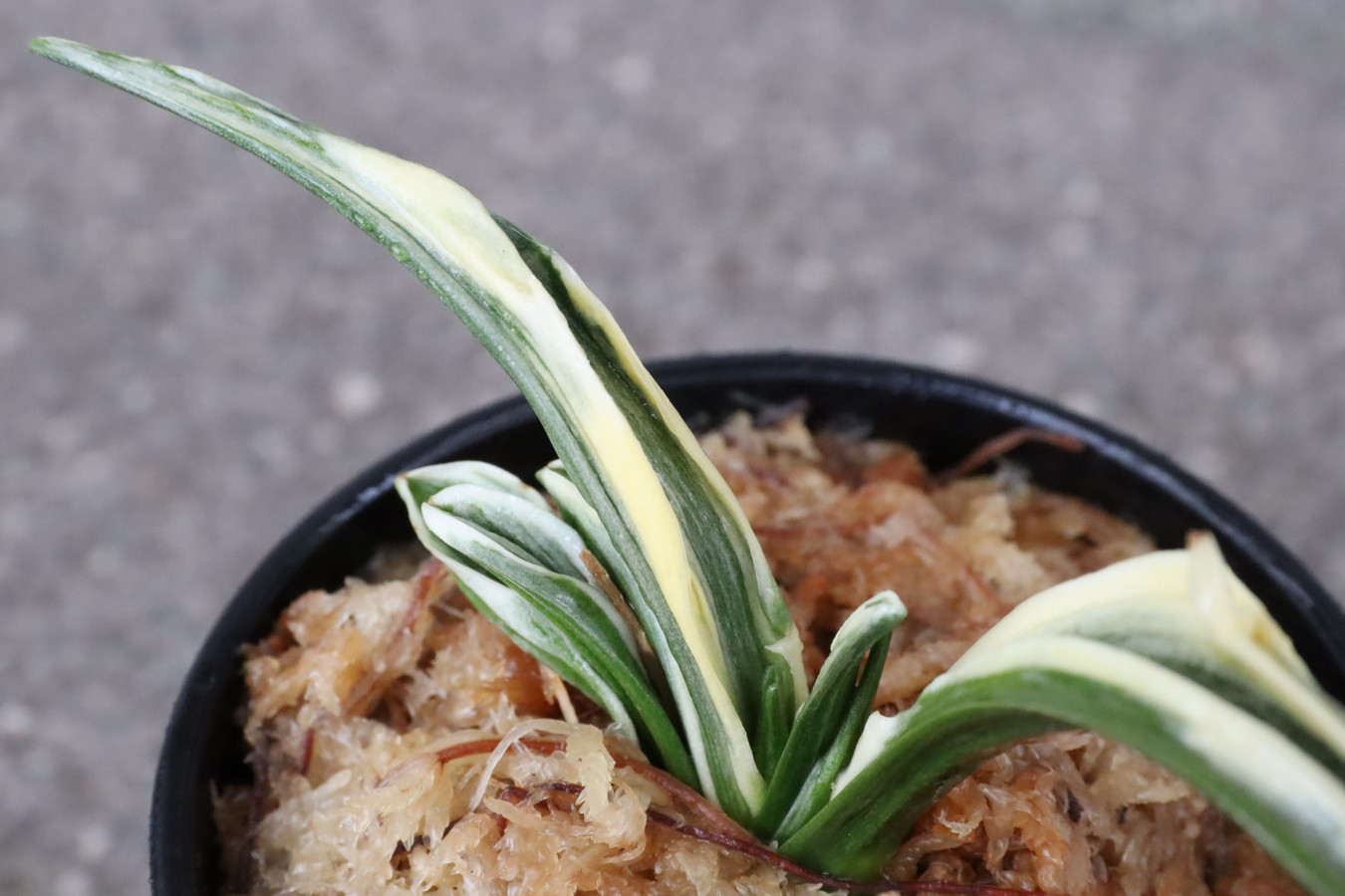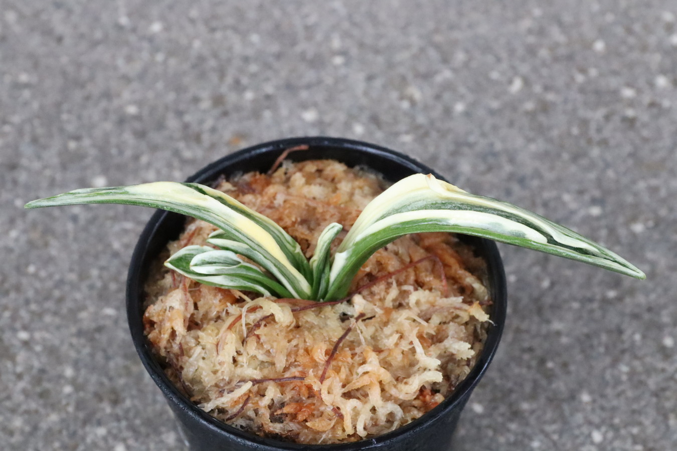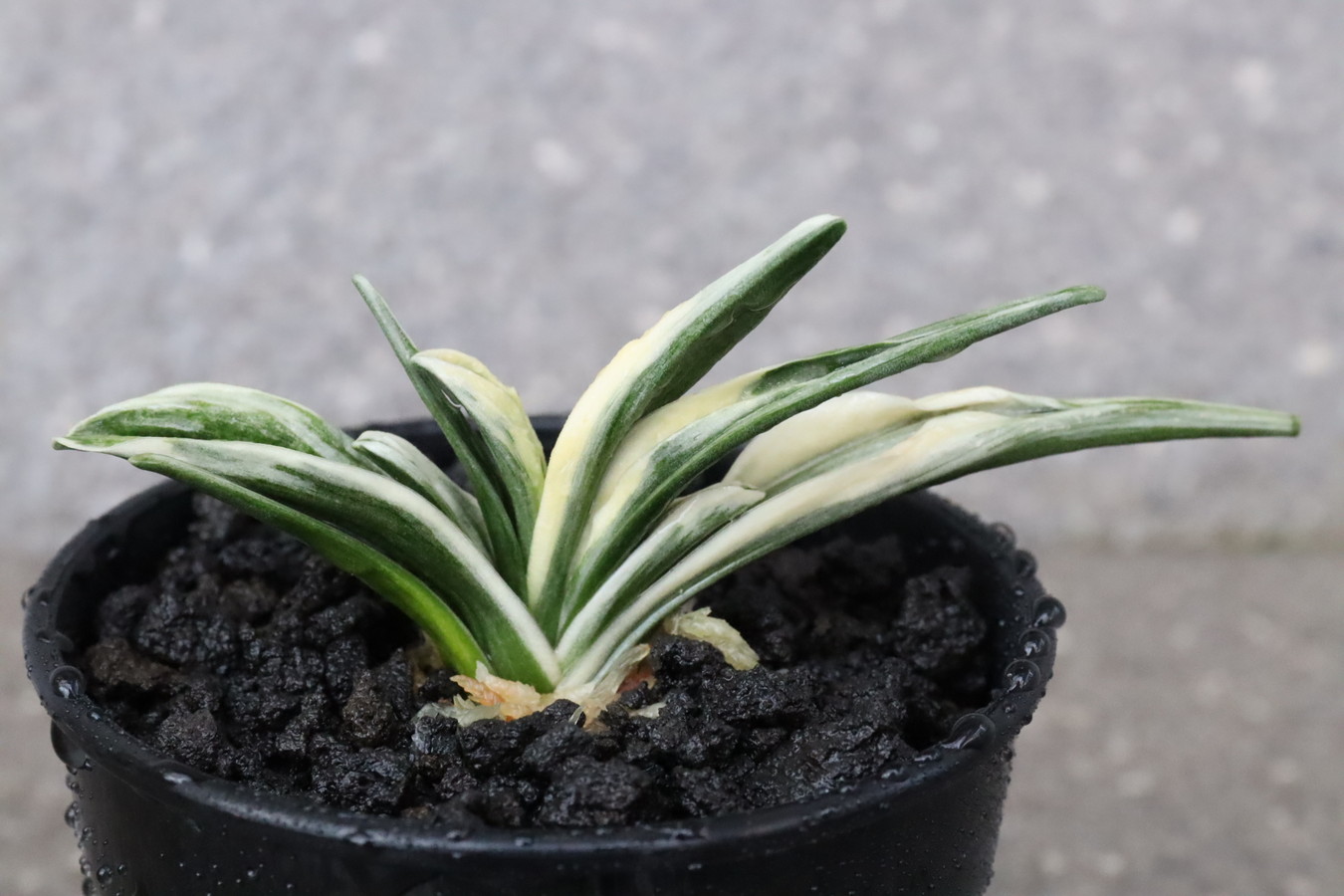 葉長7cm、葉幅3㎝内外の中型種。腰折れが低く、平葉型で、熨斗葉、本剣、棒葉、葉面溢れるばかりの総雅糸竜を見せる。濃紺地に純白の鮮明な覆輪をかける。葉面を純白な糊に覆われた姿は魅力的である。少し芋が柔らかいので、肥料は少なめが良い。子出し良く、繁殖は良い。