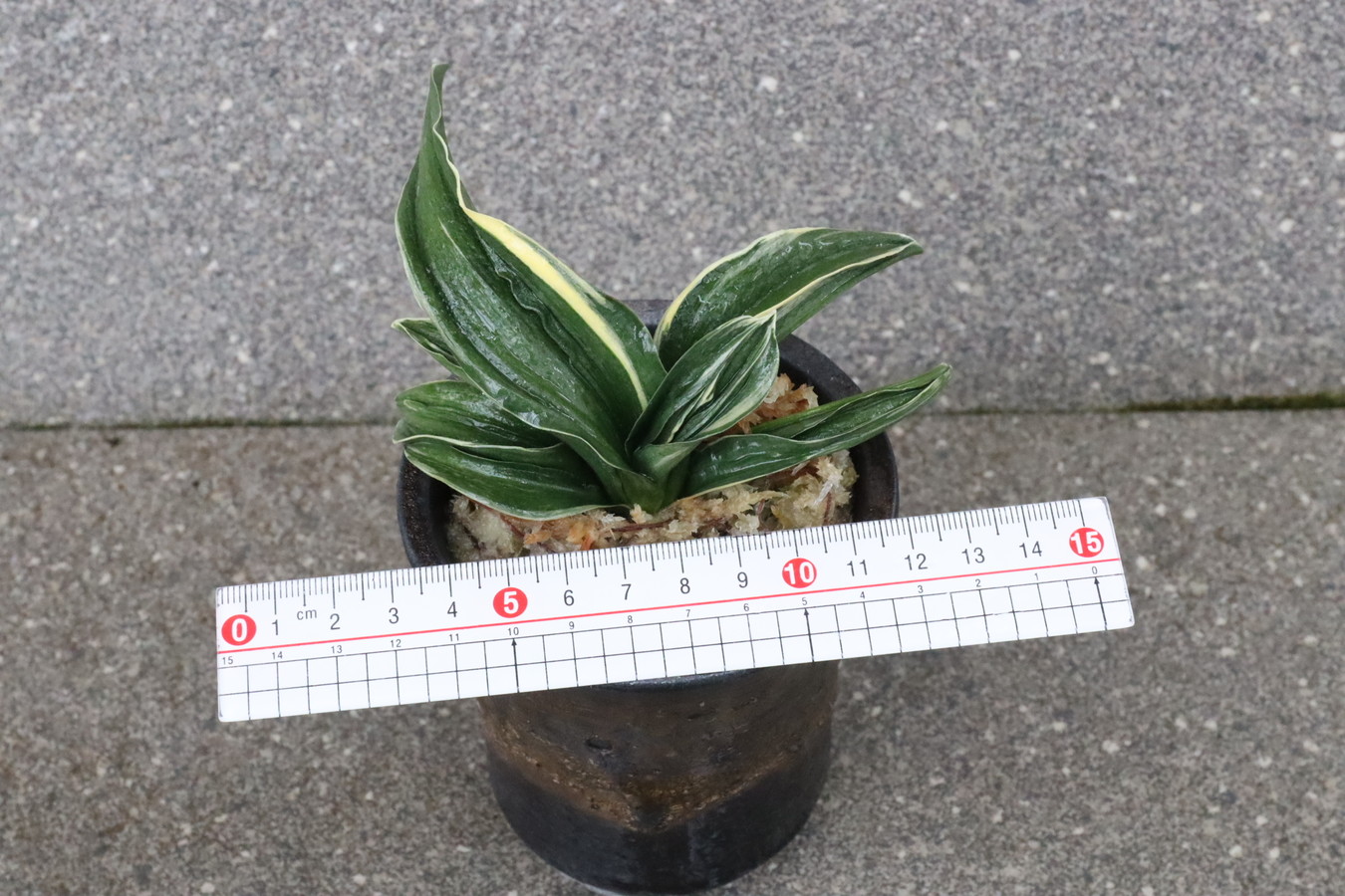 葉幅4㎝内外の中型種。濃紺緑色の硬めの板地の地合いに、いたって厚い葉肉で、葉幅の広いボリームがある特徴のため、判別しやすい品種。 深めの白覆輪をかけ、高い甲竜、二面竜、折熨斗、本剣、そしてたまに雅糸竜を現す。性質は強健で、採光、施肥ともに強め、培養し易い入門品種。