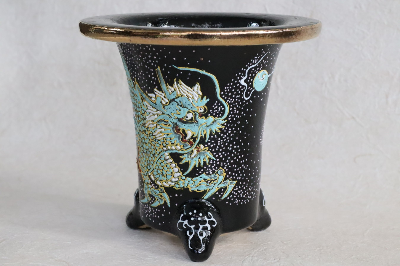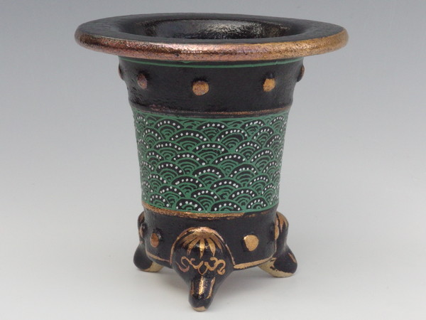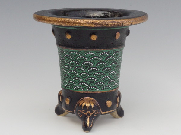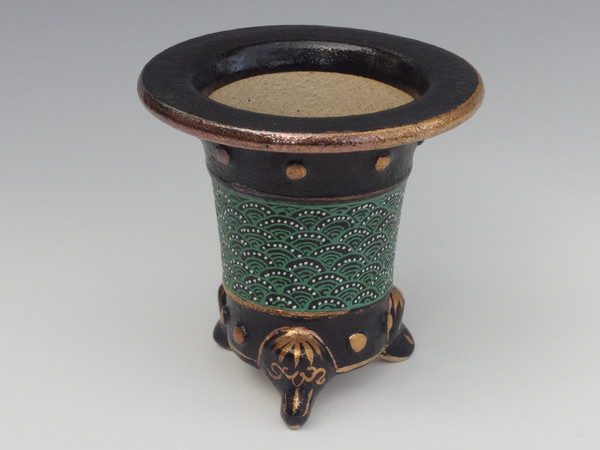 太鼓胴青海波鉢 絵付氏 一水作1点限り おもと鉢 万年青鉢 オモト鉢現在制作していません。希少性高い楽焼は天正年間(約400年前)に始まる日本独特の焼き物です。楽焼は《急熱急冷》という特殊な焼成方法をとります。急熱急冷だから、鉢に細かな 微細な穴ができ、通気を良くしていますおもと鉢作家 禅艸道 渡邉一水氏について