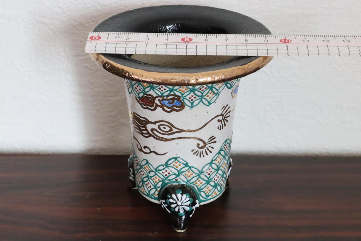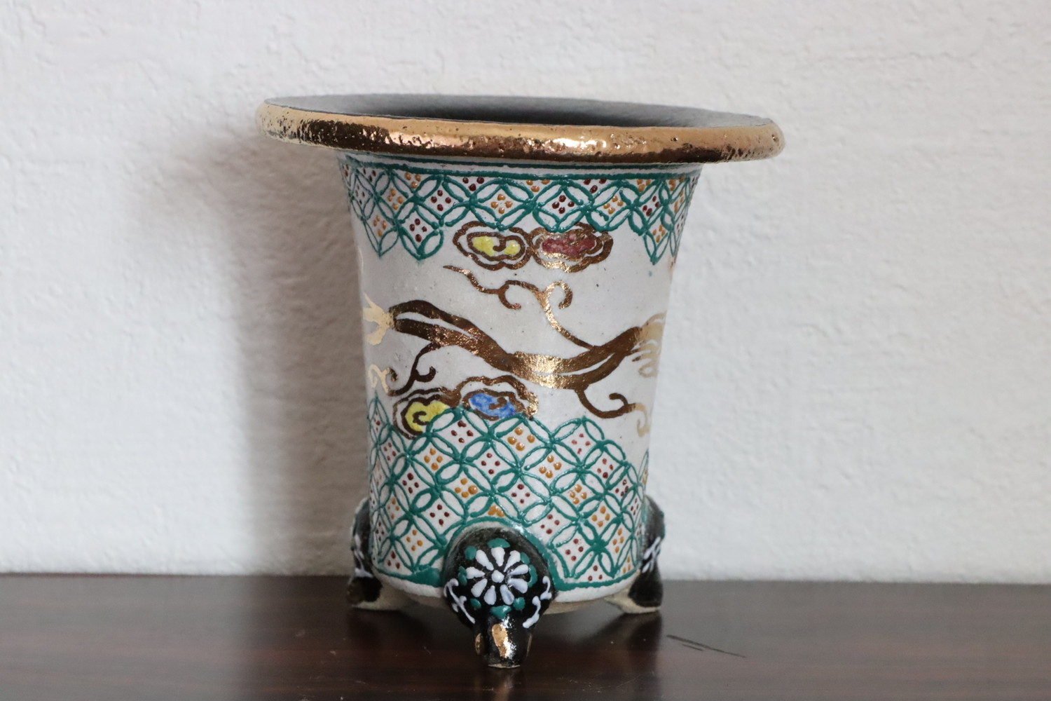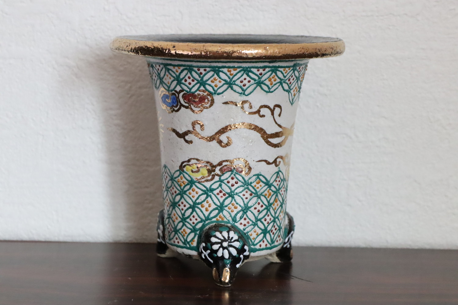 2042,白地七宝古代金竜 万年青楽鉢 外形約9.7cm 利山サイン