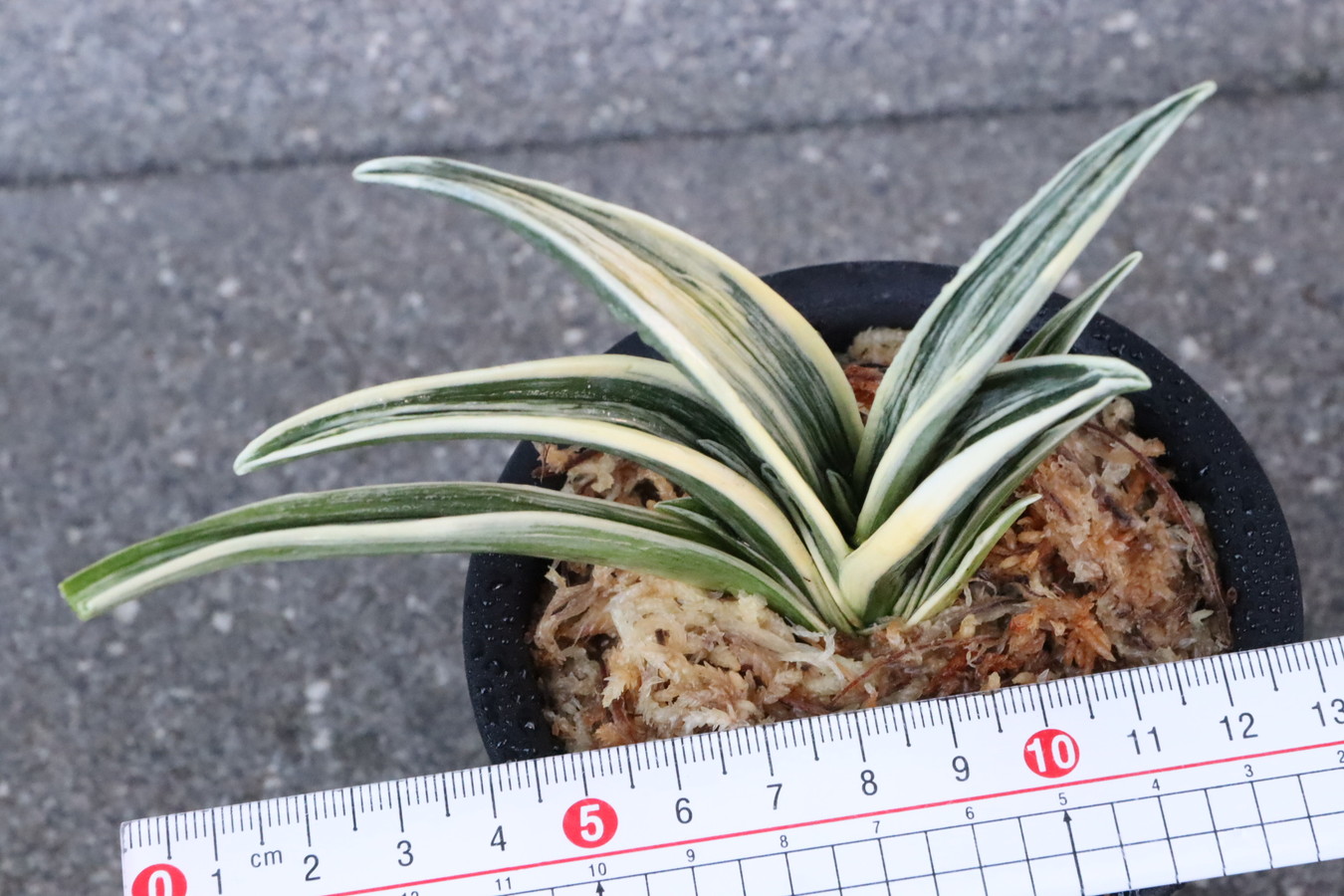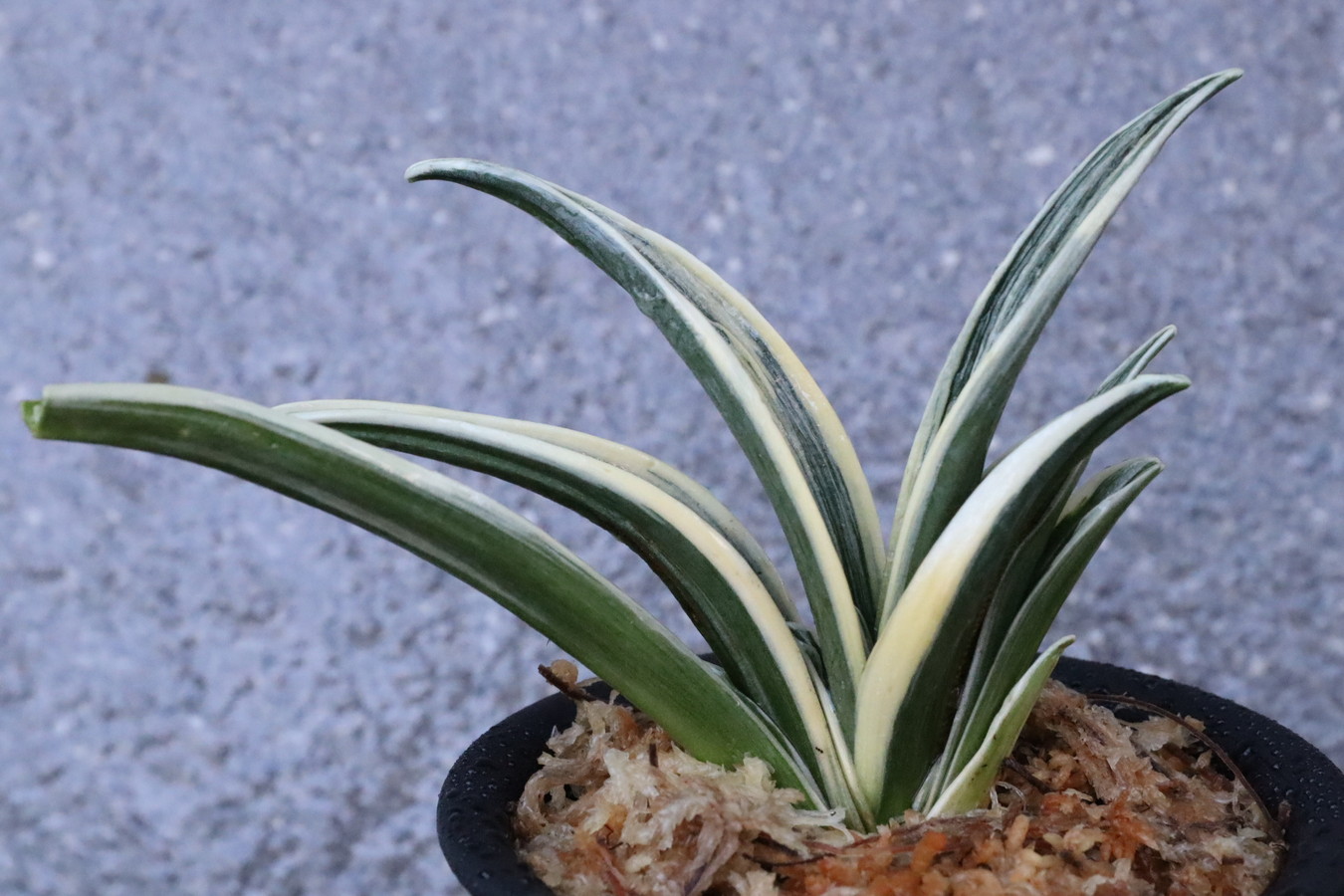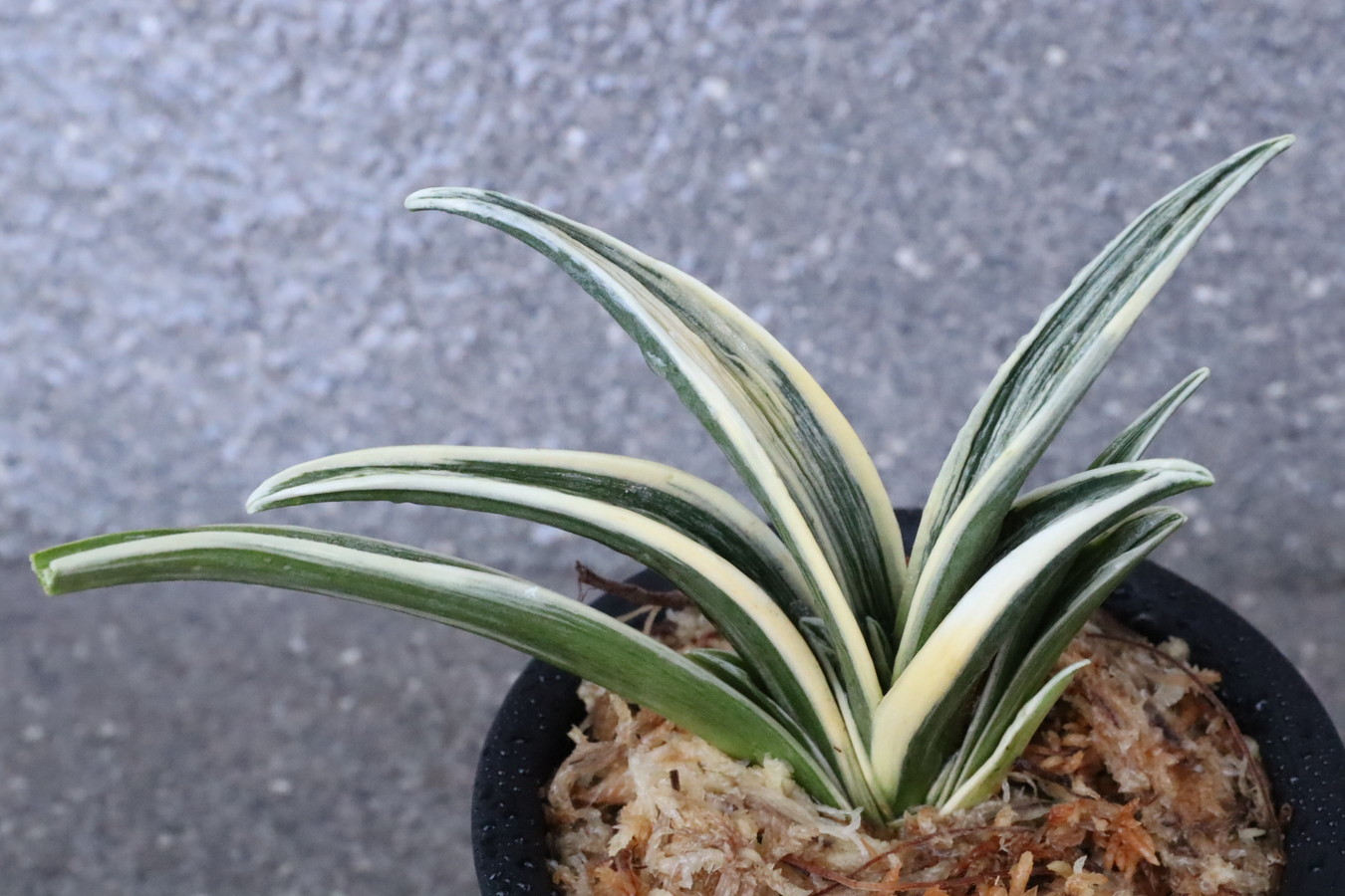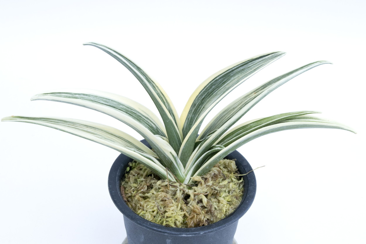 羅紗系のなかで大型種。縞甲竜系統「晃明殿」の実生。その魅力を存分に引き継ぎ、葉の中ほどでぐっと膨らみ、そこから葉先に向けて鋭くなる肉厚の葉。繊細で葉全体が輝く総雅糸竜をみせ、腰の張った重量感ある葉姿。全国の趣味者に名前を募集して命名された、稀代の銘品。