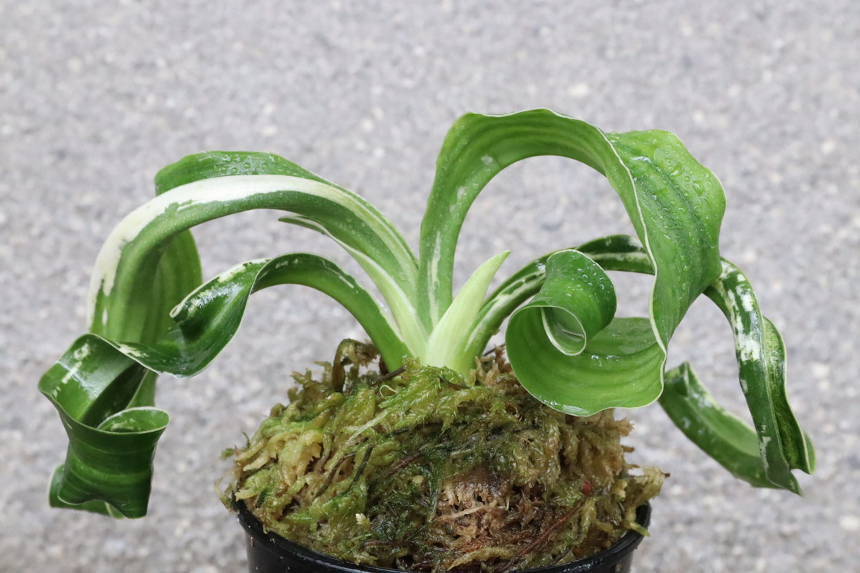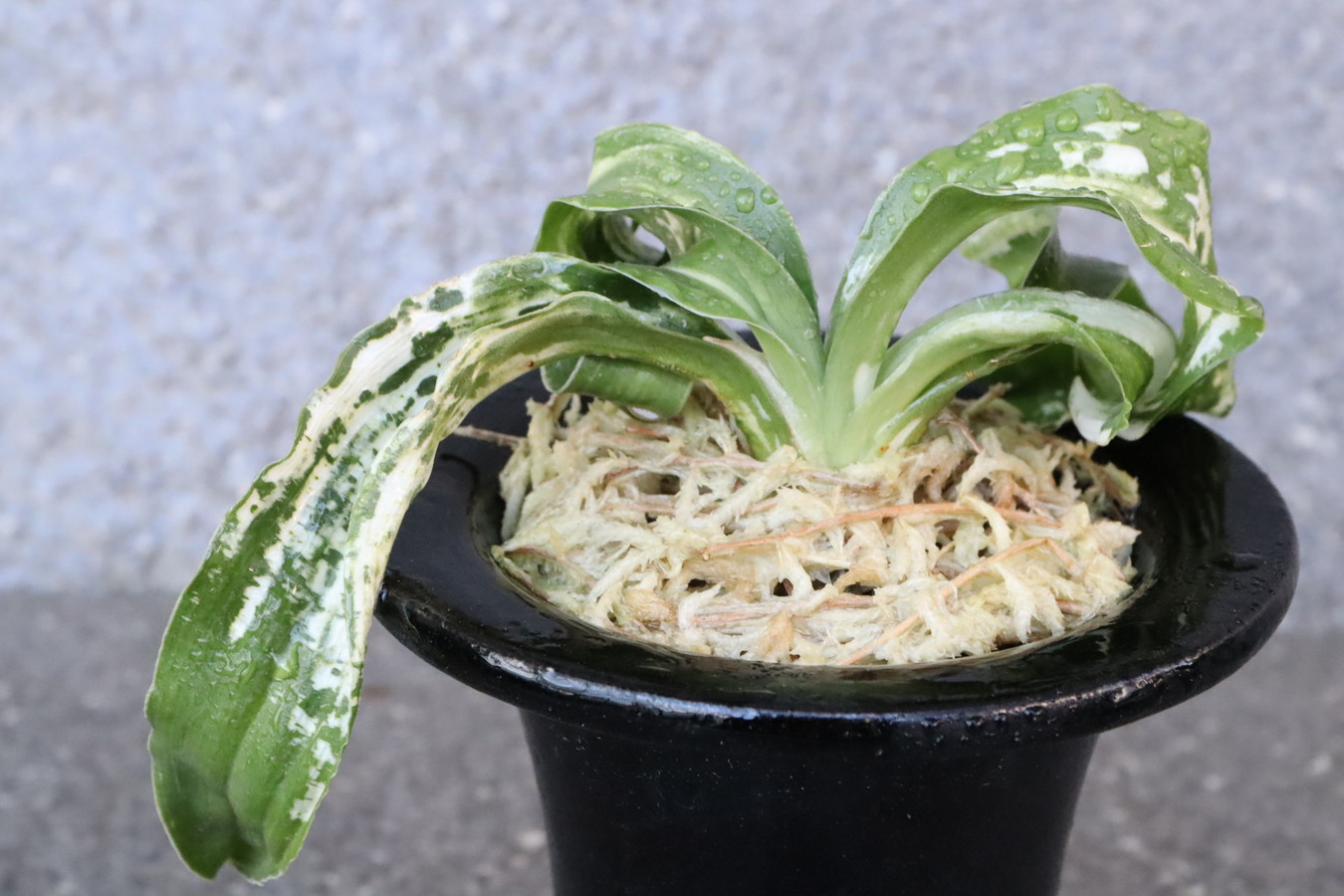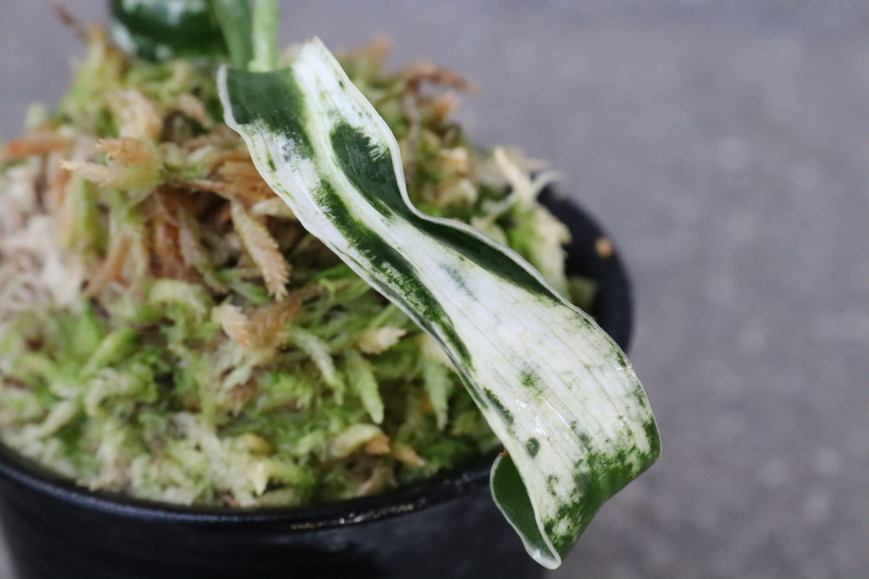 濃緑色の細葉に白い図柄を現します。葉は波を打ちながらカールします。