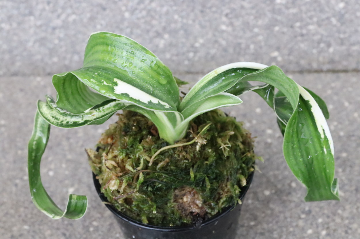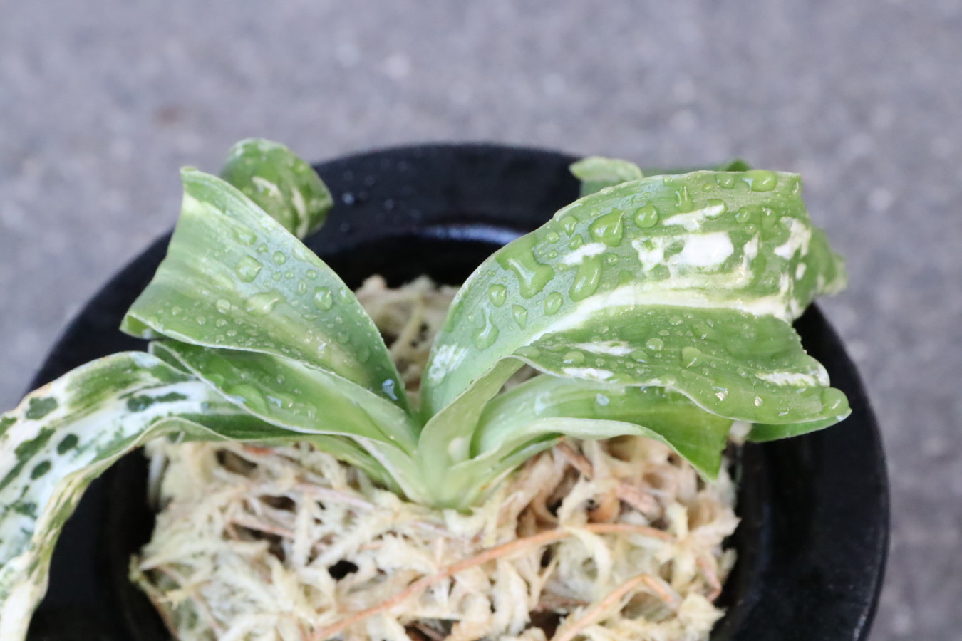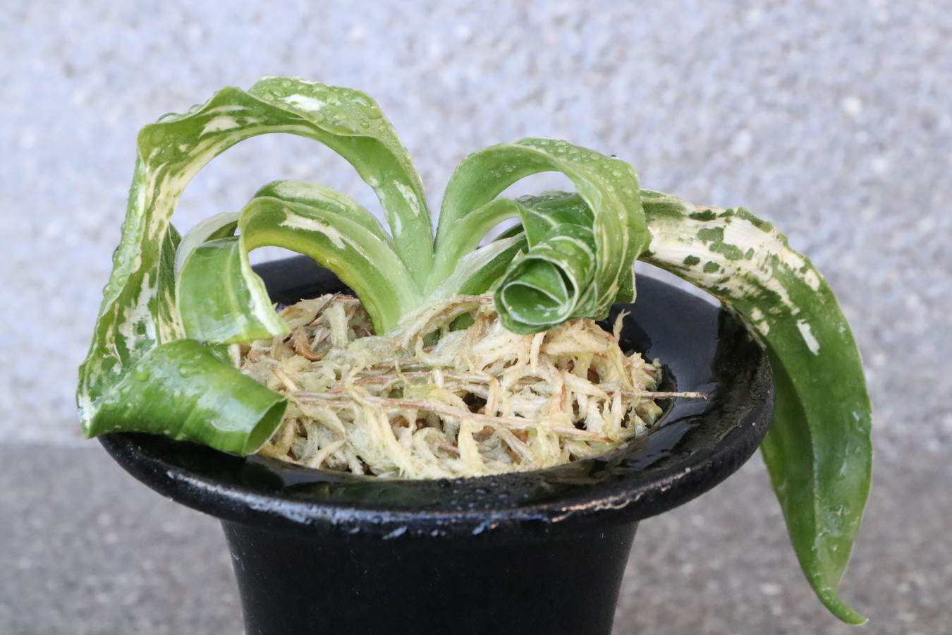 濃緑色の細葉に白い図柄を現します。葉は波を打ちながらカールします。