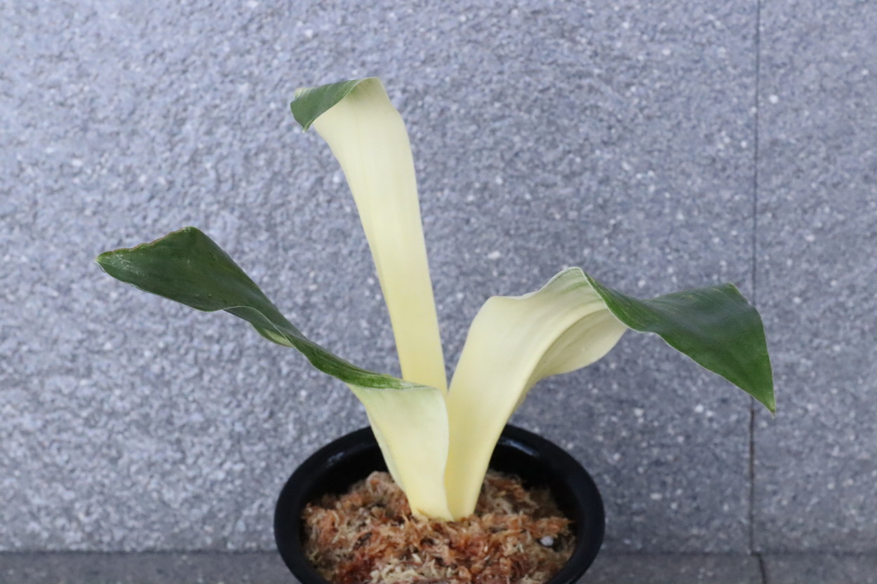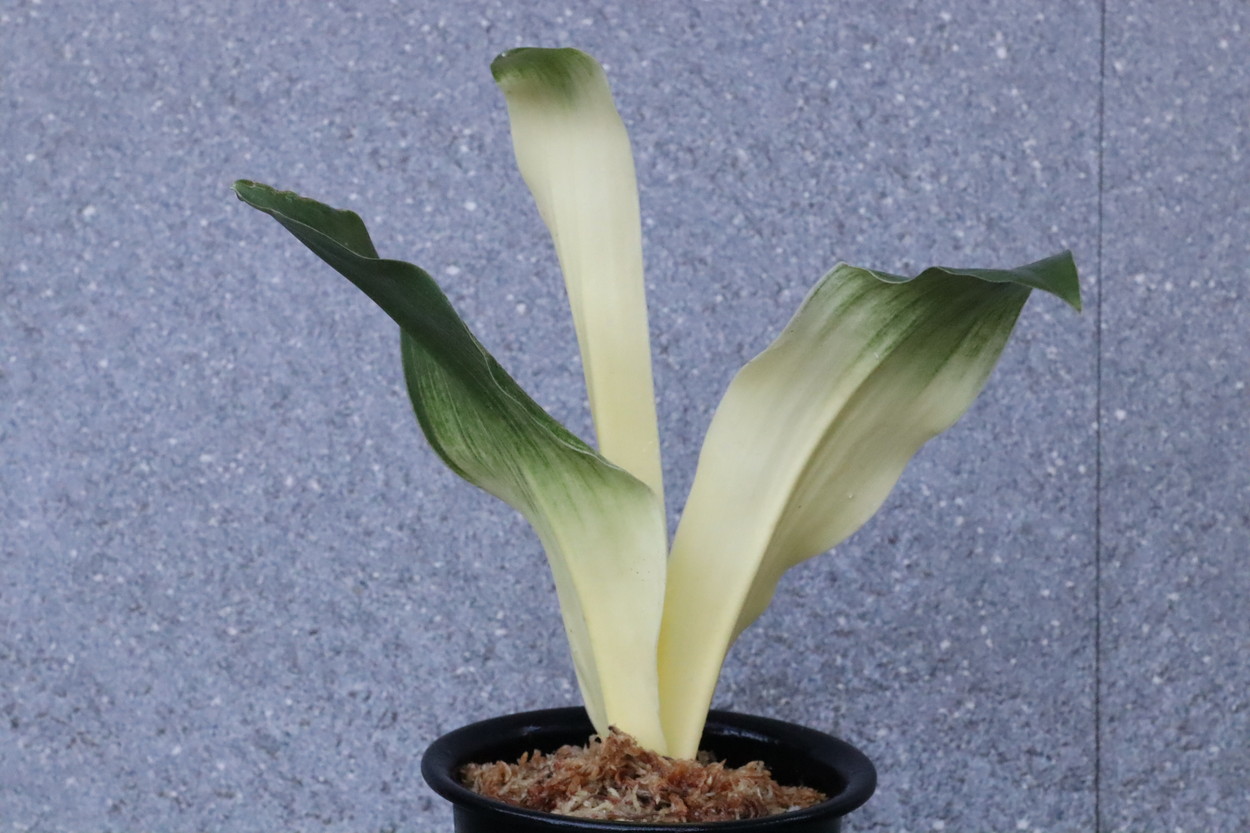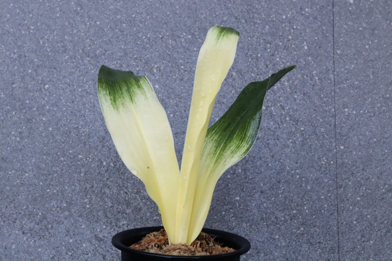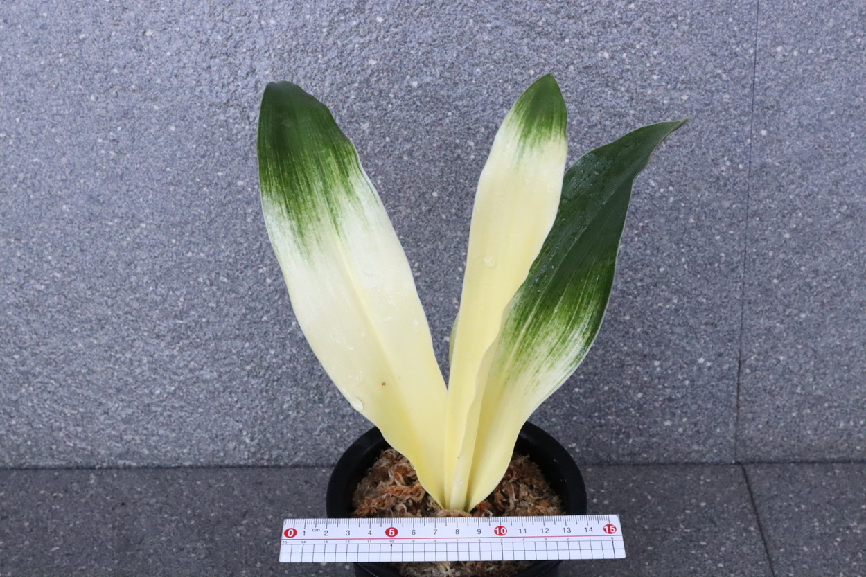 交換会で売りに出された2枚葉の実生を求め作る。葉幅が広く立ち葉性で紺性強く、その中に独特の卵黄色の美しい曙虎を現す。曙系品種は多種多様だが、その中でもひときわ目を見張る美しさがある。葉長40㎝、葉幅8㎝内外。性質はやや弱いところがあります。子上は大変良く、根出しも良い。肥料を控えめに与えれば栽培が容易な品種で4月~6月に十分日光に充てて作ることにより美しい曙虎を現す。美麗品。